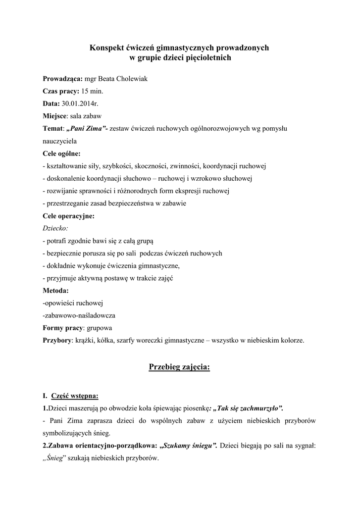 Konspekt ćwiczeń gimnastycznych prowadzonych w grupie dzieci pięcioletnich Prowadząca: mgr Beata Cholewiak Czas pracy: 15 min. Data: 30.01.2014r. Miejsce: sala zabaw Temat: „Pani Zima”- zestaw ćwiczeń ruchowych ogólnorozwojowych wg pomysłu nauczyciela Cele ogólne: - kształtowanie siły, szybkości, skoczności, zwinności, koordynacji ruchowej - doskonalenie koordynacji słuchowo – ruchowej i wzrokowo słuchowej - rozwijanie sprawności i różnorodnych form ekspresji ruchowej - przestrzeganie zasad bezpieczeństwa w zabawie Cele operacyjne: Dziecko: - potrafi zgodnie bawi się z całą grupą - bezpiecznie porusza się po sali podczas ćwiczeń ruchowych - dokładnie wykonuje ćwiczenia gimnastyczne, - przyjmuje aktywną postawę w trakcie zajęć Metoda: -opowieści ruchowej -zabawowo-naśladowcza Formy pracy: grupowa Przybory: krążki, kółka, szarfy woreczki gimnastyczne – wszystko w niebieskim kolorze. Przebieg zajęcia: I. Część wstępna: 1.Dzieci maszerują po obwodzie koła śpiewając piosenkę: „Tak się zachmurzyło”. - Pani Zima zaprasza dzieci do wspólnych zabaw z użyciem niebieskich przyborów symbolizujących śnieg. 2.Zabawa orientacyjno-porządkowa: „Szukamy śniegu”. Dzieci biegają po sali na sygnał: „Śnieg” szukają niebieskich przyborów. 3.Ćwiczenia dużych grup mięśniowych - „Pada śnieg” . Marsz po sali na sygnał: „Pada śnieg” każde dziecko podnosi niebieskie szarfy, krążki woreczki, kółka do góry i na dółskłony. II. Część właściwa: 1.Zabawa z elementem czworakowania – „Mieszkamy w igloo”. Dzieci rozkładają na dywanie przybory, czworakują na sygnał: „Powrót do igloo” dzieci wracają do swoich domków. 2.Zabawa z elementem rzutu: „Celujemy śnieżkami w drzewo”. Dzieci ustawiają się w rzędach i celują woreczkami do pudełek i kółkami na stojaki. 3.Ćwiczenia z elementem równowagi: „Śnieżna dróżka”. Szarfy ułożone na podłodze, dzieci przechodzą po szarfach. 4.Ćwiczenia dużych grup mięśniowych: „Zdejmujemy mokre ubrania”. Dzieci przechodzą przez szarfy. 5.Ćwiczenia z elementem toczenia: „Toczymy kule”. Dzieci toczą krążki i kółka po sali, układają bałwanki. III. Część końcowa: 1.„Zimowy krajobraz”- dzieci układają z niebieskich przyborów zimowy obrazek. 2.Śpiew piosenki: „Zima, zima, zima”.