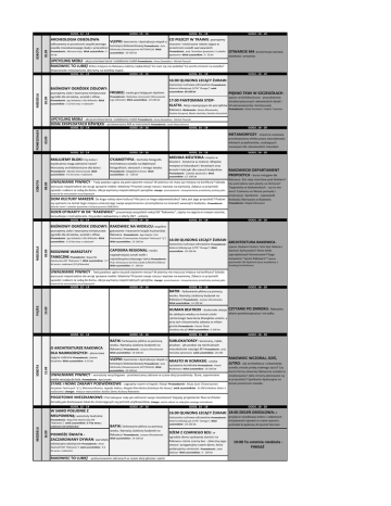 GODZ. 12 ‐ 14 ARCHEOLOGIA OSIEDLOWA: 01.09 SOBOTA odkrywamy w przestrzeni współczesnego GODZ. 14 ‐ 16 VLEPKI: tworzenie i dystrybucja vlepek o tematyce blokowiskowej Prowadzenie: Asia osiedla mieszkaniowego ślady z przeszłości Michnicka (Stowarzyszenie AKTYWACJA) Wiek Prowadzenie : Marzena Kęsy Wiek uczestników : 5 ‐ uczestników : 20‐100 lat 10 lat GODZ. 16 ‐ 18 GODZ. 18 ‐ 20 CO PISZCZY W TRAWIE: poznajemy straszne i niestraszne robale żyjące w przestrzeni osiedli warszawskich Prowadzenie : prof. Stanisław Ignatowicz i Ludwika Ignatowicz Wiek uczestników : 5‐ 10 lat OTWARCIE M4 ‐prezentacja wystaw, obiektów i artystów. UPCYCLING MEBLI ‐ akcja przetwarzania i ozdabiania mebli Prowadzenie: Anna Zawadzka i Michał Piasecki RAKOWIEC TO LUBIĘ! Które miejsca na Rakowcu lubimy najbardziej? Co nam się nie podoba? Co warto zmienić na osiedlu? Wypowiedzi mieszkańców zbieramy na wielkiej mapie. GODZ. 12 ‐ 14 GODZ. 14 ‐ 16 GODZ. 16 ‐ 18 GODZ. 18 ‐ 20 16:00 QUIGONG LECĄCY ŻURAW: ćwiczenia ruchowo‐zdrowotne Prowadzenie: 02.09 NIEDZIELA BAŚNIOWY OGRÓDEK ZIOŁOWY: poznajemy zioła i tworzymy miniaturowe ogródki dla skrzatów, wróżek i elfów. Prowadzenie : Iga Kołodziej i Ola Wiktorko Wiek uczestników : 3‐10 lat wraz z rodzicami FRISBEE: nauka gry latającym dyskiem Prowadzenie: Radosław Lenczewski (Warszawska Liga Ultimate) Wiek uczestników : 10‐100 lat Waleria Mikołajczyk (UTW "Omega") wiek uczestników: 20‐100 lat PIĘKNO TKWI W SZCZEGÓŁACH ‐ spacer architektoniczny ‐ poszukiwania 17:00 PANTOMIMA STOP‐ chrakterystycznych rakowieckich detali ‐ KLATKI. Akcja nawiązująca do początków ich pierwowzorów i kontynuacji. Rakowca. Wykonanie: Hanna Kłoszewska, Prowadzenie: Gosia Kuciewicz i Hubert Trammer Paulina Szczęsna, Marta Jasińska, Ewelina Grzechnik UPCYCLING MEBLI ‐ akcja przetwarzania i ozdabiania mebli Prowadzenie: Anna Zawadzka i Michał Piasecki DZIAŁ EKSPLOATACJI DŹWIĘKU ‐ przetwarzamy M4 w instrument Prowadzenie: Jacek Mazurkiewicz GODZ. 14 ‐ 16 08.09 GODZ. 18 ‐ 20 METAMORFOZY ‐ otwarcie wystawy: przedstawiamy efekty pracy warsztatowej młodych projektantów, szukających rozwiązań dla rakowieckich mieszkań. GODZ. 12 ‐ 14 SOBOTA GODZ. 16 ‐ 18 03.09 PONIEDZIAŁEK GODZ. 12 ‐ 14 GODZ. 14 ‐ 16 MALUJEMY BLOKI: Czy kolor i CYJANOTYPIA ‐ technika fotografii. wyobraźnia mogą odmienić świat? Warsztaty architektoniczne dla dzieci. Architektura osiedla na błękitnych fotografiach, obrazach z innego świata. Prowadzenie : Monika Komorowska Wiek uczestników: 4‐6 lat wraz z rodzicami Prowadzenie: Magdalena Korzec Wiek uczestników: 15 ‐ 100 lat GODZ. 16 ‐ 18 GODZ. 18 ‐ 20 MIEJSKA BIŻUTERIA: miasto w biżuterii ‐ biżuteria w mieście. Miejskie motywy w kolczykach i broszkach oraz broszki i kolczyki dla szarych budynków. Prowadzenie: Ludwika Ignatowicz Wiek uczestników : 15 ‐100 lat RAKOWIECKI DEPARTAMENT PROPOZYCJI ‐ burza mózgów dla Rakowca. Kto sieje marchew pod blokiem? Czy potrzebne nam planty na Ochocie? wyrzucać niepotrzebne ale wciąż sprawne meble i bibeloty? Przynieś swoje rzeczy i wystaw na wymianę. Zobacz co przynieśli Targowiska w blokowiskach ‐ czy to ma sąsiedzi i zabierz ze sobą do domu. Akcja wymiany niepotrzebnych sprzętów. Uwaga: pozostawione i niewymienione przedmioty posłużą jako sens? Czekamy na Wasze pomysły i materiał do warsztatów recyclingowych. propozycje. Spotkanie ‐ zapowiedź DOM KULTURY MARZEŃ: Do kogo należy dom kultury? Kto jest za niego odpowiedzialny? Jaka jest jego przyszłość? Podziel festiwalu Warszawa w Budowie. Prowadzenie: Magda Mosiewicz się opiniami na temat tego miejsca umieszczając swoje wspomnienia i przemyślenia na ścianach wewnątrz budynku. Prowadzenie : UWALNIANIE PIWNICY ‐ Twój pawlacz ugina się pod ciężarem rzeczy? W piwnicy nie masz już miejsca na konfitury? Szkoda Monika Sznel i Ludwika Ignatowicz Stowarzyszenie ODBLOKUJ DZIEŃ OTWARTY W DK "RAKOWIEC": prezentacja wszystkich sekcji DK "Rakowiec", zapisy na zajęcia w nowym sezonie, konsultacje z instruktorami. Czy jesteś zadowolony z oferty DK? ‐ ankieta GODZ. 12 ‐ 14 GODZ. 14 ‐ 16 GODZ. 16 ‐ 18 GODZ. 18 ‐ 20 09.09 NIEDZIELA BAŚNIOWY OGRÓDEK ZIOŁOWY: RAKOWIEC NA WIDELCU: wspólne poznajemy zioła i tworzymy miniaturowe ogródki dla skrzatów, wróżek i elfów. gotowanie i tworzenie książki kucharskiej Rakowca Prowadzenie: Aga Gójska i Emi Prowadzenie : Iga Kołodziej i Ola Wiktorko Wiek uczestników : 3‐10 lat wraz z rodzicami Piotrowska (Towarzystwo Inicjatyw Twórczych "ę") Wiek uczestników: 15‐100 lat 16:00 QUIGONG LECĄCY ŻURAW: CAPOEIRA REGIONAL: nauka Waleria Mikołajczyk (UTW "Omega") Wiek uczestników : 20‐100 lat RODZINNE WARSZTATY TANECZNE Prowadzenie: Bogumiła ćwiczenia ruchowo‐zdrowotne Prowadzenie: najpiękniejszej sztuki walki i najniebezpieczniejszego tańca Prowadzenie: Stachurska (DK "Rakowiec") Wiek uczestników: 3‐7 Prof. Dinossauro lub Asia Latała (UNICAR Żoliborz) lat wraz z rodzicami (10 zł/dziecko) Wiek uczestników : 0 ‐ 100 lat ARCHITEKTURA RAKOWCA ‐ spacer śladami historii. Kim byli Helena i Szymon Syrkusowie? Które bloki zaprojektowali Hansenowie? Kogo nazywano "ojcem Rakowca"? Spacer poprowadzi Ola Kędziorek (przy współpracy z Fundacją Architektury) UWALNIANIE PIWNICY ‐ Twój pawlacz ugina się pod ciężarem rzeczy? W piwnicy nie masz już miejsca na konfitury? Szkoda wyrzucać niepotrzebne ale wciąż sprawne meble i bibeloty? Przynieś swoje rzeczy i wystaw na wymianę. Zobacz co przynieśli sąsiedzi i zabierz ze sobą do domu. Akcja wymiany niepotrzebnych sprzętów. Uwaga: pozostawione i niewymienione przedmioty posłużą jako materiał do warsztatów recyclingowych. GODZ. 12 ‐ 14 GODZ. 14 ‐ 16 GODZ. 16 ‐ 18 GODZ. 18 ‐ 20 BATIK ‐ farbowanie płótna za pomocą wosku. Namaluj ulubiony budynek na 14.09 PIĄTEK Rakowcu! Prowadzenie: Justyna Wesołowska W