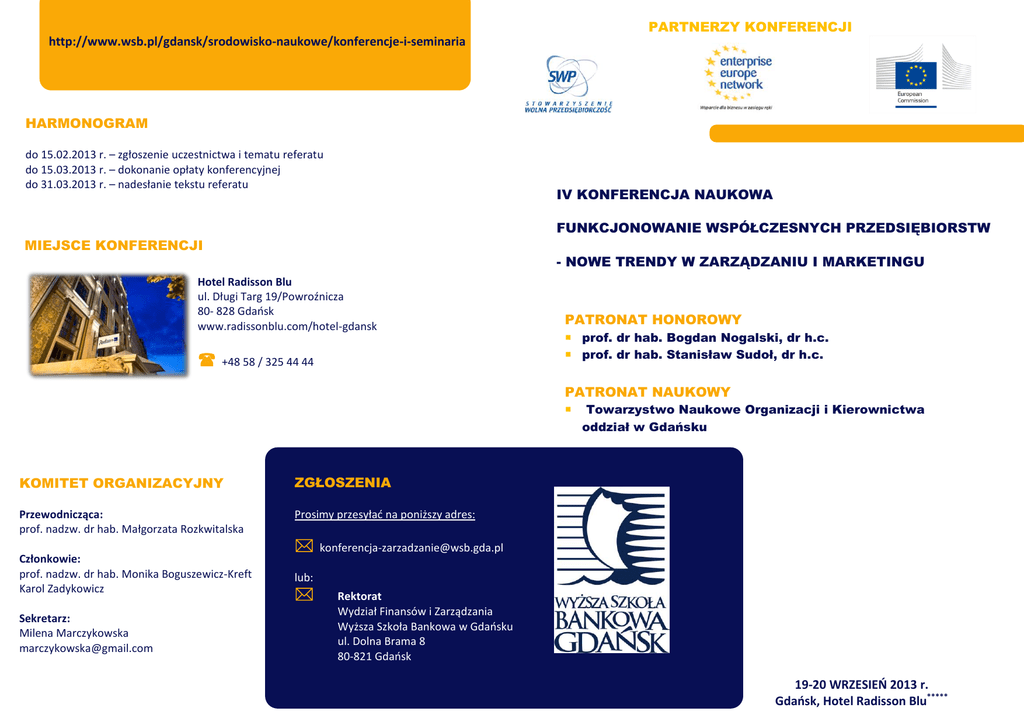 PARTNERZY KONFERENCJI http://www.wsb.pl/gdansk/srodowisko-naukowe/konferencje-i-seminaria HARMONOGRAM do 15.02.2013 r. – zgłoszenie uczestnictwa i tematu referatu do 15.03.2013 r. – dokonanie opłaty konferencyjnej do 31.03.2013 r. – nadesłanie tekstu referatu IV KONFERENCJA NAUKOWA FUNKCJONOWANIE WSPÓŁCZESNYCH PRZEDSIĘBIORSTW MIEJSCE KONFERENCJI - NOWE TRENDY W ZARZĄDZANIU I MARKETINGU Hotel Radisson Blu ul. Długi Targ 19/Powroźnicza 80- 828 Gdańsk www.radissonblu.com/hotel-gdansk +48 58 / 325 44 44 PATRONAT HONOROWY prof. dr hab. Bogdan Nogalski, dr h.c. prof. dr hab. Stanisław Sudoł, dr h.c. PATRONAT NAUKOWY KOMITET ORGANIZACYJNY ZGŁOSZENIA Przewodnicząca: prof. nadzw. dr hab. Małgorzata Rozkwitalska Prosimy przesyłać na poniższy adres: Członkowie: prof. nadzw. dr hab. Monika Boguszewicz-Kreft Karol Zadykowicz Sekretarz: Milena Marczykowska [email protected] Towarzystwo Naukowe Organizacji i Kierownictwa oddział w Gdańsku [email protected] lub: Rektorat Wydział Finansów i Zarządzania Wyższa Szkoła Bankowa w Gdańsku ul. Dolna Brama 8 80-821 Gdańsk 19-20 WRZESIEŃ 2013 r. Gdańsk, Hotel Radisson Blu***** RADA NAUKOWA Przewodnicząca: prof. nadzw. dr hab. Monika Boguszewicz-Kreft Wyższa Szkoła Bankowa w Gdańsku Członkowie: prof. dr hab. Małgorzata Czerska Uniwersytet Gdański prof. nadzw. dr hab. Dariusz Dąbrowski Politechnika Gdańska dr hab. Łukasz Gaweł Uniwersytet Jagielloński prof. nadzw. dr hab. Beata Glinka Uniwersytet Warszawski prof. nadzw. dr hab. Aldona Glińska-Neweś Uniwersytet Mikołaja Kopernika w Toruniu prof. nadzw. dr hab. Mirosław Haffer Wyższa Szkoła Bankowa w Gdańsku prof. nadzw. dr hab. Alina Hyż 0o Technological Educational Institute of Epirus prof. nadzw. dr hab. Zoya Kayira Donetsk State University of Management prof. dr hab. Monika Kostera Uniwersytet Warszawski prof. dr Sławomir Magala Rotterdam School of Management prof. nadzw. dr hab. Wojciech Popławski Otoczenie współczesnych przedsiębiorstw i one same podlegają ciągłym zmianom. Pojawiają się nowe wyzwania, które wymagają gruntownego poznania ich istoty i nowych sposobów działania. Skłaniają środowisko naukowe do podejmowania tematów badawczych a praktyków do wdrażania nowych koncepcji i reagowania na pojawiające się zmiany. W związku z tym pragniemy Państwa bardzo serdecznie zaprosić do podzielenia się wynikami prowadzonych badań podczas organizowanej przez nas konferencji, której motywem przewodnim są nowe trendy w zarządzaniu i marketingu. Zaproszenie to kierujemy do pracowników nauki i praktyków. Mamy nadzieję, że konferencja przyczyni się do wymiany poglądów i wyników badań skłaniających do dalszych inspirujących poszukiwań, usprawniających funkcjonowanie współczesnych przedsiębiorstw. Konferencji towarzyszyć będzie Forum Praktyków – Panel Ekspertów realizowany we współpracy z partnerem konferencji: Stowarzyszeniem Wolna Przedsiębiorczość. Wyższa Szkoła Bankowa w Toruniu prof. dr hab. Maria Romanowska Szkoła Główna Handlowa w Warszawie OBSZARY TEMATYCZNE prof. nadzw. dr hab. Edyta Rudawska Uniwersytet Szczeciński prof. nadzw. dr hab. Dorota Simpson Uniwersytet Gdański prof. nadzw. dr hab. Marzena Stor Uniwersytet Ekonomiczny we Wrocławiu prof. dr hab. Łukasz Sułkowski Uniwersytet Jagielloński prof. nadzw. dr hab. Stefan Tokarski Wyższa Szkoła Bankowa w Gdańsku prof. dr hab. Czesław Zając Uniwersytet Ekonomiczny we Wrocławiu wielokulturowość i różnorodność w zarządzaniu organizacją i zasobami ludzkimi kultura organizacji nowe koncepcje zarządzania marketing doświadczeń, marketing relacji, zarządzanie marketingowe etyka i społeczna odpowiedzialność biznesu otoczenie przedsiębiorstw, strategie rozwoju przedsiębiorczość CELE KONFERENCJI utrzymanie forum wymiany praktycznej i teoretycznej wiedzy ekonomicznej wymiana wyników badań w obszarach tematyki konferencji budowanie partnerskich relacji między uczelniami konsolidacja środowisk naukowych REFERATY Teksty referatów w języku polskim lub angielskim (do 15 stron) wraz ze streszczeniem w języku polskim i angielskim oraz krótką informacją o autorze prosimy przesyłać pocztą elektroniczną na adres e-mail: [email protected] w terminie do dnia 31 marca 2013 r. BARDZO PROSIMY O UWZGLĘDNIENIE W NADESŁANYM TEKŚCIE ZASAD JEGO PRZYGOTOWANIA. Wymogi edytorskie, karta zgłoszeniowa oraz oświadczenie autora dostępne są na stronie internetowej konferencji: http://www.wsb.pl/gdansk/srodowisko- naukowe/konferencje-i-seminaria KOSZT UDZIAŁU W KONFERENCJI Opłata konferencyjna obejmuje: wydawnictwo – Prace Naukowe WSB w Gdańsku (4 pkt KBN) uczestnictwo w programie merytorycznym konferencji przerwy kawowe lunch uczestnictwo w uroczystej kolacji Opcja Uczestnictwo pełne Uczestnictwo bez publikacji Publikacja bez udziału w konferencji Dopłata za dodatkową stronę referatu (pow. 15 stron) Koszt 890 PLN 590 PLN 600 PLN 30 PLN ZAKWATEROWANIE: Proponujemy Państwu zakwaterowanie w następujących hotelach w Gdańsku w promocyjnych cenach (przy rezerwacji prosimy podać hasło „Wyższa Szkoła Bankowa”): Hotel Radisson Blu, ul. Długi Targ 19/Powroźnicza lub Hotel Dom Muzyka, ul. Łąkowa 1/2 (10 minut pieszo do miejsca konferencji) Po przesłaniu karty zgłoszenia uczestnictwa prosimy dokonać wpłaty na poniższy rachunek bankowy: Wyższa Szkoła Bankowa w Gdańsku, ul. Dolna Brama 8, 80-821 Gdańsk Kredyt Bank II O/Gdańsk nr rachunku: 66 1500 1171 1211 7001 8975 0000 z dopiskiem „Konferencja – przedsiębiorstwo – Imię i Nazwisko uczestnika”