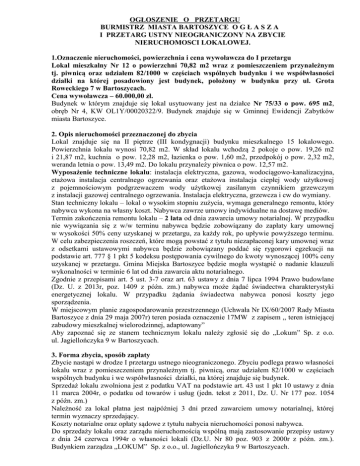 OGŁOSZENIE O PRZETARGU BURMISTRZ MIASTA BARTOSZYCE O G Ł A S Z A I PRZETARG USTNY NIEOGRANICZONY NA ZBYCIE NIERUCHOMOSCI LOKALOWEJ. 1.Oznaczenie nieruchomości, powierzchnia i cena wywoławcza do I przetargu Lokal mieszkalny Nr 12 o powierzchni 70,82 m2 wraz z pomieszczeniem przynależnym tj. piwnicą oraz udziałem 82/1000 w częściach wspólnych budynku i we współwłasności działki na której posadowiony jest budynek, położony w budynku przy ul. Grota Roweckiego 7 w Bartoszycach. Cena wywoławcza – 60.000,00 zł. Budynek w którym znajduje się lokal usytuowany jest na działce Nr 75/33 o pow. 695 m2, obręb Nr 4, KW OL1Y/00020322/9. Budynek znajduje się w Gminnej Ewidencji Zabytków miasta Bartoszyce. 2. Opis nieruchomości przeznaczonej do zbycia Lokal znajduje się na II piętrze (III kondygnacji) budynku mieszkalnego 15 lokalowego. Powierzchnia lokalu wynosi 70,82 m2. W skład lokalu wchodzą 2 pokoje o pow. 19,26 m2 i 21,87 m2, kuchnia o pow. 12,28 m2, łazienka o pow. 1,60 m2, przedpokój o pow. 2,32 m2, weranda letnia o pow. 13,49 m2. Do lokalu przynależy piwnica o pow. 12,57 m2. Wyposażenie techniczne lokalu: instalacja elektryczna, gazowa, wodociągowo-kanalizacyjna, etażowa instalacja centralnego ogrzewania oraz etażowa instalacja ciepłej wody użytkowej z pojemnościowym podgrzewaczem wody użytkowej zasilanym czynnikiem grzewczym z instalacji gazowej centralnego ogrzewania. Instalacja elektryczna, grzewcza i cw do wymiany. Stan techniczny lokalu – lokal o wysokim stopniu zużycia, wymaga generalnego remontu, który nabywca wykona na własny koszt. Nabywca zawrze umowy indywidualne na dostawę mediów. Termin zakończenia remontu lokalu – 2 lata od dnia zawarcia umowy notarialnej. W przypadku nie wywiązania się z w/w terminu nabywca będzie zobowiązany do zapłaty kary umownej w wysokości 50% ceny uzyskanej w przetargu, za każdy rok, po upływie powyższego terminu. W celu zabezpieczenia roszczeń, które mogą powstać z tytułu niezapłaconej kary umownej wraz z odsetkami ustawowymi nabywca będzie zobowiązany poddać się rygorowi egzekucji na podstawie art. 777 § 1 pkt 5 kodeksu postępowania cywilnego do kwoty wynoszącej 100% ceny uzyskanej w przetargu. Gmina Miejska Bartoszyce będzie mogła wystąpić o nadanie klauzuli wykonalności w terminie 6 lat od dnia zawarcia aktu notarialnego. Zgodnie z przepisami art. 5 ust. 3-7 oraz art. 63 ustawy z dnia 7 lipca 1994 Prawo budowlane (Dz. U. z 2013r, poz. 1409 z późn. zm.) nabywca może żądać świadectwa charakterystyki energetycznej lokalu. W przypadku żądania świadectwa nabywca ponosi koszty jego sporządzenia. W miejscowym planie zagospodarowania przestrzennego (Uchwała Nr IX/60/2007 Rady Miasta Bartoszyce z dnia 29 maja 2007r) teren posiada oznaczenie 17MW z zapisem ,, teren istniejącej zabudowy mieszkalnej wielorodzinnej, adaptowany” Aby zapoznać się ze stanem technicznym lokalu należy zgłosić się do „Lokum” Sp. z o.o. ul. Jagiellończyka 9 w Bartoszycach. 3. Forma zbycia, sposób zapłaty Zbycie nastąpi w drodze I przetargu ustnego nieograniczonego. Zbyciu podlega prawo własności lokalu wraz z pomieszczeniem przynależnym tj. piwnicą, oraz udziałem 82/1000 w częściach wspólnych budynku i we współwłasności działki, na której znajduje się budynek. Sprzedaż lokalu zwolniona jest z podatku VAT na podstawie art. 43 ust 1 pkt 10 ustawy z dnia 11 marca 2004r, o podatku od towarów i usług (jedn. tekst z 2011, Dz. U. Nr 177 poz. 1054 z późn. zm.) Należność za lokal płatna jest najpóźniej 3 dni przed zawarciem umowy notarialnej, której termin wyznaczy sprzedający. Koszty notarialne oraz opłaty sądowe z tytułu nabycia nieruchomości ponosi nabywca. Do sprzedaży lokalu oraz zarządu nieruchomością wspólną mają zastosowanie przepisy ustawy z dnia 24 czerwca 1994r o własności lokali (Dz.U. Nr 80 poz. 903 z 2000r z późn. zm.). Budynkiem zarządza „LOKUM” Sp. z o.o., ul. Jagiellończyka 9 w Bartoszycach. 4. Informacje dodatkowe Przetarg odbędzie się dnia 22 stycznia 2015r o godz. 900 w pok. Nr 9 Urzędu Miasta (Urząd Stanu Cywilnego).Osoby przystępujące do przetargu winny wpłacić wadium w pieniądzu w wys.10.000,- zł do dnia 16 stycznia 2015r na konto Urzędu Miasta Bank Millennium S.A. O/Bartoszyce Nr 70 1160 2202 00000000 6190 9697. Za termin wniesienia wadium uważa się dzień jego wpływu na w/w rachunek. Wadium wpłacone przez uczestnika, który przetarg wygrał, zalicza się na poczet ceny nabycia. Jeżeli osoba ustalona jako nabywca nieruchomości nie przystąpi bez usprawiedliwienia do zawarcia umowy w miejscu i terminie wyznaczonym przez sprzedającego, organizator przetargu może odstąpić od zawarcia umowy, a wpłacone wadium nie podlega zwrotowi. Przed otwarciem przetargu należy okazać komisji przetargowej dowód wpłaty wadium, dowód tożsamości osoby obecnej na przetargu, aktualny dokument potwierdzający prowadzenie działalności gospodarczej lub aktualny odpis z właściwego rejestru, stosowne pełnomocnictwa. W przypadku nabycia nieruchomości do majątku objętego wspólnością ustawową (małżeństwo) konieczna jest obecność na przetargu obojga małżonków W przypadku nieobecności na przetargu jednego z małżonków konieczne jest przedłożenie dokumentów określonych w Regulaminie Przetargu. Nikt nie skorzystał z prawa pierwszeństwa w nabyciu nieruchomości przysługującego na podstawie art. 34 ustawy z dnia 21 sierpnia 1997r o gospodarce nieruchomościami (jedn. tekst Dz.U. z 2014r poz. 518 z późn. zm) Nieruchomość objęta przetargiem nie posiada obciążeń ani nie jest przedmiotem zobowiązań. Zastrzega się prawo odwołania przetargu z uzasadnionej przyczyny. Osoby przystępujące do przetargu winny zapoznać się z Regulaminem Przetargu. Szczegółowe informacje na temat przetargu oraz Regulamin Przetargu można uzyskać w Wydziale Gospodarowania Mieniem i Planowania Przestrzennego Urz