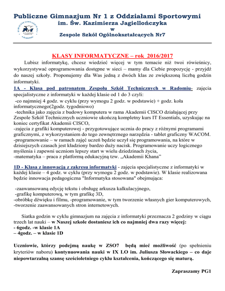 Publiczne Gimnazjum Nr 1 z Oddziałami Sportowymi im. Św. Kazimierza Jagiellończyka w Zespole Szkół Ogólnokształcących Nr7 KLASY INFORMATYCZNE – rok 2016/2017 Lubisz informatykę, chcesz wiedzieć więcej w tym temacie niż twoi rówieśnicy, wykorzystywać oprogramowania dostępne w sieci – mamy dla Ciebie propozycję - przyjdź do naszej szkoły. Proponujemy dla Was jedną z dwóch klas ze zwiększoną liczbą godzin informatyki. 1A - Klasa pod patronatem Zespołu Szkół Technicznych w Radomiu- zajęcia specjalistyczne z informatyki w każdej klasie od 1 do 3 czyli: -co najmniej 4 godz. w cyklu (przy wymogu 2 godz. w podstawie) + godz. koła informatycznego(2godz. tygodniowo) -technika jako zajęcia z budowy komputera w rama Akademii CISCO działającej przy Zespole Szkół Technicznych uczniowie ukończą kompletny kurs IT Essentials, uzyskując na koniec certyfikat Akademii CISCO, -zajęcia z grafiki komputerowej - przygotowujące ucznia do pracy z różnymi programami graficznymi, z wykorzystaniem do tego zewnętrznego narzędzia - tablet graficzny WACOM. -programowanie – w ramach zajęć uczeń będzie uczył się programowania, na które w dzisiejszych czasach jest kładziony bardzo duży nacisk. Programowanie uczy logicznego myślenia i zapewni uczniom lepszy start w wielu dziedzinach życia, -matematyka – praca z platformą edukacyjną tzw. „Akademii Khana” 1D - Klasa z innowacją z zakresu informatyki - zajęcia specjalistyczne z informatyki w każdej klasie – 4 godz. w cyklu (przy wymogu 2 godz. w podstawie). W klasie realizowana będzie innowacja pedagogiczna "Informatyka stosowana" obejmująca: -zaawansowaną edycję tekstu i obsługę arkusza kalkulacyjnego, -grafikę komputerową, w tym grafikę 3D, -obróbkę dźwięku i filmu, -programowanie, w tym tworzenie własnych gier komputerowych, -tworzenie zaawansowanych stron internetowych. Siatka godzin w cyklu gimnazjum na zajęcia z informatyki przeznacza 2 godziny w ciągu trzech lat nauki – w Naszej szkole dostaniesz ich co najmniej dwa razy więcej: - 6godz. -w klasie 1A – 4godz. – w klasie 1D Uczniowie, którzy podejmą naukę w ZSO7 będą mieć możliwość (po spełnieniu kryteriów naboru) kontynuowania nauki w IX LO im. Juliusza Słowackiego – co daje niepowtarzalną szansę sześcioletniego cyklu kształcenia, kończącego się maturą. Zapraszamy PG1