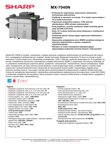 MX-7040N • Drukowanie, kopiowanie, skanowanie, faksowanie, archiwizacja dokumentów • Prędkość w stronach na minutę: 70 w trybie czarno-białym i 70 w trybie kolorowym • Pojemność podajników papieru: 3100 arkuszy standardowo; 8500 arkuszy maksymalnie • Duża prędkość, wysoka wydajność dzięki szerokiej gamie opcji obróbki końcowej • Duży 10,1-calowy kolorowy panel dotykowy z możliwością odchylania • Znakomita jakość obrazu dzięki systemowi odświeżania dewelopera • Opcjonalne przeglądanie stron WWW umożliwia dostęp do internetu bezpośrednio z panelu urządzenia wielofunkcyjnego • Wiodące na rynku rozwiązania zabezpieczające zapewniające znakomitą ochronę danych i dokumentów Model MX-7040N to szybkie, uniwersalne i wydajne kolorowe urządzenie wielofunkcyjne A3 przeznaczone dla małych firm, wymagających profesjonalnych urządzeń obróbki końcowej. Możliwość drukowania 70 stron na minutę w trybie kolorowym i czarno-białym przy rzeczywistej rozdzielczości 1200 x 1200 dpi, szybkość skanowania do 75 oryginałów na minutę i standardowy dwustronny automatyczny podajnik dokumentów (DSPF) o pojemności 150 arkuszy sprawiają, że to urządzenie wielofunkcyjne zapewnia jakość, wydajność, uniwersalność i niezawodność, których potrzebujesz. Dzięki takim rozwiązaniom, jak duży kolorowy panel dotykowy z technologią finger-swipe, podajnik papieru o bardzo dużej pojemności i pośredni pojemnik toneru (doskonały do wykonywania dużych zadań i zapewniający ciągłość pracy podczas wymiany toneru), imponująco szeroka gama wysokowydajnych profesjonalnych urządzeń obróbki końcowej, funkcje do zarządzania dokumentami i standardowe wielowarstwowe zabezpieczenia chroniące dane, model MX-7040N to doskonałe urządzenie dla wszystkich, którzy poważnie myślą o tworzeniu dokumentów o profesjonalnym wyglądzie w biurze w sposób łatwy i bezproblemowy. Ogólne Kopiarka • Szybkość urządzenia, tryb kolorowy w str./min (A4): 70 • Szybkość urządzenia, tryb cz.-b. w str./min (A4): 70 • Szybkość urządzenia, tryb kolorowy w str./min (A3): 35 • Szybkość urządzenia, tryb cz.-b. w str./min (A3): 35 • Format papieru: min.- maks.: A5R-SRA3 • Gramatura papieru (g/m²): 55-300 • Pojemność: standardowa (arkuszy): 3100 • Pojemność: maks. (arkuszy): 8500 • Czas nagrzewania (w sekundach): 55 • Pamięć ogólna min./maks. (MB): 5120 • Pamięć drukarki min./maks. (MB): 5120 (printer/copier shared) • Twardy dysk: STD • Pojemność twardego dysku (GB): 1024 • Dupleks: STD • Wymagania dotyczące źródła zasilania - sieciowe napięcie lokalne (Hz): 200-240v, 50/60Hz • Pobór mocy (kW): 3,84 • Wymiary (mm): 845 x 844 x 1222 • Waga (kg): 222 • Format oryginału (maks.): A3 • Czas pierwszej kopii kolorowej (sek.): 5,1 • Czas pierwszej kopii cz.-b. (sek.): 3,7 • Sorter elektroniczny (standard): • Kopiowanie ciągłe (maks. kopii): 9999 • Rozdzielczość skanowania w trybie cz.-b. (dpi): 600 x 600,600 x 400 • Rozdzielczość skanowania w trybie kolorowym (dpi): 600 x 600 • Rozdzielczość druku (dpi): 600 x 600 9,600 (equivalent) x 600 • Gradacja (liczba odcieni) - tryb czarno-biały: 2 • Gradacja (liczba odcieni) - tryb kolorowy: 256 • Zakres regulacji skali (%): 25-400 (25-200 using DSPF) in 1% increments • Zaprogramowane skale kopiowania: 10 (5R/5E) Podajnik dokumentów • Pojemność podajnika oryginałów (kartek): 150 Sharp Electronics (Europe) GMBH Spółka z o. o. Oddział w Polsce, ul. Poleczki, 33 Budynek A2, 02-822 Warszawa tel.: +48 22 545 81 00, faks: +48 22 545 81 00, faks: +48 22 545 81 05, www.sharp.pl MX-7040N Skaner Funkcja archiwizacji dokumentów • Skaner sieciowy (std./opcja): STD • Skanowanie w trybach "pull scan" i "push scan": • Rozdzielczość w trybie "push scan" (dpi): 100,150, 200,300, 400,600 • Rozdzielczość w trybie "pull scan" (dpi): 75,150, 200,300, 400,600, 50 - 9600 via user setting • Formaty plików: XPS, PDF, encrypted PDF, compact PDF, PDF/A, JPEG , TIFF • Narzędzia skanera: Network Scanner Tool, Sharpdesk • Skanowanie na pulpit: • Skanowanie do FTP, Email: • Skanowanie do folderu sieciowego: • Skanowanie do pamięci USB: Drukarka • Rozdzielczość (dpi): 1200 x 1200,600 x 600,9600 (equivalent) x 600 • Drukarka sieciowa (std./opcja): Standard • Interfejs standardowy/opcjonalny: Standard USB 2.0,10Base-T/100Base-TX/1000Base-T • Obsługiwane systemy operacyjne - standardowo: Windows XP/Windows Server 2003,2008, 2008 R2/Windows Vista. Windows 7 • Protokoły sieciowe: TCP/IP (IPv4, IPv6), IPX/SPX (NetWare), EtherTalk (AppleTalk) • Protokoły druku: LPR, Raw TCP (port 9100), POP3 (drukowanie przez e-mail), HTTP, aplikacja Novell Printserver z NDS i Bindery, FPT do pobierania plików do druku, druk EtherTalk, IPP • Emulacja PDL std./opcja: PCL6 (standard), True Adobe PostScript, XPS (opcja) • Dostępne czcionki: 80 (PCL), 136 (PS3) • Funkcja archiwizacji dokumentów (std./opcja): STD • Pojemność funkcji przechowywania dokumentów - foldery główny i własny (liczba stron): 35000 • Pojemność funkcji przechowywania dokumentów - folder tymczasowy (liczba stron): 10000 • Programowane zadania: Kopiowanie, drukowanie, skanowanie, wysyłanie faksów • Foldery do przechowywania dokumentów: Folder tymczasowy, folder główny, foldery własne (maks. 1000) • Przechowywanie faksów poufnych: Faks • Faks (std./opcja): Opcja • System kompresji: MH/MR/MMR/JBIG • Protokół komunikacyjny: Super G3/G3 • Czas transmisji (w sekundach): 2 • Szybkość modemu (b/s): 33,600 - 2,400 • Rozdzielczość transmisji: 203,2 x 97,8/406,4 x 391 • Format dokumentu (min.): A5 • Format dokumentu (maks.): A3 • Pamięć (MB): 1024 • Poziomy szarości: 256 • Programowanie połączeń; skrócone, szybkie: 999 • Rozsyłanie (maks. liczba odbiorców): 500 Opcje wykańczania • Maksymalna wydajność