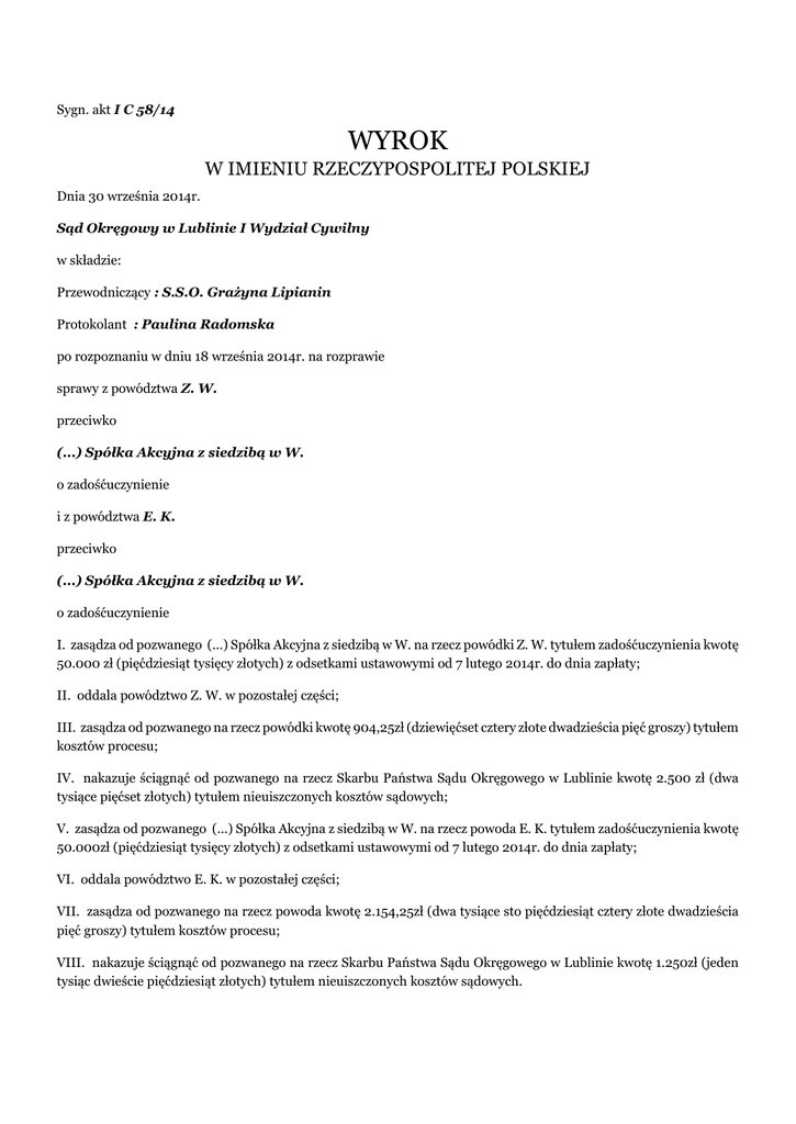 Sygn. akt I C 58/14 WYROK W IMIENIU RZECZYPOSPOLITEJ POLSKIEJ Dnia 30 września 2014r. Sąd Okręgowy w Lublinie I Wydział Cywilny w składzie: Przewodniczący : S.S.O. Grażyna Lipianin Protokolant : Paulina Radomska po rozpoznaniu w dniu 18 września 2014r. na rozprawie sprawy z powództwa Z. W. przeciwko (...) Spółka Akcyjna z siedzibą w W. o zadośćuczynienie i z powództwa E. K. przeciwko (...) Spółka Akcyjna z siedzibą w W. o zadośćuczynienie I. zasądza od pozwanego (...) Spółka Akcyjna z siedzibą w W. na rzecz powódki Z. W. tytułem zadośćuczynienia kwotę 50.000 zł (pięćdziesiąt tysięcy złotych) z odsetkami ustawowymi od 7 lutego 2014r. do dnia zapłaty; II. oddala powództwo Z. W. w pozostałej części; III. zasądza od pozwanego na rzecz powódki kwotę 904,25zł (dziewięćset cztery złote dwadzieścia pięć groszy) tytułem kosztów procesu; IV. nakazuje ściągnąć od pozwanego na rzecz Skarbu Państwa Sądu Okręgowego w Lublinie kwotę 2.500 zł (dwa tysiące pięćset złotych) tytułem nieuiszczonych kosztów sądowych; V. zasądza od pozwanego (...) Spółka Akcyjna z siedzibą w W. na rzecz powoda E. K. tytułem zadośćuczynienia kwotę 50.000zł (pięćdziesiąt tysięcy złotych) z odsetkami ustawowymi od 7 lutego 2014r. do dnia zapłaty; VI. oddala powództwo E. K. w pozostałej części; VII. zasądza od pozwanego na rzecz powoda kwotę 2.154,25zł (dwa tysiące sto pięćdziesiąt cztery złote dwadzieścia pięć groszy) tytułem kosztów procesu; VIII. nakazuje ściągnąć od pozwanego na rzecz Skarbu Państwa Sądu Okręgowego w Lublinie kwotę 1.250zł (jeden tysiąc dwieście pięćdziesiąt złotych) tytułem nieuiszczonych kosztów sądowych. Sygn. akt I C 58/14 UZASADNIENIE W pozwie z 17 stycznia 2014r. wniesionym przeciwko (...) Spółka Akcyjna z siedzibą w W. Z. W. domagała się zasądzenia od pozwanego kwoty 80.000zł z ustawowymi odsetkami od dnia 31 po doręczeniu pozwanemu wezwania do zapłaty tytułem zadośćuczynienia za krzywdę jakiej doznała w wyniku śmierci osoby bliskiej – matki, na podstawie art. 448 § 1 kc w zw. z art. 24 § 1 kc. Wnosiła również o zasądzenie kosztów postępowania, w tym kosztów zastępstwa procesowego i opłaty skarbowej od pełnomocnictwa (pozew z uzasadnieniem k.2-12). W odpowiedzi na pozew pozwany wniósł o oddalenie powództwa w całości i zasądzenie od powódki na rzecz pozwanego kosztów procesu według norm przepisanych (odpowiedź na pozew k.49-56). W pozwie z 30 marca 2014r. wniesionym przeciwko (...) Spółka Akcyjna z siedzibą w W. E. K. domagał się zasądzenia od pozwanego kwoty 80.000zł z ustawowymi odsetkami od dnia 31 po doręczeniu pozwanemu wezwania do zapłaty tytułem zadośćuczynienia za krzywdę jakiej doznał w wyniku śmierci osoby bliskiej –matki, na podstawie art. 448 § 1 kc w zw. z art. 24 § 1 kc. Wnosił również o zasądzenie kosztów postępowania, w tym kosztów zastępstwa procesowego i opłaty skarbowej od pełnomocnictwa (pozew z uzasadnieniem k.2-12). W odpowiedzi na pozew pozwany wniósł o oddalenie powództwa w całości i zasądzenie od powoda na rzecz pozwanego kosztów procesu według norm przepisanych (odpowiedź na pozew k. 36-44). Postanowieniem z 12 czerwca 2014r. na zasadzie art. 219 kpc zarządzono połączenie sprawy z powództwa E. K. I C 279/14 do łącznego rozpoznania i orzekania ze sprawą I C 58/14 z powództwa Z. W.. W toku postępowania stanowiska stron nie uległy zmianie. Sąd Okręgowy ustalił następujący stan faktyczny: 18 stycznia 2004r. w miejscowości W. A. Ż., kierując pojazdem marki p. o nr rej. (...), nieumyślnie naruszył zasady bezpieczeństwa w ruchu lądowym w ten sposób, że nie dostosował prędkości i techniki jazdy do panujących warunków drogowych, w następstwie czego kierowany przez niego pojazd wpadł w poślizg i potrącił pieszą M. K., która doznała obrażeń ciała w postaci m.in. zmiażdżenia głowy i klatki piersiowej ze stłuczeniem mózgu, skutkujących zgonem na miejscu zdarzenia (odpis skrócony aktu zgonu k. 15). Sprawca wypadku ubezpieczony był w zakresie OC w (...) Spółka Akcyjna z siedzibą w W.. Przeciwko sprawcy toczyło się postępowanie karne przed Sądem Rejonowym w Opolu Lubelskim, zakończone prawomocnym wyrokiem skazującym z 5 grudnia 2005r. w sprawie II K 851/04 (odpis wyroku k. 75v). Śmierć matki była traumatycznym przeżyciem dla powodów. Matka zginęła na poboczu w pobliżu swego domu około godziny 8.00 w niedzielę. Powódka przyjechała na miejsce wypadku po telefonie od kuzynki, że był wypadek. Pojechała z mężem i synem. Ciało matki leżało na poboczu w czarnym worku. Powód po informacji o wypadku czekał pod szpitalem w B.. Myślał, że matka zostanie tam przywieziona. Około 9.00 pojechał na miejsce wypadku z żoną i synem. Były prowadzone oględziny miejsca wypadku. Uczestniczył w czynnościach prokurator. Ustalano jakich obrażeń doznała matka powodów, oglądano ciało. Zostało zabrane około godziny 15.00. Powodowie widzieli martwą, okaleczoną matkę i bardzo to przeżywali. Pozwany w postępowaniu likwidacyjnym decyzją z 18 stycznia 2004r. przyznał odszkodowanie w kwocie 6.630zł z tytułu zwrotu kosztów pogrzebu i wypłacił je po połowie Z. W. i E. K. (decyzja k. 16). W piśmie z 3 stycznia 2014r., doręczonym 7 stycznia 2014r., powodowie zgłosili do pozwanego żądanie zadośćuczynienia w kwocie po 80.000zł dla każdego z nich (zgłoszenie szkody pismo k. 17-20, potwierdzenie nadania k. 21, data wpływu - akta szkody k. 68). Matka powodów w chwili śmierci miała 76 lat. Mieszkała w W. w domu stanowiącym współwłasność powodów. Otrzymali gospodarstwo rodziców. Była sprawna, jeździła rowerem. Sama jeździła do L.. Tam sprzedawała mleko, sery, jaja, grzyby i jagody. Pobierała rentę zbowidowską po mężu. Wcześniej otrzymywała rentę rolniczą. Renta po mężu była wyższa o około 300zł 