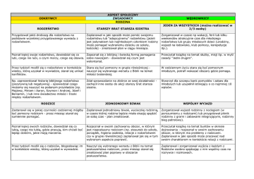 ODKRYWCY ASPEKT SPOŁECZNY ZWIADOWCY RODZINA RODZEŃSTWO STARSZY BRAT STARSZA SIOSTRA Przygotował jakiś drobiazg dla rodzeństwa na podstawie wcześniej przygotowanego wywiadu z rodzeństwem. Zaplanował w jaki sposób może pomóc swojemu rodzeństwu lub "adopcyjnemu" rodzeństwu (jeżeli jest jedynakiem lub najmłodszym członkiem rodziny może pomagać wybranemu dziecku ze szkoły, kościoła) - zrealizował plan w ciągu miesiąca. WĘDROWNICY JEDEN ZA WSZYSTKICH (można realizować w 2/3 osoby) Zorganizował w czasie np wakacji, ferii lub kilku weekendów atrakcyjnie czas dla młodszego rodzeństwa lub grupy młodszych dzieci (urodziny, wyjazd na lodowisko, klub pomocy, korepetycje itp.). Poznał lepiej swoje rodzeństwo, dowiedział się co Zapoznał się z biblijną i świecką formą pomagania lubi, czego nie lubi, o czym marzy, czego się obawia. sobie nawzajem - dowiedział się czym jest wolontariat. Przeczytał książkę na temat służby, misji itp. w myśl zasady "Jedni drugim". Przez tydzień modlił się o rodzeństwo w kontekście wiedzy, którą uzyskał w wywiadzie, starał się unikać konfliktów. Stara się być pomocny w grupie rówieśniczej nauczył się wybranego wersetu z Biblii na temat miłości braterskiej. W codziennym życiu stara się być pomocnym młodszym, potrafi wskazać obszary gdzie pomaga. Np. zaprezentował historię biblijnego rodzeństwa (pozytywną lub negatywną) - opowiedział czego możemy się nauczyć na podanym przykładzie (np. Mojżesz, Miriam i Aaron, Szymon i Andrzej, Józef i Beniamin, ) lub inne świadectwo miłości i troski między rodzeństwem. Zdał sprawozdanie na zbiórce ze swej działalności zachęcił inne osoby do akcji starszy brat starsza siostra. Stworzył dla szczepu bank pomysłów i zabaw dla młodszych lub uzupełnił istniejący o co najmniej 10 wpisów. RODZICE JEDNODNIOWY BIWAK WSPÓLNY WYJAZD Zastanowił się w jakiej czynności codziennej mógłby być pomocny rodzicom - przez miesiąc starał się sumiennie pomagać. Zaplanował jednodniowy biwak, wycieczkę rodzinną, w czasie której rodzina będzie miała okazję spędzić ze sobą czas - plan zrealizował. Zorganizował wyjazd rodzinny z noclegiem (w porozumieniu z rodzicami) lub przygotował piknik rodzinny z grami i zabawami integrującymi, rodzinny bieg patrolowy). Poznał lepiej swoich rodziców, dowiedział się co lubią, czego nie lubią, gdzie pracują, kim chcieli być będąc dziećmi, jakie mają marzenia. Rozpoznał w swoim zachowaniu obszar, w którym jest nieposłuszny rodzicom (np. stosunek do szkoły, porządek, higiena osobista, relacje z rodzeństwem czy w grupie rówieśniczej) zaplanował jak się w tym wybranym aspekcie poprawić. Przeczytał książkę na temat buntów w okresie dojrzewania - rozpoznał w swoim zachowaniu obszar, w którym ma problemy z rodzicami. Zaplanował w jaki sposób może pracować nad swoim charakterem w kontekście relacji z rodzicami. Przez tydzień modlił się o rodziców, błogosławiąc im w kontekście wiedzy, którą uzyskał w wywiadzie. Nauczył się wybranego wersetu z Biblii na temat posłuszeństwa rodzicom, przez miesiąc starał się zrealizować plan poprawy w obszarze posłuszeństwa. Zaplanował i zorganizował wyjścia z każdym z Rodziców osobno spędzając z nim wspólny czas na rozrywce i rozmowach. Np. zaprezentował historię biblijnych rodziców opowiedział czego możemy się nauczyć na podanym przykładzie (np. Abraham, Jakub, Jair ) lub inne świadectwo miłości i troski rodzicielskiej. DZIADKOWIE Zdał sprawozdanie na zbiórce z zaplanowanego rodzinnego wypadu z uwzględnieniem pozytywów wynikających z takiej formy spędzenia czasu. DZIEŃ Z DZIADKAMI Przygotował dla wędrowników w szczepie dowolną akcję na rzecz poprawiania relacji z rodzicami (prelekcja, film połączony z klubem dyskusyjnym itp.). OCALIĆ WSPOMNIENIA Napisał listy do dziadków. Zaplanował dzień z dziadkami tak by móc ich jeszcze Spisał, nagrał lub w innej formie udokumentował lepiej poznać - plan zrealizował. (np. skatalogował zdjęcia) historię swej rodziny do trzech pokoleń. Poznał lepiej swoich dziadków, porozmawiał osobiście lub opowiedzieli mu rodzice - dowiedział się co lubią, czego nie lubią, czy chorują, kim chcieli być będąc dziećmi, jakie mają marzenia. Rozumie trudności wynikające z wieku osób starszych, wie jak i chętnie pomaga osobom starszym. Zrobił wywiad ze starszymi mieszkańcami wspólnoty, miasta, okolicy na temat tego jak zmieniło się otoczenie, zwyczaje, relacje (lub zgromadził tę wiedzę w inny sposób). Przez tydzień modlił się o dziadków, błogosławiąc im w kontekście wiedzy, którą uzyskał w wywiadzie. Nauczył się wybranego wersetu z Biblii na temat sędziwego wieku (np. Przyp. 16,31; III Mojż. 19,32) zastanowił się co oznaczają te słowa. Czyta artykuły, uczestniczy w spotkaniach lub wycieczkach wzbogacających wiedzę na temat minionych czasów, potrafi biblijnie uzasadnić potrzebę pamięci pokoleniowej. Opowiedział na zbiórce o swoich dziadkach jakąś ciekawą historię. Wykonał wraz z zastępem akcję na rzecz ludzi starszych (Dzień Babci/Dziadka, odwiedziny w domu opieki społecznej, wieczernicę z piosenkami starszego pokolenia, akcję niewidzialnej ręki itp.). Zorganizował dla szczepu grę miejską w oparciu o przeprowadzone wywiady. KUZYNI POZNAJMY SIĘ ANIMATOR KREWNYCH Stworzył "rodzinną siatkę" kuzynostwa - uwzględnił w niej informację w jaki sposób jest spokrewniony, kiedy są urodziny kuzynostwa i gdzie mieszkają. Stworzył "siatkę" najbliższej rodziny. Skontaktował się z nimi poprzez spotkania, rozmowy tel., maile, itp.. Przygotował zjazd rodzinny mający na celu zacieśnianie więzów rodzinnych. Poznał lepiej wybranego kuzyna/kę - dowiedział się co lubi, czego nie lubi, o czym marzy, czego się obawia. Przeprowadził wywiady z członkami rodziny. Spisał ciekawe - rodzinne historie