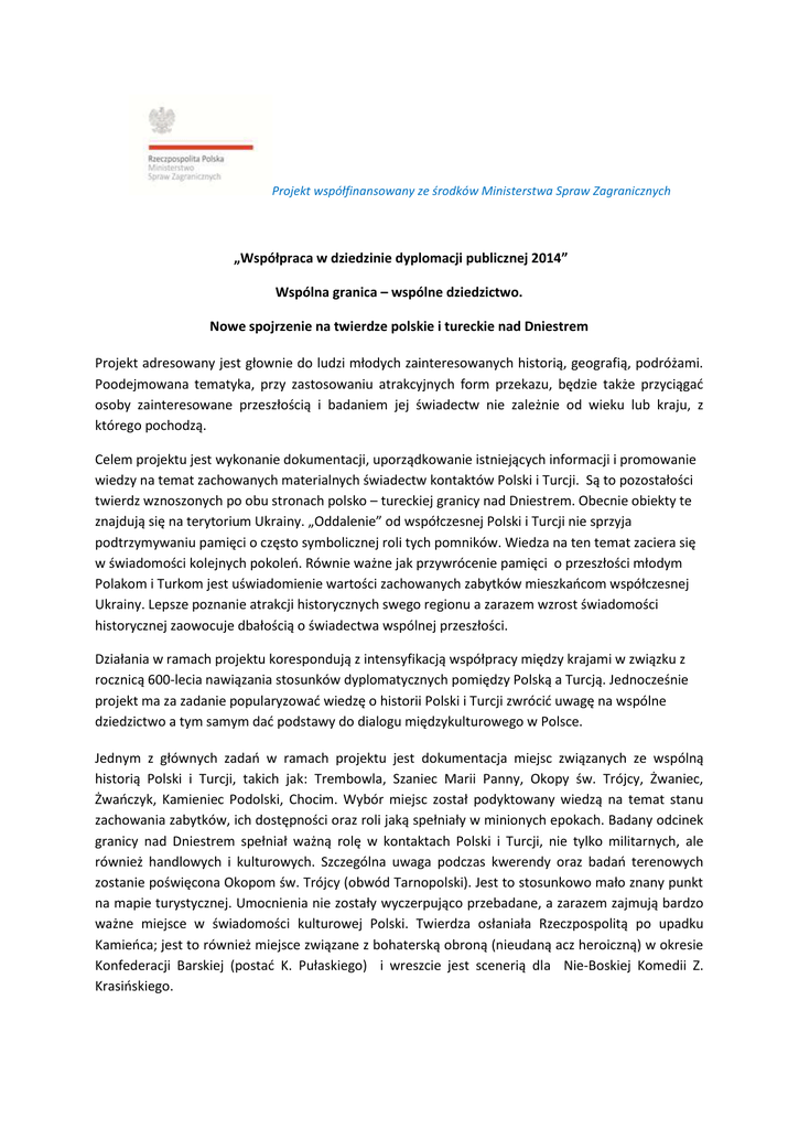 Projekt współfinansowany ze środków Ministerstwa Spraw Zagranicznych „Współpraca w dziedzinie dyplomacji publicznej 2014” Wspólna granica – wspólne dziedzictwo. Nowe spojrzenie na twierdze polskie i tureckie nad Dniestrem Projekt adresowany jest głownie do ludzi młodych zainteresowanych historią, geografią, podróżami. Poodejmowana tematyka, przy zastosowaniu atrakcyjnych form przekazu, będzie także przyciągać osoby zainteresowane przeszłością i badaniem jej świadectw nie zależnie od wieku lub kraju, z którego pochodzą. Celem projektu jest wykonanie dokumentacji, uporządkowanie istniejących informacji i promowanie wiedzy na temat zachowanych materialnych świadectw kontaktów Polski i Turcji. Są to pozostałości twierdz wznoszonych po obu stronach polsko – tureckiej granicy nad Dniestrem. Obecnie obiekty te znajdują się na terytorium Ukrainy. „Oddalenie” od współczesnej Polski i Turcji nie sprzyja podtrzymywaniu pamięci o często symbolicznej roli tych pomników. Wiedza na ten temat zaciera się w świadomości kolejnych pokoleń. Równie ważne jak przywrócenie pamięci o przeszłości młodym Polakom i Turkom jest uświadomienie wartości zachowanych zabytków mieszkańcom współczesnej Ukrainy. Lepsze poznanie atrakcji historycznych swego regionu a zarazem wzrost świadomości historycznej zaowocuje dbałością o świadectwa wspólnej przeszłości. Działania w ramach projektu korespondują z intensyfikacją współpracy między krajami w związku z rocznicą 600-lecia nawiązania stosunków dyplomatycznych pomiędzy Polską a Turcją. Jednocześnie projekt ma za zadanie popularyzować wiedzę o historii Polski i Turcji zwrócić uwagę na wspólne dziedzictwo a tym samym dać podstawy do dialogu międzykulturowego w Polsce. Jednym z głównych zadań w ramach projektu jest dokumentacja miejsc związanych ze wspólną historią Polski i Turcji, takich jak: Trembowla, Szaniec Marii Panny, Okopy św. Trójcy, Żwaniec, Żwańczyk, Kamieniec Podolski, Chocim. Wybór miejsc został podyktowany wiedzą na temat stanu zachowania zabytków, ich dostępności oraz roli jaką spełniały w minionych epokach. Badany odcinek granicy nad Dniestrem spełniał ważną rolę w kontaktach Polski i Turcji, nie tylko militarnych, ale również handlowych i kulturowych. Szczególna uwaga podczas kwerendy oraz badań terenowych zostanie poświęcona Okopom św. Trójcy (obwód Tarnopolski). Jest to stosunkowo mało znany punkt na mapie turystycznej. Umocnienia nie zostały wyczerpująco przebadane, a zarazem zajmują bardzo ważne miejsce w świadomości kulturowej Polski. Twierdza osłaniała Rzeczpospolitą po upadku Kamieńca; jest to również miejsce związane z bohaterską obroną (nieudaną acz heroiczną) w okresie Konfederacji Barskiej (postać K. Pułaskiego) i wreszcie jest scenerią dla Nie-Boskiej Komedii Z. Krasińskiego. Zebrane informacje źródłowe w tym ikonografia a także dokumentacja filmowa i fotograficzna z ziemi oraz z powietrza, relacje z podróży… mają służyć utworzeniu finalnego produktu – strony internetowej, która będzie zawierać kompendium wiedzy na temat badanego obszaru. Strony, która połączy rzetelne informacje na temat historii i zabytków architektury opracowane przez specjalistów z relacją z podróży do tych miejsc i ich dokumentacją. W obecnym natłoku różnych informacji bombardujących współczesnego młodego człowieka poprzez wszelkiego rodzaju media ważne jest aby osoba zainteresowana danym tematem otrzymała rzetelne i precyzyjne informacje, dobrej jakości z „pierwszej ręki”, jednocześnie podane w sposób do zaakceptowania i przyswojenia na różnych poziomach percepcji (tekst, zdjęcia, filmy, mapy). Polska strona internetowa zostanie przetłumaczona na kilka języków: angielski, turecki, ukraiński co ma na celu zwiększenie jej dostępności dla odbiorców z różnych krajów. Formą promocji projektu „na bieżąco” będzie blog tworzony przez jego uczestników, stanowiący zarówno relację z podróży jak też dokumentujący poszczególne działania w projekcie. Blog będzie propagowany w dostępnych powszechnie mediach społecznościowych. Bardziej konwencjonalną formą zachęty do pogłębienia wiedzy na temat badanych miejsc będzie wystawa posterowa, która dzięki zdjęciom wielkoformatowym ukaże specyfikę i walory historyczne twierdz na granicy Polsko-Tureckiej. Wykonane plansze podpisane w kilku językach (polski, turecki, ukraiński, angielski) wędrując po różnych zakątkach krajów już po zakończeniu projektu będą mogły służyć promocji produktu finalnego jakim jest strona internetowa. Zadania realizowane w ramach projektu na terenie Ukrainy będą odbywać się przy współpracy i wsparciu partnerów ukraińskich: Narodowego Uniwersytetu Przykarpackiego im. Wasyla Stefanyka z siedzibą w Iwano-Frankowsku oraz Uniwersytetu Narodowego im. Iwana Ohijenki z siedzibą w Kamieńcu Podolskim. ________________________ Wyrażone w niniejszej publikacji opinie są poglądami jej Autora. Treści prezentowane w niniejszej publikacji nie są tożsame z oficjalnym stanowiskiem Ministerstwa Spraw Zagranicznych.