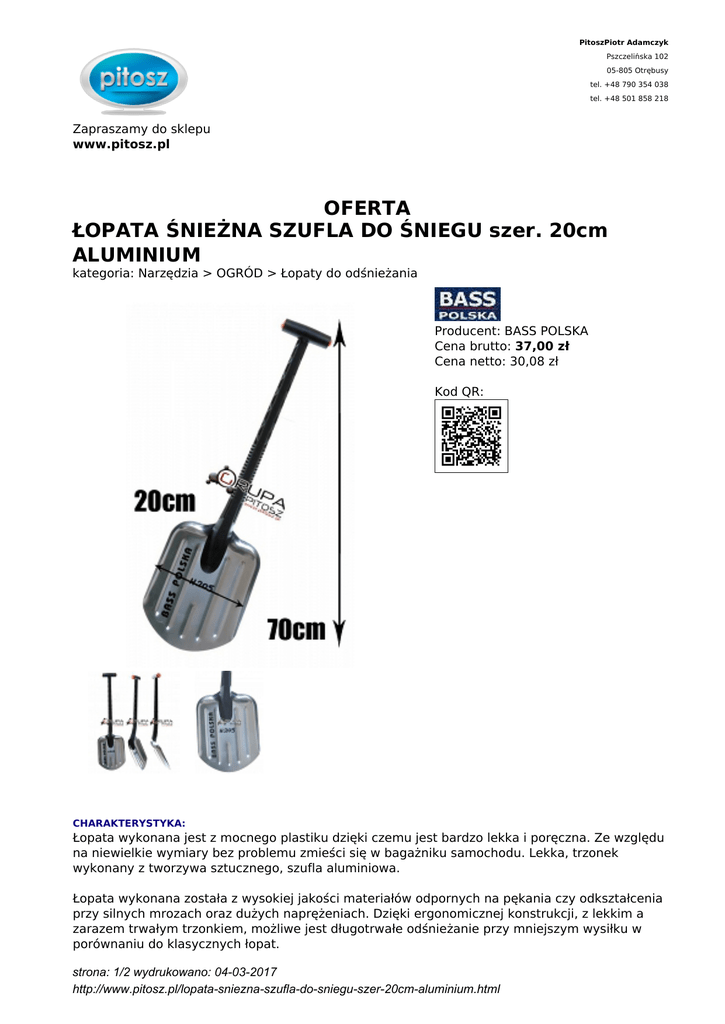 PitoszPiotr Adamczyk Pszczelińska 102 05-805 Otrębusy tel. +48 790 354 038 tel. +48 501 858 218 Zapraszamy do sklepu www.pitosz.pl OFERTA ŁOPATA ŚNIEŻNA SZUFLA DO ŚNIEGU szer. 20cm ALUMINIUM kategoria: Narzędzia > OGRÓD > Łopaty do odśnieżania Producent: BASS POLSKA Cena brutto: 37,00 zł Cena netto: 30,08 zł Kod QR: CHARAKTERYSTYKA: Łopata wykonana jest z mocnego plastiku dzięki czemu jest bardzo lekka i poręczna. Ze względu na niewielkie wymiary bez problemu zmieści się w bagażniku samochodu. Lekka, trzonek wykonany z tworzywa sztucznego, szufla aluminiowa. Łopata wykonana została z wysokiej jakości materiałów odpornych na pękania czy odkształcenia przy silnych mrozach oraz dużych naprężeniach. Dzięki ergonomicznej konstrukcji, z lekkim a zarazem trwałym trzonkiem, możliwe jest długotrwałe odśnieżanie przy mniejszym wysiłku w porównaniu do klasycznych łopat. strona: 1/2 wydrukowano: 04-03-2017 http://www.pitosz.pl/lopata-sniezna-szufla-do-sniegu-szer-20cm-aluminium.html Odpowiednia budowa oraz duża pojemność śnieżna, pozwala na szybkie usunięcie zalegającego śniegu! DANE TECHNICZNE: Szerokość głowicy 20cm Wysokość głowicy 24 cm Wysokość całkowita 70 cm strona: 2/2 wydrukowano: 04-03-2017 http://www.pitosz.pl/lopata-sniezna-szufla-do-sniegu-szer-20cm-aluminium.html