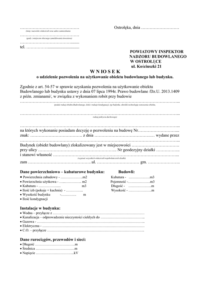 …………………………………… Ostrołęka, dnia ……………………… (imię i nazwisko właścicieli oraz adres zamieszkania …………………………………… zgody z miejscem obecnego zameldowania inwestora) ………………………………........ tel. …………….............................. POWIATOWY INSPEKTOR NADZORU BUDOWLANEGO W OSTROŁĘCE ul. Kościuszki 21 W N IO S E K o udzielenie pozwolenia na użytkowanie obiektu budowlanego lub budynku. Zgodnie z art. 54-57 w sprawie uzyskania pozwolenia na użytkowanie obiektu Budowlanego lub budynku ustawy z dnia 07 lipca 1994r. Prawo budowlane /Dz.U. 2013.1409 z późn. zmianami/, w związku z wykonaniem robót przy budowie …………………………………………………………………………………………………... (podać rodzaj obiektu Budowlanego, ilość i rodzaje kondygnacji, typ budynku, określić technologię wznoszenia obiektu, …………………………………………………………………………………………………... rodzaj pokrycia dachowego) …………………………………………………………………………………………………... na których wykonanie posiadam decyzję o pozwoleniu na budowę Nr………………………... znak: ………………………………. z dnia ………………………………….… wydane przez …………………………………………………………………………………………………... Budynek (obiekt budowlany) zlokalizowany jest w miejscowości ……………………………. przy ulicy ……………………………………………….. Nr geodezyjny działki …………….. i stanowi własność ……………………………………………………………………………... (wypisać wszystkich właścicieli/współwłaścicieli działki) zam ………………………………………ul. ………………………… gm. ………………….. Dane powierzchniowo – kubaturowe budynku: Powierzchnia zabudowy - ……………….m2 Powierzchnia użytkowa - …...………….. m2 Kubatura - ……………..... m3 Ilość izb (pokoje + kuchnia) - …………... Wysokość budynku -…………. m Ilość kondygnacji Instalacje w budynku: Budowli: Kubatura - ………………m3 Pojemność -……………….m3 Długość - ………………..m Wysokość - ………………..m Wodna – przyłącze z …………………………………………………………………… Kanalizacja – odprowadzenie nieczystości ciekłych do ……………………………….. Gazowa - ……………………………………………………………………………….. Elektryczna - …………………………………………………………………………… C.O. – przyłącze ……………………………………………………………………….. Dane rurociągów, przewodów i sieci: Długość …………………………….m Średnica ……………………………m Napięcie …………………………...kV Niniejszym zwracam się z prośbą o wydanie decyzji na użytkowanie budynku w części obejmującej ………………………………………………………………………………… Do całkowitego wykończenia pozostały następujące roboty budowlane i elementy budynku: ……………………………………………………………………………………. ………………………………………………………………………………………………. ………………………………………………………………………………………………. Które zobowiązuję się wykonać w terminie do dnia ………………………………………. W trakcie realizacji obiektu budowlanego wprowadzono następujące zmiany w stosunku do zatwierdzonego przez organ wydający decyzję o pozwoleniu na budowę projektu budowlanego ……………………………………………………………………………….. ………………………………………………………………………………………………. ………………………………………………………………………………………………. Wraz z wnioskiem przedkładam następujące załączniki: 1. Oryginał dziennika budowy z wpisem geodety uprawnionego o wytyczeniu obiektu na gruncie 2. Oświadczenie kierownika budowy: o zgodności wykonania obiektu Budowlanego z projektem budowlanym i warunkami pozwolenia na budowę, o doprowadzeniu do należytego stanu i porządku terenu budowy, a także – w razie korzystania – ulicy, sąsiedniej nieruchomości, budynku lub lokalu. 3. Oświadczenie inspektora nadzoru inwestorskiego budowy o zakończeniu robót budowlanych. 4. Protokoły badań i sprawdzeń oraz opinie: opinia mistrza kominiarskiego, protokół lub oświadczenie osoby posiadającej wymagane kwalifikacje o wykonaniu instalacji elektrycznej wewnątrz budynku, protokół z odbioru instalacji gazowej oraz jej szczelności, protokół z odbioru przyłącza wod.-kan. do budynku, protokół z odbioru przyłącza C.O. do budynku, protokół odbioru lub inny dokument na wjazd na działkę z drogi publicznej, protokół odbioru przyłącza energetycznego. 5. Oświadczenie inwestora zgodnie z ar. 57 ust. w związku z art. 56 ustawy Prawo budowlane, decyzje, opinie: Państwowej Inspekcji Sanitarnej, Państwowej Straży Pożarnej, 6. Inwentaryzację geodezyjną powykonawczą – 2 egz. 7. Projekt budowlany budynku (do wglądu). 8. Fotografie elewacji budynku – 4 szt . ……………………………………… (podpis właściciela/współwłaściciela) UWAGA: Do składania wniosków o wydanie pozwolenia na użytkowanie obiektów (budynków) jak i odbioru decyzji o pozwoleniu na użytkowanie, uprawnieni są właściciele lub osoby posiadające u