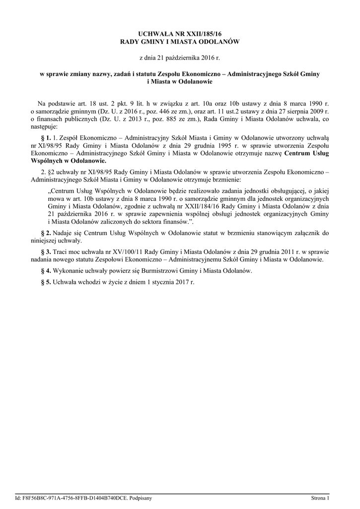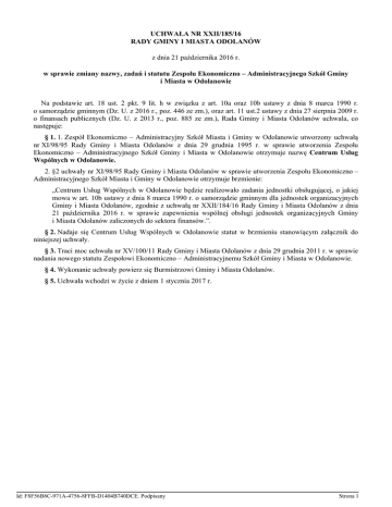 UCHWAŁA NR XXII/185/16 RADY GMINY I MIASTA ODOLANÓW z dnia 21 października 2016 r. w sprawie zmiany nazwy, zadań i statutu Zespołu Ekonomiczno – Administracyjnego Szkół Gminy i Miasta w Odolanowie Na podstawie art. 18 ust. 2 pkt. 9 lit. h w związku z art. 10a oraz 10b ustawy z dnia 8 marca 1990 r. o samorządzie gminnym (Dz. U. z 2016 r., poz. 446 ze zm.), oraz art. 11 ust.2 ustawy z dnia 27 sierpnia 2009 r. o finansach publicznych (Dz. U. z 2013 r., poz. 885 ze zm.), Rada Gminy i Miasta Odolanów uchwala, co następuje: § 1. 1. Zespół Ekonomiczno – Administracyjny Szkół Miasta i Gminy w Odolanowie utworzony uchwałą nr XI/98/95 Rady Gminy i Miasta Odolanów z dnia 29 grudnia 1995 r. w sprawie utworzenia Zespołu Ekonomiczno – Administracyjnego Szkół Gminy i Miasta w Odolanowie otrzymuje nazwę Centrum Usług Wspólnych w Odolanowie. 2. §2 uchwały nr XI/98/95 Rady Gminy i Miasta Odolanów w sprawie utworzenia Zespołu Ekonomiczno – Administracyjnego Szkół Miasta i Gminy w Odolanowie otrzymuje brzmienie: „Centrum Usług Wspólnych w Odolanowie będzie realizowało zadania jednostki obsługującej, o jakiej mowa w art. 10b ustawy z dnia 8 marca 1990 r. o samorządzie gminnym dla jednostek organizacyjnych Gminy i Miasta Odolanów, zgodnie z uchwałą nr XXII/184/16 Rady Gminy i Miasta Odolanów z dnia 21 października 2016 r. w sprawie zapewnienia wspólnej obsługi jednostek organizacyjnych Gminy i Miasta Odolanów zaliczonych do sektora finansów.”. § 2. Nadaje się Centrum Usług Wspólnych w Odolanowie statut w brzmieniu stanowiącym załącznik do niniejszej uchwały. § 3. Traci moc uchwała nr XV/100/11 Rady Gminy i Miasta Odolanów z dnia 29 grudnia 2011 r. w sprawie nadania nowego statutu Zespołowi Ekonomiczno – Administracyjnemu Szkół Gminy i Miasta w Odolanowie. § 4. Wykonanie uchwały powierz się Burmistrzowi Gminy i Miasta Odolanów. § 5. Uchwała wchodzi w życie z dniem 1 stycznia 2017 r. Id: F8F56B8C-971A-4756-8FFB-D1404B740DCE. Podpisany Strona 1 Załącznik do Uchwały Nr XXII/185/16 Rady Gminy i Miasta Odolanów z dnia 21 października 2016 r. STATUT Centrum Usług Wspólnych w Odolanowie Rozdział I Postanowienia ogólne §1 Centrum Usług Wspólnych w Odolanowie, zwane dalej Centrum, jest gminną jednostką organizacyjną Gminy i Miasta Odolanów, działającą na podstawie : 1) ustawy z dnia 8 marca 1990 roku samorządzie gminnym (t.j. Dz. U. Z 2016 r., poz. 446 ze zm.), 2) ustawy z dnia 27 sierpnia 2009 r. o finansach publicznych (Dz. U. Z 2013 r., poz. 885 ze zm.), 3) ustawy z dnia 29 września 1994 roku o rachunkowości (t.j. Dz. U. z 2016 r., poz. 1047 ze zm. ), 4) ustawy z dnia 21 listopada 2008 r. o pracownikach samorządowych (t.j. Dz. U. z 2016 r., poz. 902) 5) ustawy z dnia 29 stycznia 2004 r. Prawo zamówień publicznych (t.j. Dz. U. z 2015 r., poz. 2164 ze zm.) 6) innych obowiązujących przepisów , 7) uchwały Rady Gminy i Miasta Odolanów z dnia 21 października 2016 r. w sprawie zapewnienia wspólnej obsługi jednostek organizacyjnych Gminy i Miasta Odolanów zaliczonych do sektora finansów publicznych, 8) niniejszego Statutu. Id: F8F56B8C-971A-4756-8FFB-D1404B740DCE. Podpisany Strona 1 §2 1. Centrum jest gminną jednostką budżetową nie posiadającą osobowości prawnej, która pokrywa swoje wydatki bezpośrednio z budżetu, a pobrane dochody odprowadza na rachunek dochodów budżetu. 2. Centrum działa na terenie Gminy i Miasta Odolanów. 3. Centrum ma siedzibę w Odolanowie. Rozdział II Cele i zakres działania §3 Centrum zapewnia wspólną obsługę finansową – księgową, kadrowo – płacową i organizacyjno - administracyjną jednostkom obsługiwanym. §4 Realizując cele, o jakich mowa w § 3 Centrum może ingerować w działalność obsługiwanych jednostek wyłącznie w zakresie i na zasadach określonych w aktach prawnych regulujących jego działalność i niniejszym Statucie. §5 1. Działalność Centrum, jako podmiotu obsługującego jednostki obsługiwane nie narusza kompetencji właściwości Dyrektorów obsługiwanych jednostek , jak również kompetencji organów Gminy i Miasta Odolanów 2. Centrum działa w zakresie: 1). obsługi finansowo – księgowej Centrum i jednostek obsługiwanych , prowadzenie całości zadań z zakresu rachunkowości i sprawozdawczości, 2). obsługi kadrowo – płacowej Centrum i jednostek obsługiwanych, 3). obsługi organizacyjno – administracyjnej Centrum i jednostek obsługiwanych. §6 Zadania Centrum: 1. Obsługa finansowo – księgowa obejmuje: 1. prowadzenie całości sprawozdawczości i rachunkowości jednostek obsługiwanych, 2. opracowywanie projektów uregulowań wewnętrznych dotyczących rachunkowości, Id: F8F56B8C-971A-4756-8FFB-D1404B740DCE. Podpisany Strona 2 3. sporządzanie sprawozdań budżetowych i finansowych oraz przedkładanie ich odpowiednim organom, 4. nadzór nad prawidłowym przebiegiem inwentaryzacji i jej rozliczanie, 5. obsługa księgowa Zakładowego Funduszu Świadczeń Socjalnych, 6. prowadzenie obsługi kasowej oraz obsługi rachunków bankowych, 7. koordynacja i pomoc przy opracowywaniu planów finansowych oraz bieżąca kontrola nad ich realizacją, sprawozdawczości 8. prowadzenie statystycznej Centrum i jednostek obsługiwanych. 2. Obsługa kadrowo – płacowa obejmuje: 1. prowadzenie akt osobowych, 2. przygotowywanie i koordynacja procedury naboru na wolne stanowiska, 3. przygotowywanie dokumentacji i obsługa spraw związanych z prowadzeniem służby przygotowawczej, 4. przygotowywanie na polecenie Dyrektora jednostki obsługiwanej zgodnie z obowiązującymi przepisami dokumentów dotyczących nawiązania i rozwiązania stosunku pracy, dokumentów związanych z przebiegiem zatrudnienia, ustaleniem wynagrodzeń za pracę, dodatków, w tym uzupełniajacych, ekwiwalentów, nagród i innych świadczeń oraz pism w sprawie udzielania urlopów bezpłatnych, wychowawczych, zdrowotnych, macierzyńskich, 5. sporządzenie 