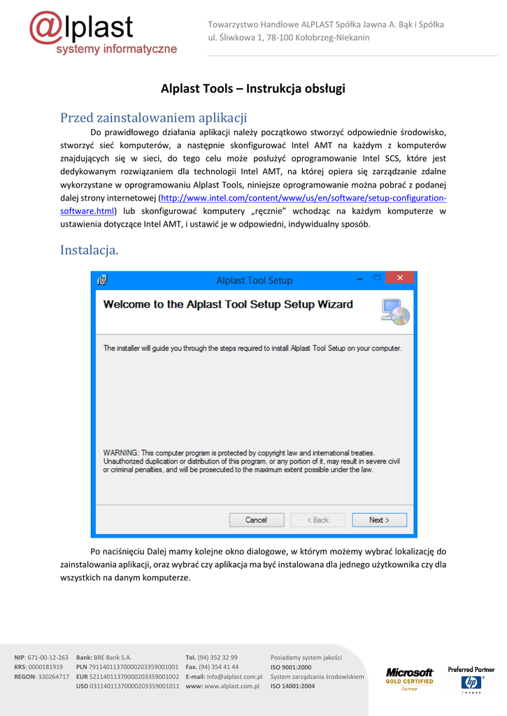 Towarzystwo Handlowe ALPLAST Spółka Jawna A. Bąk i Spółka ul. Śliwkowa 1, 78-100 Kołobrzeg-Niekanin Alplast Tools – Instrukcja obsługi Przed zainstalowaniem aplikacji Do prawidłowego działania aplikacji należy początkowo stworzyć odpowiednie środowisko, stworzyć sieć komputerów, a następnie skonfigurować Intel AMT na każdym z komputerów znajdujących się w sieci, do tego celu może posłużyć oprogramowanie Intel SCS, które jest dedykowanym rozwiązaniem dla technologii Intel AMT, na której opiera się zarządzanie zdalne wykorzystane w oprogramowaniu Alplast Tools, niniejsze oprogramowanie można pobrać z podanej dalej strony internetowej (http://www.intel.com/content/www/us/en/software/setup-configurationsoftware.html) lub skonfigurować komputery „ręcznie” wchodząc na każdym komputerze w ustawienia dotyczące Intel AMT, i ustawić je w odpowiedni, indywidualny sposób. Instalacja. Po naciśnięciu Dalej mamy kolejne okno dialogowe, w którym możemy wybrać lokalizację do zainstalowania aplikacji, oraz wybrać czy aplikacja ma być instalowana dla jednego użytkownika czy dla wszystkich na danym komputerze. NIP: 671-00-12-263 Bank: BRE Bank S.A. KRS: 0000181919 PLN 79114011370000203359001001 REGON: 330264717 EUR 52114011370000203359001002 USD 03114011370000203359001011 Tel. (94) 352 32 99 Fax. (94) 354 41 44 E-mail: [email protected] www: www.alplast.com.pl Posiadamy system jakości ISO 9001:2000 System zarządzania środowiskiem ISO 14001:2004 Towarzystwo Handlowe ALPLAST Spółka Jawna A. Bąk i Spółka ul. Śliwkowa 1, 78-100 Kołobrzeg-Niekanin Po wciśnięciu Dalej uzyskujemy informację, że instalator jest gotowy do zainstalowania aplikacji po wciśnięciu kolejny raz Dalej nastąpi instalacja potrzebnych składników oraz oprogramowania Alplast Tools, na koniec zostanie wyświetlone okno dialogowe, że instalacja się zakończyła. NIP: 671-00-12-263 Bank: BRE Bank S.A. KRS: 0000181919 PLN 79114011370000203359001001 REGON: 330264717 EUR 52114011370000203359001002 USD 03114011370000203359001011 Tel. (94) 352 32 99 Fax. (94) 354 41 44 E-mail: [email protected] www: www.alplast.com.pl Posiadamy system jakości ISO 9001:2000 System zarządzania środowiskiem ISO 14001:2004 Towarzystwo Handlowe ALPLAST Spółka Jawna A. Bąk i Spółka ul. Śliwkowa 1, 78-100 Kołobrzeg-Niekanin Korzystanie z aplikacji Po uruchomieniu zainstalowanej aplikacji pojawia się okno dialogowe: Wybieramy Intel AMT, gdy chcemy otworzyć główne okno aplikacji lub Zakończ, gdy chcemy zakończyć pracę z programem. NIP: 671-00-12-263 Bank: BRE Bank S.A. KRS: 0000181919 PLN 79114011370000203359001001 REGON: 330264717 EUR 52114011370000203359001002 USD 03114011370000203359001011 Tel. (94) 352 32 99 Fax. (94) 354 41 44 E-mail: [email protected] www: www.alplast.com.pl Posiadamy system jakości ISO 9001:2000 System zarządzania środowiskiem ISO 14001:2004 Towarzystwo Handlowe ALPLAST Spółka Jawna A. Bąk i Spółka ul. Śliwkowa 1, 78-100 Kołobrzeg-Niekanin Aby można było rozpocząć jakiekolwiek prace zdalne należy początkowo utworzyć listę komputerów, którymi chcemy zarządzać. W tym celu używamy przycisku Skanuj sieć, po czym przeszukiwana jest określona sieć komputerowa w poszukiwaniu komputerów posiadających Intel AMT. Z listy wykrytych komputerów należy wybrać komputer, który chcemy dodać do listy poprzez zaznaczenie go i wciśniecie przycisku „Dodaj Komputer”, w oknie dialogowym należy wprowadzić nazwę użytkownika i hasło dla logowania się na dany komputer do Intel AMT, po czym zatwierdzić wybory przyciskiem ok. Do listy komputerów zostanie dodany wybrany komputer, po zaznaczeniu go jest możliwość połączenia się. NIP: 671-00-12-263 Bank: BRE Bank S.A. KRS: 0000181919 PLN 79114011370000203359001001 REGON: 330264717 EUR 52114011370000203359001002 USD 03114011370000203359001011 Tel. (94) 352 32 99 Fax. (94) 354 41 44 E-mail: [email protected] www: www.alplast.com.pl Posiadamy system jakości ISO 9001:2000 System zarządzania środowiskiem ISO 14001:2004 Towarzystwo Handlowe ALPLAST Spółka Jawna A. Bąk i Spółka ul. Śliwkowa 1, 78-100 Kołobrzeg-Niekanin Po wciśnięciu przycisku „Połącz” program nawiązuje połączenie z wybranym komputerem. Po wciśnięciu Web URL zostaje otworzona domyślna przeglądarka internetowa, w której otwiera się strona html z informacjami o wybranym komputerze. Przykład: Po przejściu do zakładki „Intel Management Engine” wyświetlona jest konfiguracja Intel AMT wybranego komputera. Przykład: NIP: 671-00-12-263 Bank: BRE Bank S.A. KRS: 0000181919 PLN 79114011370000203359001001 REGON: 330264717 EUR 52114011370000203359001002 USD 03114011370000203359001011 Tel. (94) 352 32 99 Fax. (94) 354 41 44 E-mail: [email protected] www: www.alplast.com.pl Posiadamy system jakości ISO 9001:2000 System zarządzania środowiskiem ISO 14001:2004 Towarzystwo Handlowe ALPLAST Spółka Jawna A. Bąk i Spółka ul. Śliwkowa 1, 78-100 Kołobrzeg-Niekanin Po przejściu do zakładki „Sieć” wyświetlona jest konfiguracja karty sieciowej oraz sieci, wybranego komputera. Przykład: Po przejściu do zakładki „Zdalna kontrola” wyświetlona jest konfiguracja kontroli zdalnej oraz połączeń KVM wybranego komputera. Przykład: NIP: 671-00-12-263 Bank: BRE Bank S.A. KRS: 0000181919 PLN 79114011370000203359001001 REGON: 330264717 EUR 52114011370000203359001002 USD 03114011370000203359001011 Tel. (94) 352 32 99 Fax. (94) 354 41 44 E-mail: [email protected] www: www.alplast.com.pl Posiadamy system jakości ISO 9001:2000 System zarządzania środowiskiem ISO 14001:2004 Towarzystwo Handlowe ALPLAST Spółka Jawna A. Bąk i Spółka ul. Śliwkowa 1, 78-100 Kołobrzeg-Niekanin NIP: 671-00-12-263 Bank: BRE Bank S.A. KRS: 0000181919 PLN 79114011370000203359001001 REGON: 330264717 EUR 52114011370000203359001002 USD 03114011370000203359001011 Tel. (94) 352 32 99 Fax. (94) 354 41 44 E-mail: [email protected] ww