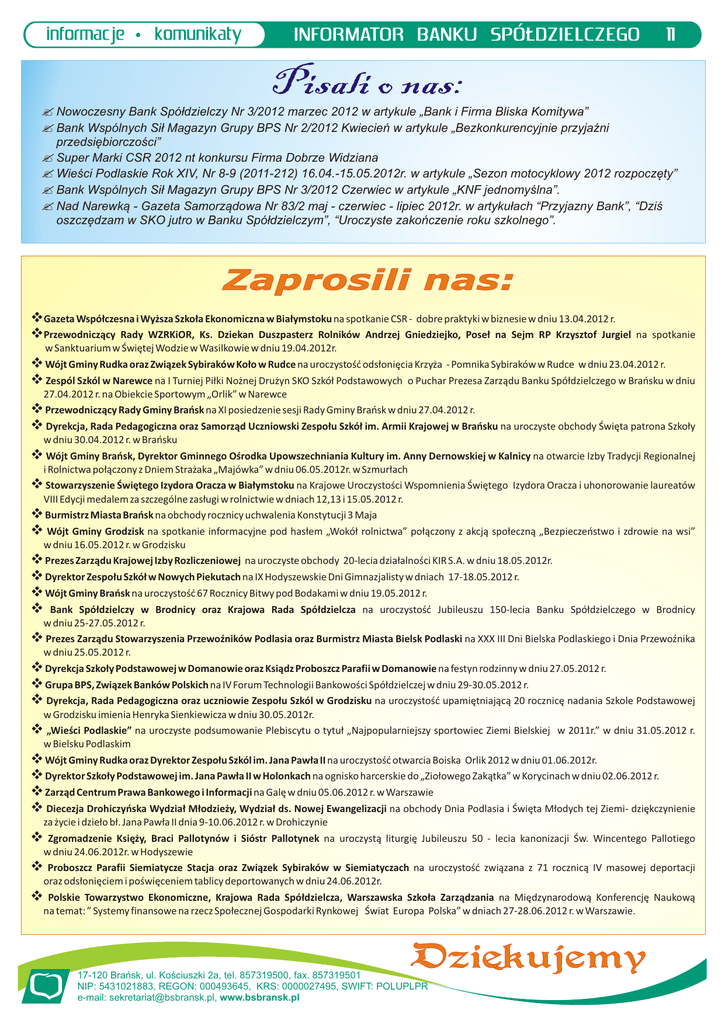 ? ? Nowoczesny Bank Spółdzielczy Nr 3/2012 marzec 2012 w artykule „Bank i Firma Bliska Komitywa” ? Bank Wspólnych Sił Magazyn Grupy BPS Nr 2/2012 Kwiecień w artykule „Bezkonkurencyjnie przyjaźni przedsiębiorczości” ? Super Marki CSR 2012 nt konkursu Firma Dobrze Widziana ? Wieści Podlaskie Rok XIV, Nr 8-9 (2011-212) 16.04.-15.05.2012r. w artykule „Sezon motocyklowy 2012 rozpoczęty” ? Bank Wspólnych Sił Magazyn Grupy BPS Nr 3/2012 Czerwiec w artykule „KNF jednomyślna”. ? Nad Narewką - Gazeta Samorządowa Nr 83/2 maj - czerwiec - lipiec 2012r. w artykułach “Przyjazny Bank”, “Dziś oszczędzam w SKO jutro w Banku Spółdzielczym”, “Uroczyste zakończenie roku szkolnego”. Gazeta Współczesna i Wyższa Szkoła Ekonomiczna w Białymstoku na spotkanie CSR - dobre praktyki w biznesie w dniu 13.04.2012 r. Przewodniczący Rady WZRKiOR, Ks. Dziekan Duszpasterz Rolników Andrzej Gniedziejko, Poseł na Sejm RP Krzysztof Jurgiel na spotkanie w Sanktuarium w Świętej Wodzie w Wasilkowie w dniu 19.04.2012r. Wójt Gminy Rudka oraz Związek Sybiraków Koło w Rudce na uroczystość odsłonięcia Krzyża - Pomnika Sybiraków w Rudce w dniu 23.04.2012 r. Zespól Szkól w Narewce na I Turniej Piłki Nożnej Drużyn SKO Szkół Podstawowych o Puchar Prezesa Zarządu Banku Spółdzielczego w Brańsku w dniu 27.04.2012 r. na Obiekcie Sportowym „Orlik” w Narewce Przewodniczący Rady Gminy Brańsk na XI posiedzenie sesji Rady Gminy Brańsk w dniu 27.04.2012 r. Dyrekcja, Rada Pedagogiczna oraz Samorząd Uczniowski Zespołu Szkół im. Armii Krajowej w Brańsku na uroczyste obchody Święta patrona Szkoły w dniu 30.04.2012 r. w Brańsku Wójt Gminy Brańsk, Dyrektor Gminnego Ośrodka Upowszechniania Kultury im. Anny Dernowskiej w Kalnicy na otwarcie Izby Tradycji Regionalnej i Rolnictwa połączony z Dniem Strażaka „Majówka” w dniu 06.05.2012r. w Szmurłach Stowarzyszenie Świętego Izydora Oracza w Białymstoku na Krajowe Uroczystości Wspomnienia Świętego Izydora Oracza i uhonorowanie laureatów VIII Edycji medalem za szczególne zasługi w rolnictwie w dniach 12,13 i 15.05.2012 r. Burmistrz Miasta Brańsk na obchody rocznicy uchwalenia Konstytucji 3 Maja Wójt Gminy Grodzisk na spotkanie informacyjne pod hasłem „Wokół rolnictwa” połączony z akcją społeczną „Bezpieczeństwo i zdrowie na wsi” w dniu 16.05.2012 r. w Grodzisku Prezes Zarządu Krajowej Izby Rozliczeniowej na uroczyste obchody 20-lecia działalności KIR S.A. w dniu 18.05.2012r. Dyrektor Zespołu Szkół w Nowych Piekutach na IX Hodyszewskie Dni Gimnazjalisty w dniach 17-18.05.2012 r. Wójt Gminy Brańsk na uroczystość 67 Rocznicy Bitwy pod Bodakami w dniu 19.05.2012 r. Bank Spółdzielczy w Brodnicy oraz Krajowa Rada Spółdzielcza na uroczystość Jubileuszu 150-lecia Banku Spółdzielczego w Brodnicy w dniu 25-27.05.2012 r. Prezes Zarządu Stowarzyszenia Przewoźników Podlasia oraz Burmistrz Miasta Bielsk Podlaski na XXX III Dni Bielska Podlaskiego i Dnia Przewoźnika w dniu 25.05.2012 r. Dyrekcja Szkoły Podstawowej w Domanowie oraz Ksiądz Proboszcz Parafii w Domanowie na festyn rodzinny w dniu 27.05.2012 r. Grupa BPS, Związek Banków Polskich na IV Forum Technologii Bankowości Spółdzielczej w dniu 29-30.05.2012 r. Dyrekcja, Rada Pedagogiczna oraz uczniowie Zespołu Szkól w Grodzisku na uroczystość upamiętniającą 20 rocznicę nadania Szkole Podstawowej w Grodzisku imienia Henryka Sienkiewicza w dniu 30.05.2012r. „Wieści Podlaskie” na uroczyste podsumowanie Plebiscytu o tytuł „Najpopularniejszy sportowiec Ziemi Bielskiej w 2011r.” w dniu 31.05.2012 r. w Bielsku Podlaskim Wójt Gminy Rudka oraz Dyrektor Zespołu Szkól im. Jana Pawła II na uroczystość otwarcia Boiska Orlik 2012 w dniu 01.06.2012r. Dyrektor Szkoły Podstawowej im. Jana Pawła II w Holonkach na ognisko harcerskie do „Ziołowego Zakątka” w Korycinach w dniu 02.06.2012 r. Zarząd Centrum Prawa Bankowego i Informacji na Galę w dniu 05.06.2012 r. w Warszawie Diecezja Drohiczyńska Wydział Młodzieży, Wydział ds. Nowej Ewangelizacji na obchody Dnia Podlasia i Święta Młodych tej Ziemi- dziękczynienie za życie i dzieło bł. Jana Pawła II dnia 9-10.06.2012 r. w Drohiczynie Zgromadzenie Księży, Braci Pallotynów i Sióstr Pallotynek na uroczystą liturgię Jubileuszu 50 - lecia kanonizacji Św. Wincentego Pallotiego w dniu 24.06.2012r. w Hodyszewie Proboszcz Parafii Siemiatycze Stacja oraz Związek Sybiraków w Siemiatyczach na uroczystość związana z 71 rocznicą IV masowej deportacji oraz odsłonięciem i poświęceniem tablicy deportowanych w dniu 24.06.2012r. Polskie Towarzystwo Ekonomiczne, Krajowa Rada Spółdzielcza, Warszawska Szkoła Zarządzania na Międzynarodową Konferencję Naukową na temat: ” Systemy finansowe na rzecz Społecznej Gospodarki Rynkowej Świat Europa Polska” w dniach 27-28.06.2012 r. w Warszawie. 17-120 Brańsk, ul. Kościuszki 2a, tel. 857319500, fax. 857319501 NIP: 5431021883, REGON: 000493645, KRS: 0000027495, SWIFT: POLUPLPR e-mail: [email protected], www.bsbransk.pl