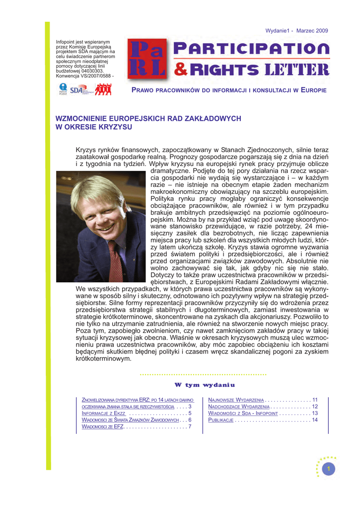 Infopoint jest wspieranym przez Komisję Europejską projektem SDA mającym na celu świadczenie partnerom społecznym nieodpłatnej pomocy dotyczącej linii budżetowej 04030303. Konwencja VS/2007/0588 - Wydanie1 - Marzec 2009 PRAWO PRACOWNIKÓW DO INFORMACJI I KONSULTACJI W EUROPIE WZMOCNIENIE EUROPEJSKICH RAD ZAKŁADOWYCH W OKRESIE KRYZYSU Kryzys rynków finansowych, zapoczątkowany w Stanach Zjednoczonych, silnie teraz zaatakował gospodarkę realną. Prognozy gospodarcze pogarszają się z dnia na dzień i z tygodnia na tydzień. Wpływ kryzysu na europejski rynek pracy przyjmuje oblicze dramatyczne. Podjęte do tej pory działania na rzecz wsparcia gospodarki nie wydają się wystarczające i – w każdym razie – nie istnieje na obecnym etapie żaden mechanizm makroekonomiczny obowiązujący na szczeblu europejskim. Polityka rynku pracy mogłaby ograniczyć konsekwencje obciążające pracowników, ale również i w tym przypadku brakuje ambitnych przedsięwzięć na poziomie ogólnoeuropejskim. Można by na przykład wziąć pod uwagę skoordynowane stanowisko przewidujące, w razie potrzeby, 24 miesięczny zasiłek dla bezrobotnych, nie licząc zapewnienia miejsca pracy lub szkoleń dla wszystkich młodych ludzi, którzy latem ukończą szkołę. Kryzys stawia ogromne wyzwania przed światem polityki i przedsiębiorczości, ale i również przed organizacjami związków zawodowych. Absolutnie nie wolno zachowywać się tak, jak gdyby nic się nie stało. Dotyczy to także praw uczestnictwa pracowników w przedsiębiorstwach, z Europejskimi Radami Zakładowymi włącznie. We wszystkich przypadkach, w których prawa uczestnictwa pracowników są wykonywane w sposób silny i skuteczny, odnotowano ich pozytywny wpływ na strategię przedsiębiorstw. Silne formy reprezentacji pracowników przyczyniły się do wdrożenia przez przedsiębiorstwa strategii stabilnych i długoterminowych, zamiast inwestowania w strategie krótkoterminowe, skoncentrowane na zyskach dla akcjonariuszy. Pozwoliło to nie tylko na utrzymanie zatrudnienia, ale również na stworzenie nowych miejsc pracy. Poza tym, zapobiegło zwolnieniom, czy nawet zamknięciom zakładów pracy w takiej sytuacji kryzysowej jak obecna. Właśnie w okresach kryzysowych muszą ulec wzmocnieniu prawa uczestnictwa pracowników, aby móc zapobiec obciążeniu ich kosztami będącymi skutkiem błędnej polityki i czasem wręcz skandalicznej pogoni za zyskiem krótkoterminowym. W tym wydani u ZNOWELIZOWANA DYREKTYWA ERZ: PO 14 LATACH DAWNO OCZEKIWANA ZMIANA STAŁA SIĘ RZECZYWISTOŚCIĄ . . . . 3 INFORMACJE Z EKZZ . . . . . . . . . . . . . . . . . . . . 5 WIADOMOSCI ZE ŚWIATA ZWIAZKÓW ZAWODOWYCH . . . 6 WIADOMOSCI ZE EFZ. . . . . . . . . . . . . . . . . . . . . . 7 NAJNOWSZE WYDARZENIA . . . . . . . . . . . . . . . . 11 NADCHODZACE WYDARZENIA . . . . . . . . . . . . . . 12 WIADOMOŚCI Z SDA - INFOPOINT . . . . . . . . . . . 13 PUBLIKACJE . . . . . . . . . . . . . . . . . . . . . . . . . . 14 1 Przekształcenie Dyrektywy o ERZ nastąpiło z opóźnieniem, lecz być może i we właściwym momencie. Nie był to proces łatwy, ale na koniec również i pracodawcy nie mogli dalej opierać się oczywistym ulepszeniom. W ciągu ostatnich lat Europejskie Rady Zakładowe rozwinęły się w licznych przedsiębiorstwach, wychodząc poza ramy ściśle prawne. Rozsądne i doświadczone kierownictwo przedsiębiorstwa jest zainteresowane stawieniem czoła trudnościom gospodarczym razem z pracownikami, a nie w kolizji z nimi. Niewątpliwie wiązaliśmy większe nadzieje z przekształceniem Dyrektywy o ERZ. Biorąc jednak pod uwagę aktualną sytuację polityczną, kompromis między Parlamentem Europejskim i Radą Ministrów ds. zatrudnienia i spraw socjalnych, osiągnięty w grudniu 2008, oznacza wielki krok do przodu, nie mówiąc już o dalszym opóźnianiu tegoż przekształcenia. Wystarczy tutaj podkreślić trzy główne elementy. Istotnemu uściśleniu uległa definicja “informowania” i „konsultowania”. W przyszłości pracodawcy będą zmuszeni do natychmiastowego przekazywania kompletnych informacji tak, aby Europejskie Rady Zakładowe mogły szczegółowo ocenić skutki planowanych zamierzeń. Konsultowanie się z ERZ musi mieć miejsce przed podjęciem decyzji przez centralne dyrekcje przedsiębiorstw. Członkowie Europejskich Rad Zakładowych otrzymują prawo do szkoleń bez utraty wynagrodzenia. Poza tym przekształcona dyrektywa uznaje rolę związków zawodowych. W przyszłości Europejskie Rady Zakładowe będą miały większe pole manewru. Mimo że Państwa członkowskie są zobowiązane do transpozycji przepisów dyrektywy do prawa krajowego dopiero w 2011 r., nowe możliwości wynikające z przekształconej dyrektywy mogłyby już teraz zostać wykorzystane na szczeblu przedsiębiorstw w celu znalezienia rozwiązań odnoszących się do obecnego kryzysu. Jeżeli dyrekcje przedsiębiorstw byłyby zainteresowane możliwymi do realizacji rozwiązaniami i jeżeli pragnie się zapobiec utracie miejsc pracy, żadna z tychże dyrekcji nie może nie wywiązać się z obowiązku pełnego konsultowania i informowania. Konieczny jest udział organizacji związkowych w rokowaniach, w wielu przypadkach nie do uniknięcia. Pozwoli to nie tylko na uzyskanie lub odzyskanie zaufania, gdy jest to konieczne, ale zapobiegnie przeciwstawianiu sobie pracowników, konkurujących wzajemnie z racji dzielących ich granic państwowych. Będzie też można zapobiec protekcjonizmowi oraz wesprzeć chęć przeprowadzenia zmian pod warunkiem, że ciężar kryzysu nie będzie spoczywał wyłącznie na barkach pracowników. Dlatego już teraz potrzebujemy silnych rad zakładowych krajowych i europejskich, a nie dopiero począwszy od 2011 roku! Europejska Konfederacja Związków Zawodowych (EKZZ) zredaguje wspólnie z Europejskimi Federacjami Związkowymi i ich członkami komentarz na temat nowo przekształconej dyrektywy, który powinien zostać defi