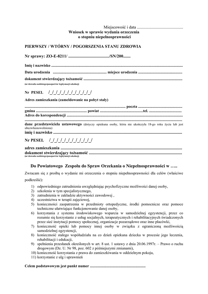 Miejscowość i data ............................................ Wniosek w sprawie wydania orzeczenia o stopniu niepełnosprawności PIERWSZY / WTÓRNY / POGORSZENIA STANU ZDROWIA Nr sprawy: ZO-E-8211/ ......................................./SN/200....... Imię i nazwisko ......................................................................................................................................... Data urodzenia ........................................................ miejsce urodzenia .............................................. dokument stwierdzający tożsamość ....................................................................................................... (nr dowodu osobistego/paszport/nr legitymacji szkolnej) Nr PESEL /_/_/_/_/_/_/_/_/_/_/_/ Adres zamieszkania (zameldowanie na pobyt stały) ......................................................................................................... poczta .............................................. gmina ..................................................... powiat .............................................tel. .................................. Adres do korespondencji ......................................................................................................................... .................................................................................................................................................................... dane przedstawiciela ustawowego (dotyczy opiekuna osoby, która nie ukończyła 18-go roku życia lub jest ubezwłasnowolniona) imię i nazwisko ........................................................................................................................... Nr PESEL /_/_/_/_/_/_/_/_/_/_/_/ adres zamieszkania .................................................................................................................... dokument stwierdzający tożsamość ......................................................................................... (nr dowodu osobistego/paszport/nr legitymacji szkolnej) Do Powiatowego Zespołu do Spraw Orzekania o Niepełnosprawności w ….. Zwracam się z prośbą o wydanie mi orzeczenia o stopniu niepełnosprawności dla celów (właściwe podkreślić): 1) 2) 3) 4) 5) 6) 7) 8) 9) 10) 11) odpowiedniego zatrudnienia uwzględniając psychofizyczne możliwości danej osoby, szkolenia w tym specjalistycznego, zatrudnienia w zakładzie aktywności zawodowej , uczestnictwa w terapii zajęciowej, konieczności zaopatrzenia w przedmioty ortopedyczne, środki pomocnicze oraz pomoce techniczne ułatwiające funkcjonowanie danej osoby, korzystania z systemu środowiskowego wsparcia w samodzielnej egzystencji, przez co rozumie się korzystanie z usług socjalnych, terapeutycznych i rehabilitacyjnych świadczonych przez sieć instytucji pomocy społecznej, organizacje pozarządowe oraz inne placówki, konieczność opieki lub pomocy innej osoby w związku z ograniczoną możliwością samodzielnej egzystencji, konieczność stałego współudziału na co dzień opiekuna dziecka w procesie jego leczenia, rehabilitacji i edukacji, spełnienia przesłanek określonych w art. 8 ust. 1 ustawy z dnia 20.06.1997r. – Prawo o ruchu drogowym (Dz. U. Nr 98, poz. 602 z późniejszymi zmianami), konieczność korzystania z prawa do zamieszkiwania w oddzielnym pokoju, korzystanie z ulg i uprawnień Celem podstawowym jest punkt numer .......................................................... Uzasadnienie wniosku 1. Sytuacja społeczna: stan cywilny ........................................................ stan rodzinny (liczba dzieci) ......................................................... 2. zdolność do samodzielnego funkcjonowania (odpowiednie zaznaczyć): samodzielnie * a) wykonywanie czynności samoobsługowych X b) poruszanie się w środowisku X c) prowadzenie gospodarstwa domowego X z pomocą* X X X 3. korzystanie ze sprzętu rehabilitacyjnego niezbędne / wskazane / zbędne* jakie ............................................................................................. 4. sytuacja zawodowa: wykształcenie ............................................................................................. zawód ........................................................................................................................................... obecne stanowisko pracy: ............................................................................................................. 5. Czy posiada Pan(i) prawo jazdy TAK / NIE* Nr Prawo jazdy ............................................... wydane przez ...................................................... Oświadczenia (odpowiednie podkreślić): 1. Oświadczam, że pobieram (nie pobieram) świadczenia pieniężne: a). z ZUS emerytura renta (od kiedy ............................................) b). z ZUS emerytura renta (od kiedy ...........................................) c). z Pomocy Społecznej (wymienić jakie) ....................................................................................... d). data wydania orzeczenia ZUS lub KRUS ..................................................................................... przyznana grupa .......................................................................................................... (data przyznania .............................................................) (PROSZĘ DOŁĄCZYĆ KSEROKOPIĘ ORZECZENIA) 2. Oświadczam, że aktualnie toczy się / nie toczy się* w mojej sprawie postępowanie przed innym organem orzeczniczym, podać jakim ................................................................................ 3. Oświadczam, że składałem / nie składałem* uprzednio wniosek o ustalenie stopnia niepełnosprawności, jeżeli tak to kiedy Nr sprawy ...................................................................... Z jakim skutkiem ...............................................................................