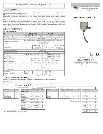 Dziękujemy za wybór aparatury NIVELCO! WIRNIKOWY SYGNALIZATOR POZIOMU 1. ZASTOSOWANIA NIVOROTA E - wirnikowy sygnalizator poziomu służy do sygnalizacji poziomu materiałów sypkich, pyłów, granulatów, materiałów grudkowanych, itp. Montowany na zbiornikach, silosach i lejach samowyładowczych służy do monitorowania i kontroli poziomu, napełniania i opróżniania materiałów takich jak: kamień, lotny popiół, piasek, węgiel, pasza, krajanka buraczana, itp. INSTRUKCJA OBSŁUGI Mały silnik elektryczny napędza śmigło sygnalizatora które obraca się dopóki nie zostanie zablokowane przez materiał. W momencie zablokowania śmigła przez materiał silnik zaczyna obracać się wewnątrz obudowy napinając sprężynę powrotną i pod koniec tego cyklu przełączając dwa przełączniki. Gdy materiał opadnie i zwolni śmigło sygnalizatora sprężyna powrotna przesunie silnik w położenie pracy zwalniając jednocześnie oba przełączniki i sygnalizator zaczyna normalny cykl pracy. 2. DANE TECHNICZNE 2.1 DANE OGÓLNE STANDARDOWY FAIL-SAFE EK - 4 EH - 4 EK - 5 EH - 5 Standardowe urządzenie: 200 mm, wersja rozszerzona: max 3 m TYP Długość czujnika Materiał i liczba łopatek Materiał “części mokrych” Gęstość Temperatura Ciśnienie dopuszczalne Stal nierdzewna DIN 1.4571: 1 – 3,tworzywo: 1 - 4 Stal galwanizowana, stal nierdzewna, tworzywo(epoxyd wzmacniany włóknem szklanym) min. 0,08 kg / dm3 -40°C...+400 °C -40 °C…+400 °C -40°C …+150°C (chłodzone - 40 °C ...+90 °C (chłodzone powietrzem) powietrzem) max. 2 bar - 40 °C … + 65 °C Temperatura otoczenia Wyjście SPDT* 250 V AC, 15 A SPDT* 277 V AC, 5 A – SPDT* 277 V AC, 5 A Wyjście błędu Przyłącze procesowe Napięcie zasilania Przyłącze elektryczne Stopień ochrony elektrycznej Klasa I Stopień ochrony obudowy Materiał obudowy Wykonanie przeciw wybuchowe Masa 2.2 W SKŁAD DYSTRYBUTOR NA POLSKĘ: NIVELCO – POLAND Sp. z o.o. 44-100 Gliwice, ul. Chorzowska 44b Tel.: (0-32) 270 37 01 Fax: (0-32) 270 38 32 Email: [email protected] http://www.nivelco.pl 1½” BSPT, 1¼” NPT, kołnierz montażowy 230 V AC, ±15%, 9 VA; 24 V AC ±15%, 11 VA;** 115 V AC, ±15%, 9 VA; 24 V DC ±15%, 11 W Dławik kablowy:M20x1,5, zacisk śrubowy2,5 mm2, kabel ∅ 10...14 mm IP 66 ATEX II½ DT100°C Malowane aluminium ATEX II½ DT100°C ∼ 4 kg przedłużka: 0,1 kg/m - DOSTAWY WCHODZĄ: instrukcja obsługi, deklaracja zgodności, karta gwarancyjna, uszczelka do kołnierza montażowego 2.3 KOD ZAMÓWIENIA (NIE WSZYSTKIE WARIANTY ZNAKÓW NA ZAMÓWIENIU SĄ MOŻLIWE NIVOROTA E – – FUNKCJA KOD Sygnalizator K Sygnalizator wysokotemp. H WERSJA/ ŚMIGŁO/ PRZYŁĄCZE PROCESOWE Standard / 1 x 1.4571 / 1½” BSPT Standard / 3 x 1.4571 / kołnierz montażowy Standard / 1 x plastic / 1½” BSPT Standard / 4 x plastic / kołnierz montażowy Cable / 1 x 1.4571 / 1½” BSPT Cable / 3 x 1.4571 / kołnierz montażowy *SPDT= styk przełączny SPDT ** E - 5 24 V AC / DC ±15% 11 VA / W DO REALIZACJI) WERSJA KOD KOD H Standard 4 02 0.2 m 1m 10 230 V AC 1 F Wskaz. błędu. 5 03 0.3 m 2m 20 115 V AC 2 3m 30 24 V AC 3 E 24 V DC 4 K L 230 V AC / Ex 115 V AC / Ex 5 6 24 V AC / Ex** 24 V DC / Ex 7 8 M PRZEDŁUŻKA KOD ZASILANIE/ EX KOD KOD 2.4 WYMIARY EKH-402 WERSJA STANDARDOWA EKF-403 EKH-403 EKK-410, -420, -430 WERSJA STANDARDOWA Z ŁĄCZNIKIEM ELASTYCZNYM WERSJA Z PRZEDŁUŻKĄ KABLOWĄ WERSJA WIELOŁOPATKOWA Z ŁĄCZNIKIEM ELASTYCZNYM I KOŁNIERZEM MONTAŻOWYM EH- WERSJA WYSOKOTEMPERATUROWA Ø 141 Ø 141 Ø 141 Ø 141 176 176 Ø 141 1½" BSPT 1½" BSPT SW 60 kołnierzmouting montażowy plate 339 176 SW 60 SW 60 kołnierz montażowy mouting plate 85 183 max. 3.0 m 240 152 428 łącznikflex elastyczny coupling 1½" BSPT 2.5 AKCESORIA 35,2 70 44 152 152 JEDNOŁOPATKOWE ŚMIGŁO ŁUKOWE ZE STALI NIERDZEWNEJ 145 177,8 92 93 R 107 63,5 JEDNOŁOPATKOWE ŚMIGŁO ŁUKOWE Z TWORZYWA TRÓJŁOPATKOWE ŚMIGŁO ZE STALI NIERDZEWNEJ CZTEROŁOPATKOWE ŚMIGŁO Z TWORZYWA Ø 21,3 11,9 Przedłużka kablowa może być przycięta do żądanej długości 1 1/4" NPT short L:0,8, -1,8, -2,8m 89 203 6x Ø8x177,8 48 1 1/2" BSP Łącznik przejściowy powinien być użyty dla króćca 1 ¼” NPT na zbiorniku KOŁNIERZ MONTAŻOWY ŁĄCZNIK ELASTYCZNY PRZEDŁUŻKA KABLOWA PRZEJŚCIÓWKA 3. MONTAŻ Urządzenie powinno być chronione przed silnym strumieniem materiału przez odpowiedni dobór miejsca instalacji lub przez osłonę. Miejsce instalacji powinno być wolne od wstrząsów mechanicznych. minimumodległość distance minimalna of the shelter od osłony 150 mm 150 mm half pipe shelter rury osłona z połówki platez shelter osłona kątownika ZABEZPIECZENIE WIRNIKA WŁAŚCIWIE NIEWŁAŚCIWIE 4. INSTALACJA 6. URUCHOMIENIE/ DZIAŁANIE Przy wykonywaniu specjalnej wersji przedłużki kablowej, dwie śruby na złączu kablowym powinny być poluzowane. Po wyjęciu końcówki, kabel może być skrócony do żądanej długości. Istnieją dwa sposoby instalacji urządzenia. Jeżeli miejsce instalacji jest dostępne od środka zbiornika, wtedy - po zdemontowaniu śmigła – urządzenie powinno być wkręcone w króciec montażowy 1 ½” BSP na dachu lub ścianie zbiornika. Następnie śmigło ponownie montuje się na ośce. Jednakże w większości przypadków, zbiorniki nie są dostępne od środka, tzn. że śmigło nie może być ponownie zamontowane od środka zbiornika. Jednołopatkowe śmigło może być wsunięte do środka przez otwór króćca 1 ½” BSP. Wersje sygnalizatora ze śmigłem wielołopatkowym powinny być montowane za pomocą kołnierza montażowego. Zestaw śmigła i kołnierza montażowego powinien być (używając śrub i uszczelek) instalowany na zbiorniku z odpowiednim otworem w celu wsunięcia śmigła do środka. Po zainstalowaniu i podłączeniu, jeśli zasilanie jest włączone, urządzenie jest gotowe do pracy. Jeśli śmigło obraca się poza materiałem, będzie świecić zielona LED na pokrywie EK-5. Kiedy materiał 