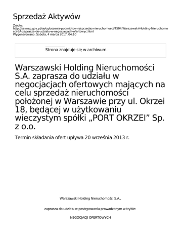 Sprzedaż Aktywów Źródło: http://se.msp.gov.pl/se/ogloszenia-podmiotow-n/sprzedaz-nieruchomosci/4594,Warszawski-Holding-Nieruchomo sci-SA-zaprasza-do-udzialu-w-negocjacjach-ofertowyc.html Wygenerowano: Sobota, 4 marca 2017, 04:10 Strona znajduje się w archiwum. Warszawski Holding Nieruchomości S.A. zaprasza do udziału w negocjacjach ofertowych mających na celu sprzedaż nieruchomości położonej w Warszawie przy ul. Okrzei 18, będącej w użytkowaniu wieczystym spółki „PORT OKRZEI” Sp. z o.o. Termin składania ofert upływa 20 września 2013 r. Warszawski Holding Nieruchomości S.A., zaprasza do udziału w postępowaniu prowadzonym w trybie: NEGOCJACJI OFERTOWYCH mających na celu sprzedaż nieruchomości gruntowej niezabudowanej, będącej w użytkowaniu wieczystym Spółki „PORT OKRZEI” Sp. z o.o., oznaczonej jako działki ewidencyjne o nr 17/2, 17/3, obręb 4-15-05, o łącznej powierzchni 2 405 m2, położonej w Warszawie, dzielnica Praga Północ, ul. Okrzei 18, dla której Sąd Rejonowy Warszawa Mokotów, IX Wydział Ksiąg Wieczystych prowadzi księgę wieczystą nr KW WA3M/00136897/4. Przedmiotowa nieruchomość zlokalizowana jest w Warszawie, na terenie dzielnicy Praga Północ, w niedalekiej odległości od głównych węzłów komunikacyjnych tj. Dworzec Wileński łączący prawostronną część Warszawy z Placem Bankowym (główny węzeł komunikacyjny lewostronnej Warszawy) oraz dzielnicami Starej i Nowej Pragi, Szmulowizny, Pelcowizny, Targówka. Dworzec Wileński jest jednym z głównych węzłów kolei miejskich łączących Warszawę z miejscowościami podwarszawskimi. Przy Dworcu Wileńskim są również prowadzone prace nad budową drugiej linii metra. Nieruchomość nie jest objęta miejscowym planem zagospodarowania przestrzennego. W opracowywanym obecnie projekcje MPZP działki znajdują się na terenie oznaczonym symbolem B1.5 MW/U. W obowiązującym Studium uwarunkowań i kierunków zagospodarowania działka nr 17/2 jest przeznaczona pod zabudowę wielofunkcyjną, centrotwórczą o wysokości zabudowy do 30m, a działka nr 17/3 położona jest w rezerwie terenowej pod rozwój ogólnomiejskiego układu komunikacyjnego. Dla przedmiotowej nieruchomości zostało, w dniu 1 października 2008r., wydane pozwolenie na budowę budynku mieszkalno-usługowego z garażem podziemnym, z wjazdem i zagospodarowaniem terenu na działce o numerze ewidencyjnym 17/2 oraz czasowego parkingu dla samochodów osobowych na działce o numerze ewidencyjnym 17/3. Dnia 07marca 2012r. uzyskano zamienne pozwolenie na budowę, w zakresie ilości, wielkości i struktury mieszkań. Dnia 29.06.2012r. nastąpiło przeniesienie pozwolenia na budowę na obecnego użytkownika wieczystego nieruchomości Spółkę Port Okrzei Sp. z o.o. Charakterystyka Projektu budynku przy ul. Okrzei 18: Ilość budynków: 1 Ilość mieszkań: 68 Ilość lokali usługowych: 10 Ilość miejsc postojowych w garażu: 43 Ilość miejsc postojowych naziemnych: 23 Powierzchnia użytkowa mieszkań: 4 194,74 m2 Powierzchnia użytkowa usług: 695,26 m2 Osoby zainteresowane nabyciem powyższej nieruchomości mogą składać oferty na adres: Warszawski Holding Nieruchomości S. A., CBB Kaskada Al. Jana Pawła II 12, V piętro 00-124 WARSZAWA, z dopiskiem: Oferta na zakup nieruchomości, położonej w Warszawie, przy ul. Okrzei 18 Ofertę należy złożyć w nieprzejrzystej, trwale zamkniętej kopercie w kancelarii Spółki, do godz. 16,00 w nieprzekraczalnym terminie wskazanym poniżej. W przypadku przesłania oferty pocztą pod uwagę będzie brana data nadania przesyłki. Termin składania ofert upływa 20 września 2013r. Negocjacje rozpoczynają się po terminie składania ofert, o czym zostaną powiadomieni oferenci, którzy złożą oferty spełniające warunki formalne oraz proponowana przez nich cena nie będzie odbiegać rażąco od oczekiwań Spółki. Oferty, które wpłyną po terminie nie będą rozpatrywane. Oferta winna być sporządzona w języku polskim, z zachowaniem formy pisemnej pod rygorem nieważności i zawierać informacje o proponowanej cenie netto oraz termin związania ofertą, a także iż oferta stanowi ofertę w rozumieniu art. 66 § 1 Kodeksu cywilnego Osoby przystępujące do udziału w negocjacjach zobowiązane są dołączyć do składanej oferty następujące dokumenty, które w przypadku kopii, powinny być potwierdzone za zgodność z oryginałem przez uprawnione osoby: 1. Pisemne oświadczenie o obowiązku zachowania tajemnicy handlowej, co do informacji dotyczących Spółki uzyskanych w trakcie negocjacji; 2. Osoby fizyczne – dokument potwierdzający tożsamość (kserokopia dowodu osobistego lub paszportu); 3. Przedsiębiorcy wpisani do ewidencji działalności gospodarczej – dokument potwierdzający tożsamość oraz aktualne zaświadczenie o wpisie do ewidencji działalności gospodarczej (wystawione nie wcześniej niż 3 miesiące przed upływem terminu składania ofert) lub wydruk z Centralnej Ewidencji Działalności Gospodarczej; 4. Reprezentanci spółki prawa handlowego – aktualny odpis z Krajowego Rejestru Sądowego (wystawiony nie wcześniej niż 3 miesiące przed upływem terminu składania ofert) lub wydruk z Centralnej Informacji Krajowego Rejestru Sądowego wykazujący umocowanie do reprezentowania danej spółki; 5. Pełnomocnicy – dokument potwierdzający tożsamość i pisemne pełnomocnictwo oraz: ❍ w przypadku osoby prawnej – oryginał aktualnego odpisu z Krajowego Rejestru Sądowego (wystawiony nie wcześniej niż 3 miesiące przed upływem terminu składania ofert) lub wydruk z Centralnej Informacji Krajowego Rejestru Sądowego, wskazujący umocowanie do reprezentowania danej osoby prawnej, ❍ w przypadku przedsiębiorcy wpisanego do ewidencji działalności gospodarczej – oryginał aktualnego zaświadczenia o wpisie do ewidencji działalności gospodarczej (wystawione nie wcześniej niż 3 miesiące przed upływem terminu składan
