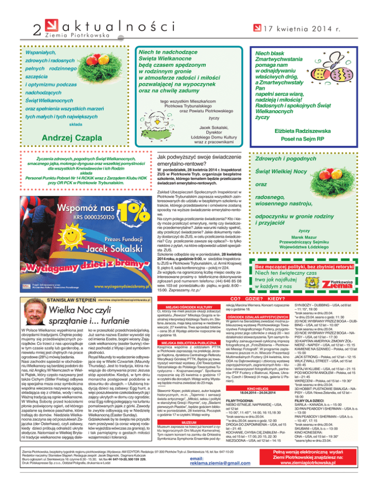 2 aktualności 1 7 k w i e t n i a 2 0 1 4 r. Ziemia Piotrkowska Niech te nadchodzące Swięta Wielkanocne będą czasem spędzonym w rodzinnym gronie w atmosferze radości i miłości pozwalającej na wypoczynek oraz na chwilę zadumy Wspaniałych, zdrowych i radosnych pełnych rodzinnego szczęścia i optymizmu podczas nadchodzących Świąt Wielkanocnych oraz spełnienia wszystkich marzeń tych małych i tych największych Niech blask Zmartwychwstania pomaga nam w odnajdywaniu właściwych dróg, a Zmartwychwstały Pan napełni serca wiarą, nadzieją i miłością! Radosnych i spokojnych Świąt Wielkanocnych życzy tego wszystkim Mieszkańcom Piotrkowa Trybunalskiego oraz Powiatu Piotrkowskiego życzy składa Andrzej Czapla Życzenia zdrowych, pogodnych Świąt Wielkanocnych, smacznego jajka, mokrego dyngusa oraz wszelkiej pomyślności dla wszystkich Krwiodawców i ich Rodzin składa Personel Punktu Pobrań Nr 14 RCKiK wraz z Zarządem Klubu HDK przy OR PCK w Piotrkowie Trybunalskim. Jacek Sokalski, Dyrektor Łódzkiego Domu Kultury wraz z pracownikami Elżbieta Radziszewska Poseł na Sejm RP Jak podwyższyć swoje świadczenie emerytalno-rentowe? Zdrowych i pogodnych W poniedziałek, 28 kwietnia 2014 r. Inspektorat ZUS w Piotrkowie Tryb. organizuje bezpłatne szkolenie, którego tematem będzie przeliczanie świadczeń emerytalno-rentowych. Świąt Wielkiej Nocy oraz Zakład Ubezpieczeń Społecznych Inspektorat w Piotrkowie Trybunalskim zaprasza wszystkich zainteresowanych do udziału w bezpłatnym szkoleniu w trakcie, którego przedstawione i omówione zostaną sposoby na wyższe świadczenie emerytalno-rentowe. Na czym polega przeliczenie świadczenia? Kto i kiedy może przeliczyć emeryturę, rentę czy świadczenie przedemerytalne? Jakie warunki należy spełnić, aby przeliczyć świadczenie? Jakie dokumenty należy dostarczyć do ZUS, w celu przeliczenia świadczenia? Czy przeliczenie zawsze się opłaca?– to tylko niektóre z pytań, na które odpowiedzi udzieli specjalista ZUS. Szkolenie odbędzie się w poniedziałek, 28 kwietnia 2014 roku,o godzinie 9:00, w siedzibie Inspektoratu ZUS w Piotrkowie Trybunalskim, ul. Armii Krajowej 9, piętro II, sala konferencyjna – pokój nr 224. Ze względu na ograniczoną liczbę miejsc osoby zainteresowane prosimy o telefoniczne dokonywanie zgłoszeń pod numerem telefonu: (44) 646 85 08 wew. 103 od poniedziałku do piątku, w godz. 8:00 – 15:00. Zapraszamy./rz. p./ STANISŁAW STĘPIEŃ Wielka Noc czyli sprzątanie i... turlanie W Polsce Wielkanoc wypełniona jest obrzędami i tradycjami.Chętnie podejmujemy się przedświątecznych porządków. Co trzeci z nas uporządkuje w tym czasie szafę lub garderobę, a niewielu mniej jest chętnych na prace ogrodowe (28%) mówią badania. Nasi zachodni sąsiedzi w obchodzeniu Wielkanocy są bardziej podobni do nas, niż Anglicy.W Niemczech w Wielki Piątek, który często nazywany jest także Cichym (Stiller Freitag) odbywa się specjalna msza oraz symboliczna wspólna wieczerza nazywana agapą, składająca się z chleba, wody i wina. Ważną tradycją są ognie wielkanocne. W Wielką Sobotę przed kościołami płonie poświęcony ogień, od którego zapalane są świece paschalne, które trafiają do domów. Niedziela Wielkanocna zaczyna się od poszukiwań Zajączka (der Osterhase), czyli zabawy, kiedy dzieci próbują odnaleźć ukryte słodycze. Natomiast w Wielkiej Brytanii tradycje wielkanocne sięgają dale- CO? [email protected] ko w przeszłość przedchrześcijańską. Już sama nazwa Easter wywodzi się od imienia Eostre, bogini wiosny Zajączek wielkanocny (easter bunny) również pochodzi z Wysp i jest symbolem płodności. Royal Maundy to wydarzenie odbywające się w Wielki Czwartek (Maundy Thursday). Jest to tradycja, która nawiązuje do obmywania przez Jezusa stóp apostołów. Kiedyś, w tym dniu monarcha postępował podobnie w stosunku do ubogich. – Ulubioną tradycją dzieci są zabawy: Egg hunt, a więc poszukiwanie czekoladowych jaj i zajęcy ukrytych w domu czy ogrodzie; oraz Egg rolling polegający na turlaniu pomalowanych jajek z górki. Zawody te zwykle odbywają się w Niedzielę Wielkanocną (Easter Sunday). Gdziekolwiek by te święta nie przyszło nam przeżywać (a coraz więcej rodaków wyjeźdża wówczas za granicę), to i tak pamiętajmy o gestach miłości wzajemności i tolerancji. MIEJSKI OŚRODEK KULTURY Ci, którzy nie mieli jeszcze okazji zobaczyć spektaklu „Rewizor” Mikołaja Gogola w teatralnej interpretacji łódzkiego Teatru im. Stefana Jaracza, maja taką szansę w niedzielny wieczór, 27 kwietnia. Trwa sprzedaż biletów – cena 35 zł. Występ aktorów rozpocznie się o godzinie 18. MIEJSKA BIBLIOTEKA PUBLICZNA Książnica wspólnie z oddziałem PTTK w Piotrkowie zapraszają na prelekcję Jerzego Kapłona, dyrektora Centralnego Referatu Weryfikacji Górskiej PTTK. Będzie jej towarzyszyć wernisaż wystawy „Od Towarzystwa Tatrzańskiego do Polskiego Towarzystwa Turystyczno – Krajoznawczego”. Spotkanie rozpocznie się 25 kwietnia o godzinie 17 w czytelni dla dorosłych.Wstęp wolny.Wystawę będzie można zwiedzać do 23 maja. ****** Sławomir Koper, polski pisarz, autor książek historycznych, m.in. „Tajemnic i sensacji świata antycznego”, „Miłości, seksu i polityki w starożytnej Grecji i Rzymie”, czy „Śladami pierwszych Piastów”, będzie gościem biblioteki w poniedziałek, 28 kwietnia. Początek o godzinie 17 w czytelni.Wstęp wolny. MUZEUM Muzeum zaprasza na trzeci już koncert z cyklu tegorocznych Dni Muzyki Kameralnej. Tym razem koncert na zamku da Orkiestra Symfoniczna Symphonix Ensemble pod dy- radosnego, wiosennego nastroju, odpoczynku w gronie rodziny i przyjaciół życzy Marek Mazur Przewodniczący Sejmiku Województwa Łódzkiego Bez męczącej polityki, bez zbytniej retoryki N i ech t en ś w ią te cz n y c z as tr w a ja k na j dł uż ej w każ d ym z n as GDZIE? KIEDY? rekcją Marcina W