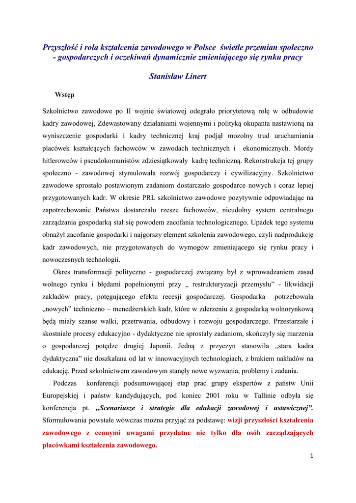Przyszłość i rola kształcenia zawodowego w Polsce świetle przemian społeczno - gospodarczych i oczekiwań dynamicznie zmieniającego się rynku pracy Stanisław Linert Wstęp Szkolnictwo zawodowe po II wojnie światowej odegrało priorytetową rolę w odbudowie kadry zawodowej, Zdewastowany działaniami wojennymi i polityką okupanta nastawioną na wyniszczenie gospodarki i kadry technicznej kraj podjął mozolny trud uruchamiania placówek kształcących fachowców w zawodach technicznych i ekonomicznych. Mordy hitlerowców i pseudokomunistów zdziesiątkowały kadrę techniczną. Rekonstrukcja tej grupy społeczno - zawodowej stymulowała rozwój gospodarczy i cywilizacyjny. Szkolnictwo zawodowe sprostało postawionym zadaniom dostarczało gospodarce nowych i coraz lepiej przygotowanych kadr. W okresie PRL szkolnictwo zawodowe pozytywnie odpowiadając na zapotrzebowanie Państwa dostarczało rzesze fachowców, nieudolny system centralnego zarządzania gospodarką stał się powodem zacofania technologicznego. Upadek tego systemu obnażył zacofanie gospodarki i najgorszy element szkolenia zawodowego, czyli nadprodukcję kadr zawodowych, nie przygotowanych do wymogów zmieniającego się rynku pracy i nowoczesnych technologii. Okres transformacji polityczno - gospodarczej związany był z wprowadzaniem zasad wolnego rynku i błędami popełnionymi przy „ restrukturyzacji przemysłu” - likwidacji zakładów pracy, potęgującego efektu recesji gospodarczej. Gospodarka potrzebowała „nowych” techniczno – menedżerskich kadr, które w zderzeniu z gospodarką wolnorynkową będą miały szanse walki, przetrwania, odbudowy i rozwoju gospodarczego. Przestarzałe i skostniałe procesy edukacyjno - dydaktyczne nie sprostały zadaniom, skończyły się marzenia o gospodarczej potędze drugiej Japonii. Jedną z przyczyn stanowiła „stara kadra dydaktyczna” nie doszkalana od lat w innowacyjnych technologiach, z brakiem nakładów na edukację. Przed szkolnictwem zawodowym stanęły nowe wyzwania, problemy i zadania. Podczas konferencji podsumowującej etap prac grupy ekspertów z państw Unii Europejskiej i państw kandydujących, pod koniec 2001 roku w Tallinie odbyła się konferencja pt. „Scenariusze i strategie dla edukacji zawodowej i ustawicznej”. Sformułowania powstałe wówczas można przyjąć za podstawę: wizji przyszłości kształcenia zawodowego z cennymi uwagami przydatne nie tylko dla osób zarządzających placówkami kształcenia zawodowego. 1 Mottem konferencji w Tallinie mógłby być fragment publikacji nt. edukacji dla przyszłości, Frederico Mayor’a – Dyrektora Generalnego UNESCO, który wypowiedział ważne słowa: (…)Kiedy patrzymy w przyszłość, stajemy twarzą w twarz z wieloma wątpliwościami dotyczącymi świata, w którym będą żyć nasze dzieci, wnuki i prawnuki, ale możemy być pewni przynajmniej jednej rzeczy: jeśli chcemy, żeby Ziemia zaspokajała potrzeby swoich mieszkańców, ludzkość musi przejść głęboką transformację. Świat jutra musi być diametralnie rożny od świata, który znamy, wstępując w XXI wiek i nowe millenium. (...) (…) Musimy przemyśleć sposób organizowania wiedzy. Oznacza to zerwanie z tradycyjnymi barierami pomiędzy dyscyplinami i utworzenie nowych sposobów na ponowne powiązanie tego, co zostało rozdzielone. Musimy zaplanować od nowa (przeformułować) politykę edukacyjną i programy, a wdrażając te reformy, musimy cały czas pamiętać o długofalowości i naszej ogromnej odpowiedzialności wobec przyszłych pokoleń.” Zasadniczym celem konferencji było wypracowanie modelu rozwoju sytuacji w obszarze edukacji zawodowej, w kontekście możliwości i wariantów rozwoju sytuacji w poszczególnych krajach z przewidywanymi procesami globalizacji gospodarczej i zmianami w procesach społecznych. 1. Warunki dobrego funkcjonowania edukacji zawodowej Udział w Tallinie przedstawicieli z „byłego bloku wschodniego”, pozwolił dostrzec ogrom różnic i podejścia do problematyki widzianej oczami państw zachodnich. Niezależnie od przewidywań eksperci zgadzali się, z podstawami i warunkami dobrego funkcjonowania edukacji zawodowej opartymi o: a. dobry poziom kształcenia podstawowego i ogólnego, b. partnerstwo społeczne w planowaniu i realizacji szkoleń zawodowych przez różne podmioty społeczne, c. współpraca edukacji z gospodarką poprzez dostosowanie treści kształcenia do warunków i wymogów rynku pracy, d. elastyczność szkoleń zawodowych, i uzyskiwania certyfikatów kwalifikacyjnych, Podejmując próbę reformy systemu szkolnictwa w Polsce opartego o model wiedzy encyklopedycznej zdecydowano się zastąpić go, wdrożeniem nauczania kreatywnego myślenia z umiejętnościami twórczego działania. Taki kierunek nauki i edukacji w odczuciu twórców reformy miały stworzyć potencjał intelektualny zdolny do spotęgowania aktywności 2 gospodarczej. W efekcie reforma przyniosła kontrowersyjne rozwiązania w odniesieniu do szkolnictwa zawodowego. Reformatorzy zapomnieli o jednym z istotnych problemów: W okresie dynamicznego rozwoju gospodarczego i przekształceń społeczno-gospodarczych reforma szkolnictwa musi wyprzedzać zmiany, przewidując nowe drogi rozwoju. Takie uwarunkowania są możliwe gdy szkolnictwo zawodowe dysponuje dobrze wykształconymi kadrami technicznymi znającymi problemy i potrzeby gospodarki. Po pierwsze działania reformatorskie mogą podjąć i wdrażać kadry nowoczesne i otwarte na innowacje. Proponowany model kształcenia zakładał zwiększenie kształcenia ogólnego do 80%, i ograniczenia kształcenia zawodowego do 20% przy wzroście współczynnika szkolnictwa wyższego do 65% w 2010 roku. Przesuwając kształcenie zawodowe na poziom szkół policealnych i wyższych. Takie argumentowanie bez analizy przyczyn przy zachowaniu propozycji 80/20 może skutkować likwidacją lub reorganizacją szkół zawodowych. Drugim negatywnym argumentem