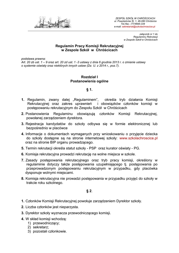 ZESPÓŁ SZKÓŁ W CHRÓŚCICACH ul. Powstańców Śl. 1, 46-080 Chróścice Tel./fax.: /77/4695-334 e-mail: [email protected] załącznik nr 1 do Regulaminu Rekrutacji w Zespole Szkół w Chróścicach Regulamin Pracy Komisji Rekrutacyjnej w Zespole Szkół w Chróścicach podstawa prawna: Art. 20 zb ust. 1 – 9 oraz art. 20 zd ust. 1 -3 ustawy z dnia 6 grudnia 2013 r. o zmianie ustawy o systemie oświaty oraz niektórych innych ustaw (Dz. U. z 2014 r., poz.7). Rozdział I Postanowienia ogólne § 1. 1. Regulamin, zwany dalej „Regulaminem”, określa tryb działania Komisji Rekrutacyjnej oraz zakres uprawnień i obowiązków członków komisji w postępowaniu rekrutacyjnym do Zespołu Szkół w Chróścicach 2. Postanowienia Regulaminu obowiązują powołanej zarządzeniem dyrektora. członków Komisji Rekrutacyjnej, 3. Rejestracja kandydatów do szkoły odbywa się w formie elektronicznej lub bezpośrednio w placówce 4. Informacje o dokumentach wymaganych przy wnioskowaniu o przyjęcie dziecka do szkoły dostępne są na stronie internetowej szkoły: www.szkolachroscice.pl oraz na stronie BIP organu prowadzącego. 5. Termin rekrutacji określa statut szkoły - PSP oraz kurator oświaty - PG. 6. Komisja rekrutacyjna prowadzi rekrutację na wolne miejsca w szkole. 7. Zasady postępowania rekrutacyjnego oraz tryb pracy komisji, określony w regulaminie dotyczy także postępowania uzupełniającego tj. postępowania po przeprowadzonym postępowaniu rekrutacyjnym w przypadku, gdy placówka dysponuje wolnymi miejscami. 8. Komisja rekrutacyjna nie prowadzi postępowania w przypadku przyjęć do szkoły w trakcie roku szkolnego. § 2. 1. Członków Komisji Rekrutacyjnej powołuje zarządzeniem Dyrektor szkoły. 2. Liczba członków jest nieparzysta. 3. Dyrektor szkoły wyznacza przewodniczącego komisji. 4. W skład komisji wchodzą: 1) przewodniczący; 2) sekretarz; 3) pozostali członkowie. 5. Członkowie komisji są zobowiązani do podpisania oświadczenia o ochronie danych osobowych kandydatów i rodziców/opiekunów kandydatów udostępnianych w procesie rekrutacji. Rozdział II Tryb odbywania posiedzeń § 3. 1. Posiedzenie Komisji Rekrutacyjnej odbywa się w terminie określonym w statucie szkoły podanym do publicznej informacji. 2. Przewodniczący komisji jest uprawniony do zwoływania posiedzeń w trybie nadzwyczajnym. 3. Posiedzenie Komisji Rekrutacyjnej zwołuje, prowadzi i nadzoruje Przewodniczący komisji. 4. Udział w posiedzeniach komisji jest obowiązkowy dla wszystkich jej członków. 5. Członkowie komisji mają prawo do wglądu do wszystkich dokumentów związanych z pracą komisji tj. do złożonych wniosków rekrutacyjnych wraz z załącznikami. 6. Posiedzenia komisji są protokołowane. Protokół z posiedzenia zawiera: datę, skład osobowy, ustalenia komisji. Protokół podpisywany jest przez przewodniczącego i członków. 7. Obsługę administracyjno-biurową komisji prowadzi sekretariat szkoły. Rozdział III Zadania i uprawnienia Komisji Rekrutacyjnej § 4. 1. Do zadań Komisji Rekrutacyjnej należy w szczególności: 1) dokonanie merytorycznej załącznikami; oceny wniosków rekrutacyjnych wraz z 2) ustalenie wyników postępowania rekrutacyjnego; 3) podanie do publicznej wiadomości listy kandydatów przyjętych do szkoły, zgodnie z wymogami art. 20 zc ust. 4, wywieszonej w widocznym miejscu w siedzibie placówki, zawierającej imiona i nazwiska kandydatów uszeregowane w kolejności alfabetycznej oraz najniższą liczbę punktów, która uprawniała do przyjęcia. Wzór listy kandydatów przyjętych jest załącznikiem nr 1 do Regulaminu; 4) podanie do publicznej wiadomości listy kandydatów nieprzyjętych do szkoły – załącznik nr 2 do regulaminu; 5) w przypadku mniejszej liczby kandydatów na liście przyjętych podaje się liczbę wolnych miejsc; 6) sporządzenie protokołu postępowania rekrutacyjnego, zgodnie z załącznikiem nr 3; 7) sporządzanie, w terminie 5 dni od dnia wystąpienia przez rodzica/opiekuna kandydata, uzasadnień odmowy przyjęcia kandydata. Uzasadnienie odmowy przyjęcia zawiera: przyczyny odmowy, w tym najniższą liczbę punktów, która uprawniała do przyjęcia oraz liczbę punktów, którą kandydat uzyskał w postępowaniu rekrutacyjnym; 8) w przypadku wolnych miejsc w placówce, przeprowadzenie w terminie do końca sierpnia roku szkolnego poprzedzającego rok szkolny, uzupełniającego postępowania rekrutacyjnego według tych samych zasad, w przypadku wolnych miejsc w placówce 2. Przewodniczący Komisji Rekrutacyjnej może żądać od rodziców/opiekunów prawnych dokumentów potwierdzających okoliczności zawarte w oświadczeniach potwierdzających spełnianie kryteriów, o których mowa w statucie szkoły. Termin dostarczenia potwierdzeń wyznacza przewodniczący. 3. Przewodniczący Komisji Rekrutacyjnej może zwracać się do wójta/burmistrza, prezydenta miasta właściwego ze względu na miejsce zamieszkania kandydata o potwierdzenie okoliczności zawartych w oświadczeniach, o których mowa w ust. 2. Organ jest zobowiązany do potwierdzenia okoliczności w terminie 14 dni. 4. Członkowie komisji rzetelnie i obiektywnie wykonują powierzone im czynności, kierując się wyłącznie przepisami prawa. § 5. 1. Do obowiązków członków komisji należy w szczególności: 1) uczestniczenie we wszystkich posiedzeniach komisji; 2) czynny udział w pracach komisji; 3) wykonywanie poleceń Przewodniczącego; 4) zapoznanie się z przepisami regulującymi rekrutację do placówki; 5) ochrona danych osobowych kandydatów i rodziców/opiekunów kandydatów; § 6. 1. Do obowiązków szczególności: Przewodniczącego Komisji Rekrutacyjnej należy w 1) zapoznanie członków komisji z regulacjami prawnymi naboru do szkoły; 2) opracowanie harmonogramu posiedzeń komisji oraz porządku zebrań; 3) zawiadomienie członków komisji o terminie i miejscu zebrań komisji; 4) dostarczenie na posiedzenie komisji dokumentacji kandyda