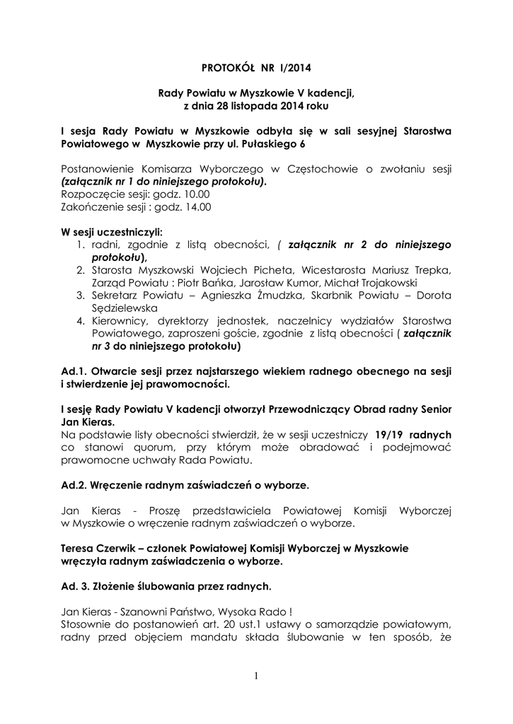 PROTOKÓŁ NR I/2014 Rady Powiatu w Myszkowie V kadencji, z dnia 28 listopada 2014 roku I sesja Rady Powiatu w Myszkowie odbyła się w sali sesyjnej Starostwa Powiatowego w Myszkowie przy ul. Pułaskiego 6 Postanowienie Komisarza Wyborczego w Częstochowie o zwołaniu sesji (załącznik nr 1 do niniejszego protokołu). Rozpoczęcie sesji: godz. 10.00 Zakończenie sesji : godz. 14.00 W sesji uczestniczyli: 1. radni, zgodnie z listą obecności, ( załącznik nr 2 do niniejszego protokołu), 2. Starosta Myszkowski Wojciech Picheta, Wicestarosta Mariusz Trepka, Zarząd Powiatu : Piotr Bańka, Jarosław Kumor, Michał Trojakowski 3. Sekretarz Powiatu – Agnieszka Żmudzka, Skarbnik Powiatu – Dorota Sędzielewska 4. Kierownicy, dyrektorzy jednostek, naczelnicy wydziałów Starostwa Powiatowego, zaproszeni goście, zgodnie z listą obecności ( załącznik nr 3 do niniejszego protokołu) Ad.1. Otwarcie sesji przez najstarszego wiekiem radnego obecnego na sesji i stwierdzenie jej prawomocności. I sesję Rady Powiatu V kadencji otworzył Przewodniczący Obrad radny Senior Jan Kieras. Na podstawie listy obecności stwierdził, że w sesji uczestniczy 19/19 radnych co stanowi quorum, przy którym może obradować i podejmować prawomocne uchwały Rada Powiatu. Ad.2. Wręczenie radnym zaświadczeń o wyborze. Jan Kieras - Proszę przedstawiciela Powiatowej Komisji w Myszkowie o wręczenie radnym zaświadczeń o wyborze. Wyborczej Teresa Czerwik – członek Powiatowej Komisji Wyborczej w Myszkowie wręczyła radnym zaświadczenia o wyborze. Ad. 3. Złożenie ślubowania przez radnych. Jan Kieras - Szanowni Państwo, Wysoka Rado ! Stosownie do postanowień art. 20 ust.1 ustawy o samorządzie powiatowym, radny przed objęciem mandatu składa ślubowanie w ten sposób, że 1 odczytuje treść ślubowania i wypowiada słowo „ślubuję”. Może być również dodane zdanie „Tak mi dopomóż Bóg”. Radni zostaną wywołani kolejno przez radnego juniora (informuję, że radnym juniorem jest radny Michał Trojakowski ), radni powstają i składają ślubowanie – treść ślubowania została rozdana wszystkim radnym. Odmowa złożenia ślubowania oznacza zrzeczenie się mandatu . Proszę wszystkich o powstanie, a radnego juniora o kolejne odczytywanie nazwisk . Wszyscy obecni na sesji rady wstają z miejsc. Radny Junior Michał Trojakowski odczytał kolejno według listy alfabetycznej nazwiska radnych: 1. Bańka Piotr 2. Grabowski Jakub 3. Jastrzębski Andrzej 4. Kaim Hagar Dorota 5. Kępski Rafał 6. Kieras Jan 7. Kolasa Gotkowska Grażyna 8. Kołodziejczyk Piotr 9. Kumor Jarosław 10. Lasecki Dariusz 11. Lazar Józef 12. Morawiec Mariusz 13. Musialik Mariusz 14. Picheta Wojciech 15. Ruciński Sebastian 16. Służałek Jaworska Danuta 17. Socha Korendo Anna 18. Trepka Mariusz 19. Trojakowski Michał Radni kolejno oczytali treść ślubowania. Wszyscy obecni na sesji radni złożyli ślubowanie. Ad.4. Ustalenie porządku obrad. Jan Kieras - Otrzymaliście Państwo zawiadomienie wraz z porządkiem obrad. Czy są inne propozycje i inne uwagi do zaproponowanego porządku? Rafał Kępski – Chciałbym zgłosić wniosek formalny o uzupełnienie i zmianę porządku obrad o nst. punkty: ( ww. wniosek stanowi załącznik nr 4 do niniejszego protokołu) Pkt 5 – Powołanie Komisji Uchwał i wniosków Pkt 6. Powołanie Komisji Skrutacyjnej. Rozszerzenie pkt 7.Wybór przewodniczącego Rady Powiatu w Myszkowie. a)zgłaszanie kandydatów na funkcję przewodniczącego rady powiatu b) prezentacja kandydatów 2 c) przyjęcie regulaminu wyboru przewodniczącego Rady Powiatu w Myszkowie – podjęcie uchwały, d) przeprowadzenie tajnego głosowania e)podjęcie uchwały w sprawie: wyboru Przewodniczącego Rady Powiatu w Myszkowie Rozszerzenie punktu 9. Wybór wiceprzewodniczących Rady powiatu a)zgłaszanie kandydatów na wiceprzewodniczących Rady powiatu b) prezentacja kandydatów c) przyjęcie regulaminu wyboru na wiceprzewodniczących rady powiatu– podjęcie uchwały, d) przeprowadzenie tajnego głosowania e)podjęcie uchwały w sprawie: wyboru Wiceprzewodniczących Rady Powiatu w Myszkowie wprowadzenie dodatkowych punktów: Pkt 10. Wybór Starosty Myszkowskiego. a)zgłaszanie kandydatów na Starostę Myszkowskiego b) prezentacja kandydatów c) przyjęcie regulaminu wyboru starosty Myszkowskiego – podjęcie uchwały, d) przeprowadzenie tajnego głosowania e)podjęcie uchwały stwierdzającej wybór Starosty Myszkowskiego 11. Wybór Wicestarosty Myszkowskiego. a)wniosek Starosty Myszkowskiego i prezentacja kandydata na wicestarostę b) przyjęcie regulaminu wyboru na wicestarostę – podjęcie uchwały, c) przeprowadzenie tajnego głosowania d)podjęcie uchwały w sprawie: wyboru wicestarosty myszkowskiego 12. Wybór pozostałych członków zarządu powiatu. a) wniosek Starosty Myszkowskiego i prezentacja kandydatów na pozostałych członków zarządu Powiatu. c) przyjęcie regulaminu wyboru na członków zarządu Powiatu – podjęcie uchwały, d) przeprowadzenie tajnego głosowania e)podjęcie uchwały w sprawie: wyboru pozostałych członków zarządy Powiatu Myszkowskiego 13. Wnioski i oświadczenia radnych. Panie przewodniczący po wprowadzeniu dodatkowych punktów ziemi numeracja Joanna Cień – Radca Prawny - Z małą uwagą: podjęcie uchwały w przypadku przyjęcia regulaminu głosowań, tylko ta mała zmiana. W wyniku głosowania, Rada Powiatu – jednogłośnie, przy 19 głosach „za” wprowadziła zaproponowane zmiany do porządku obrad sesji. Jan Kieras – Przewodniczący Obrad – przedstawił nst. porządek obrad, po wprowadzonych zmianach. 3 PORZĄDEK OBRAD I SESJI, po wprowadzonych zmianach: 1. Otwarcie sesji przez najstarszego wiekiem radnego obecnego na sesji i stwierdzenie jej prawomocności. 2. Wręczenie radnym zaświadczeń o wyborze. 3. Złożenie ślubowania przez radnych. 4. Ustalenie porządku obrad. 5. Powołanie Komisji Uchwał i Wniosków. 6. Powołanie Komisji Skruta