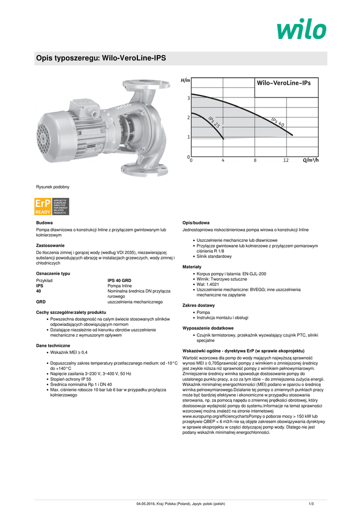 Opis typoszeregu: Wilo-VeroLine-IPS Rysunek podobny Budowa Opis/budowa Pompa dławnicowa o konstrukcji Inline z przyłączem gwintowanym lub kołnierzowym Jednostopniowa niskociśnieniowa pompa wirowa o konstrukcji Inline Zastosowanie Do tłoczenia zimnej i gorącej wody (według VDI 2035), niezawierającej substancji powodujących abrazję w instalacjach grzewczych, wody zimnej i chłodniczych Oznaczenie typu Przykład IPS 40 GRD IPS 40 GRD Pompa Inline Nominalna średnica DN przyłącza rurowego uszczelnienia mechanicznego Cechy szczególne/zalety produktu Powszechna dostępność na całym świecie stosowanych silników odpowiadających obowiązującym normom Działające niezależnie od kierunku obrotów uszczelnienie mechaniczne z wymuszonym opływem Uszczelnienie mechaniczne lub dławnicowe Przyłącze gwintowane lub kołnierzowe z przyłączem pomiarowym ciśnienia R 1/8 Silnik standardowy Materiały Korpus pompy i latarnia: EN‐GJL‐200 Wirnik: Tworzywo sztuczne Wał: 1.4021 Uszczelnienie mechaniczne: BVEGG; inne uszczelnienia mechaniczne na zapytanie Zakres dostawy Pompa Instrukcja montażu i obsługi Wyposażenie dodatkowe Czujnik termistorowy, przekaźnik wyzwalający czujnik PTC, silniki specjalne Dane techniczne Wskazówki ogólne - dyrektywa ErP (w sprawie ekoprojektu) Wskaźnik MEI ≥ 0,4 Dopuszczalny zakres temperatury przetłaczanego medium: od -10°C do +140°C Napięcie zasilania 3~230 V, 3~400 V, 50 Hz Stopień ochrony IP 55 Średnica nominalna Rp 1 i DN 40 Max. ciśnienie robocze 10 bar lub 6 bar w przypadku przyłącza kołnierzowego Wartość wzorcowa dla pomp do wody mających najwyższą sprawność wynosi MEI ≥ 0,70Sprawność pompy z wirnikiem o zmniejszonej średnicy jest zwykle niższa niż sprawność pompy z wirnikiem pełnowymiarowym. Zmniejszenie średnicy wirnika spowoduje dostosowanie pompy do ustalonego punktu pracy, a co za tym idzie – do zmniejszenia zużycia energii. Wskaźnik minimalnej energochłonności (MEI) podano w oparciu o średnicę wirnika pełnowymiarowego.Działanie tej pompy o zmiennych punktach pracy może być bardziej efektywne i ekonomiczne w przypadku stosowania sterowania, np. za pomocą napędu o zmiennej prędkości obrotowej, który dostosowuje wydajność pompy do systemu.Informacje na temat sprawności wzorcowej można znaleźć na stronie internetowej www.europump.org/efficiencychartsPompy o poborze mocy > 150 kW lub przepływie QBEP < 6 m3/h nie są objęte zakresem obowiązywania dyrektywy w sprawie ekoprojektu w części dotyczącej pomp wody. Dlatego nie jest podany wskaźnik minimalnej energochłonności. 04.05.2016, Kraj: Polska (Poland), Język: polski (polish) 1/3 Rodzina charakterystyk: Wilo-VeroLine-IPS Charakterystyki 04.05.2016, Kraj: Polska (Poland), Język: polski (polish) 2/3 Lista produktów: Wilo-VeroLine-IPS Typ Minimum Kołnierze (wg EN Średnica Złączka Długość Efficiency Index 1092-2) PN nominalna gwintowana montażowa l0 (MEI) Nr art. silnika P2 kołnierza IPS 25 - PN 10 - Rp 1 180 mm 0,12 kW 12 kg 121347394 IPS 40 ≥ 0,4 PN 6 DN 40 - 250 mm 0,18 kW 20 kg 121347590 IPS 40 ≥ 0,4 PN 10 DN 40 - 250 mm 0,18 kW 20 kg 121347795 Wilo-VeroLine-IPS Powered by TCPDF (www.tcpdf.org) Znamionowa moc Masa netto ok. m 3/3