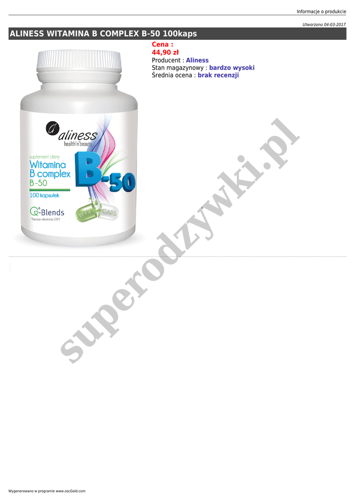 Informacje o produkcie Utworzono 04-03-2017 ALINESS WITAMINA B COMPLEX B-50 100kaps Cena : 44,90 zł su pe ro dz y w ki .p l Producent : Aliness Stan magazynowy : bardzo wysoki Średnia ocena : brak recenzji Wygenerowano w programie www.oscGold.com Kwas foliowy przyczynia się do prawidłowej produkcji krwi. Witaminy B6 i B12 biorą udział w produkcji prawidłowych krwinek czerwonych, a ryboflawina wspiera ich prawidłowe funkcjonowanie. Witaminy B12 i kwas foliowy biorą udział w podziałach komórek. Tiamina przyczynia się do prawidłowego funkcjonowania serca. Witaminy B6, B12, niacyna, kwas pantotenowy, ryboflawina i kwas foliowy przyczyniają się do zmniejszenia uczucia zmęczenia i znużenia. Witaminy E i ryboflawina chronią komórki organizmu przed stresem oksydacyjnym. Ryboflawina przyczynia się do jego prawidłowego metabolizmu żelaza. Witaminy B6, B12 i kwas foliowy przyczyniają się do prawidłowego funkcjonowania układu odpornościowego. Witaminy B6, B12, biotyna, niacyna i tiamina biorą udział w prawidłowym funkcjonowaniu układu nerwowego. Kwas foliowy przyczynia się do prawidłowej produkcji białek. Witaminy B6, B12, biotyna, kwas pantotenowy, niacyna,ryboflawina i tiamina przyczyniają się do prawidłowego przebiegu procesów uzyskiwania energii. Biotyna, niacyna i ryboflawina wspierają prawidłowe funkcjonowanie skóry i błon śluzowych. Biotyna bierze udział w utrzymaniu zdrowych włosów. Biotyna przyczynia się do prawidłowego metabolizmu białek, tłuszczów i węglowodanów. Witaminy B6, B12, kwas foliowy oraz cholina biorą udział w prawidłowym metabolizmie homocysteiny, witamina B6 dodatkowo w prawidłowej syntezie cysteiny. Cholina przyczynia się do prawidłowego metabolizmu cholesterolu. Cholina podtrzymuje prawidłowe funkcje wątroby. Witaminy B6, B12, biotyna, niacyna, kwas foliowy, kwas pantotenowy i tiamina przyczyniają się do prawidłowych funkcji psychologicznych takich jak koncentracja uwagi, zapamiętywanie i proces uczenia się. Ryboflawina przyczynia się do prawidłowego widzenia i funkcjonowania układu nerwowego. Kwas foliowy przyczynia się do prawidłowego rozwoju łożyska oraz płodu w czasie ciąży. Witamina B6 bierze udział w prawidłowym metabolizmie białek i glikogenu. .p l Witamina B6 bierze udział w regulacji aktywności hormonalnej organizmu człowieka. Kwas pantotenowy przyczynia się do prawidłowej produkcji i metabolizmu hormonów steroidowych, witaminy D oraz niektórych neuroprzekaźników. Składniki: 1 kapsułka (zalecana porcja dzienna) 83 mg 50 mg 50 mg 50 mg 50 mg 50 mg 50 mg 50 mg 400 µg 50 µg 50 µg %RWS* ** 833% 4545% 3571% 3571% 313% ** ** 200% 2000% 100% ki Składniki Cholina Kwas pantotenowy Tiamina Ryboflawina (witamina B2) Witamina B6 Niacyna Inozytol Kwas p-aminobenzoesowy (PABA) Kwas foliowy Witamina B12 Biotyna Ilość netto: 100 kapsułek Przechowywanie: Przechowywać w temperaturze pokojowej, w suchym miejscu niedostępnym dla małych dzieci. Kraj pochodzenia: Polska MedicaLine Wyspiańskiego 8a Dawkowanie: pe 05-400 Otwock ro dz y w *RWS - referencyjna dzienna wartość spożycia ** referencyjna wartość spożycia nie została ustalona Składniki: Cholina, Kwas pantotenowy (D-pantotenian wapnia), Tiamina (chlorowodorek tiaminy), Witamina B2 (Ryboflawina), Witamina B6 (chlorowodorek pirydoksyny), Niacyna (amid kwasu nikotynowgo), Inozytol, Kwas p-aminobenzoesowy (PABA), Celuloza mikrokrystaliczna (substancja wypełniająca), Kwas foliowy (kwas pteroilomonoglutaminowy), Witamina B12 (cyjanokobalamina), Biotyna (D-biotyna). Składniki otoczki: Hydroksypropylometyloceluloza (HPMC) su Zalecane spożycie: 1 kapsułka jeden raz dziennie w trakcie posiłku.