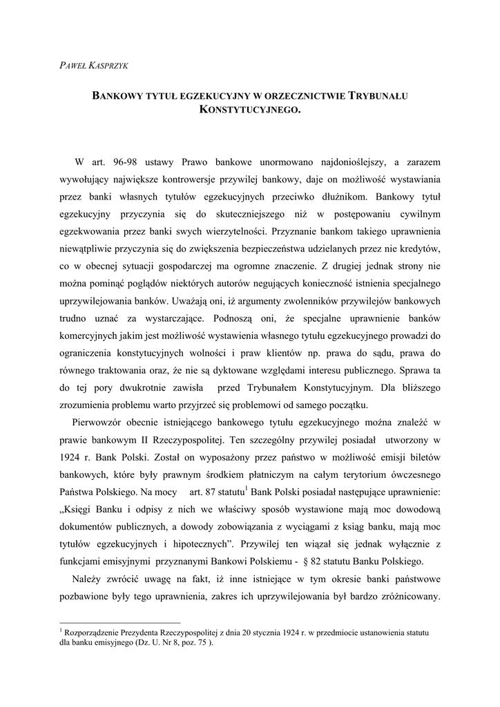 PAWEŁ KASPRZYK BANKOWY TYTUŁ EGZEKUCYJNY W ORZECZNICTWIE TRYBUNAŁU KONSTYTUCYJNEGO. W art. 96-98 ustawy Prawo bankowe unormowano najdonioślejszy, a zarazem wywołujący największe kontrowersje przywilej bankowy, daje on możliwość wystawiania przez banki własnych tytułów egzekucyjnych przeciwko dłużnikom. Bankowy tytuł egzekucyjny przyczynia się do skuteczniejszego niż w postępowaniu cywilnym egzekwowania przez banki swych wierzytelności. Przyznanie bankom takiego uprawnienia niewątpliwie przyczynia się do zwiększenia bezpieczeństwa udzielanych przez nie kredytów, co w obecnej sytuacji gospodarczej ma ogromne znaczenie. Z drugiej jednak strony nie można pominąć poglądów niektórych autorów negujących konieczność istnienia specjalnego uprzywilejowania banków. Uważają oni, iż argumenty zwolenników przywilejów bankowych trudno uznać za wystarczające. Podnoszą oni, że specjalne uprawnienie banków komercyjnych jakim jest możliwość wystawienia własnego tytułu egzekucyjnego prowadzi do ograniczenia konstytucyjnych wolności i praw klientów np. prawa do sądu, prawa do równego traktowania oraz, że nie są dyktowane względami interesu publicznego. Sprawa ta do tej pory dwukrotnie zawisła przed Trybunałem Konstytucyjnym. Dla bliższego zrozumienia problemu warto przyjrzeć się problemowi od samego początku. Pierwowzór obecnie istniejącego bankowego tytułu egzekucyjnego można znaleźć w prawie bankowym II Rzeczypospolitej. Ten szczególny przywilej posiadał utworzony w 1924 r. Bank Polski. Został on wyposażony przez państwo w możliwość emisji biletów bankowych, które były prawnym środkiem płatniczym na całym terytorium ówczesnego Państwa Polskiego. Na mocy art. 87 statutu1 Bank Polski posiadał następujące uprawnienie: „Księgi Banku i odpisy z nich we właściwy sposób wystawione mają moc dowodową dokumentów publicznych, a dowody zobowiązania z wyciągami z ksiąg banku, mają moc tytułów egzekucyjnych i hipotecznych”. Przywilej ten wiązał się jednak wyłącznie z funkcjami emisyjnymi przyznanymi Bankowi Polskiemu - § 82 statutu Banku Polskiego. Należy zwrócić uwagę na fakt, iż inne istniejące w tym okresie banki państwowe pozbawione były tego uprawnienia, zakres ich uprzywilejowania był bardzo zróżnicowany. 1 Rozporządzenie Prezydenta Rzeczypospolitej z dnia 20 stycznia 1924 r. w przedmiocie ustanowienia statutu dla banku emisyjnego (Dz. U. Nr 8, poz. 75 ). Wynikało to stąd, iż ówcześnie istniejące banki nie podlegały jednolitej, wspólnej regulacji prawnej. Zadani, prawa i obowiązki każdego z nich były kształtowane w odrębnych aktach prawnych, stanowiących źródło ich powstania oraz określenia ich statusu prawnego. Po zakończeniu drugiej wojny światowej system bankowy w Polsce uległ znacznemu przeobrażeniu. Państwo przejęło całkowitą kontrolę nad bankami, czyniąc z systemu bankowego narzędzie władzy mające na celu realizację jednolitej polityki gospodarczej. Konsekwencją takiego stanu rzeczy był rozwój różnego rodzaju przywilejów bankowych. Już dekret z dnia 15 stycznia 1945 r. o Narodowym Banku Polskim2 przyznał temu bankowi przywilej wydawania własnych tytułów egzekucyjnych. Dokumenty bankowe stwierdzające w swej treści zobowiązania, połączone z oświadczeniem banku, że oparte na nich roszczenia są wymagalne, uzyskały moc prawną tytułów egzekucyjnych. Jednakże przed wszczęciem egzekucji należało opatrzyć taki tytuł klauzulą wykonalności. Klauzulę wykonalności nadawał sąd grodzki w oparciu o przepisy Kodeksu postępowania cywilnego. Artykuł 13 dekretu z dnia 25. 10. 1948 o reformie bankowej3 rozszerzył moc dowodową dokumentów publicznych i tytułów egzekucyjnych na księgi i inne zapiski wchodzące w skład księgowości wszystkich banków. Ustawa z dnia 2 grudnia 1958 r. o Narodowym Banku Polskim4 dawała możliwość wystawiania bankowych tytułów wykonawczych. Przywilej ten miał jednak tylko Narodowy Bank Polski. Wyciągi z ksiąg bankowych, dokumenty stwierdzające istnienie zobowiązania na rzecz banku i zaopatrzone w oświadczenie banku, że stwierdzone w ich treści roszczenia są wymagalne, miały moc prawną tytułów wykonawczych. Co ważne takie tytuły wykonawcze nie musiały uzyskiwać klauzuli wykonalności nadawanej przez sąd. Były jednak pewne ograniczenia w stosowaniu takich tytułów wykonawczych, z uprawnienia tego bank nie mógł korzystać dla dochodzenia roszczeń przeciwko jednostkom , których spory z bankiem powinny być rozstrzygane przez państwowy arbitraż gospodarczy. Bankowy tytuł wykonawczy mógł być, w tym stanie rzeczy wykorzystywany tylko przeciwko tzw. jednostkom gospodarki nieuspołecznionej. Egzekucja należności stwierdzona bankowym tytułem wykonawczym odbyć się mogła w trybie określonym w Kodeksie postępowania cywilnego, bądź w trybie egzekucji administracyjnej. Wybór trybu egzekucji zależał od woli banku wystawiającego bankowy tytuł wykonawczy. Ustawa z dnia 13 kwietnia 1960 roku o 2 Dz.U. z 1945 r. Nr 4, poz. 14. Dz.U. Nr 52, poz. 412. 4 Dz.U. Nr 72, poz. 356 3 prawie bankowym5 rozciągnęła przywilej wydawania własnych tytułów wykonawczych na inne banki państwowe. Zarówno ustawa prawo bankowe z 1975 roku6 jak i ustawa prawo bankowe z 1982 roku7 utrzymały w całej rozciągłości przywilej wydawania przez banki własnych tytułów wykonawczych. Prawo bankowe z dnia 31 stycznia 1989 roku8, należące do pakietu ustaw zapoczątkowujących przemiany ustrojowe, a co za tym idzie także przemiany gospodarcze w Polsce znacznie rozszerzyło możliwość wydawania przez banki własnych tytułów wykonawczych. Do nowej ustawy inkorporowano niemal wszystkie przepisy starego Prawa bankowego dotyczące wydawania bankowych tytułów wykonawczych. Wyjątkiem był art. 94 ust.3, w myśl którego bank nie mógł korzystać z przywileju wystawiania tytułów wykonawczych 