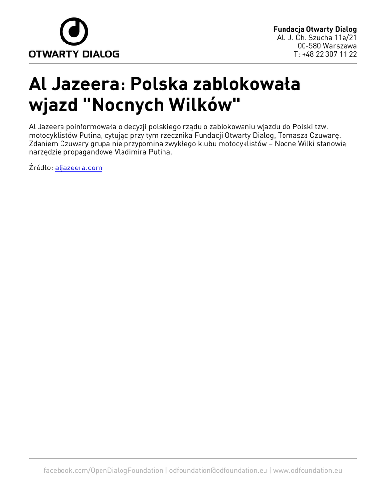 Fundacja Otwarty Dialog Al. J. Ch. Szucha 11a/21 00-580 Warszawa T: +48 22 307 11 22 Al Jazeera: Polska zablokowała wjazd "Nocnych Wilków" Al Jazeera poinformowała o decyzji polskiego rządu o zablokowaniu wjazdu do Polski tzw. motocyklistów Putina, cytując przy tym rzecznika Fundacji Otwarty Dialog, Tomasza Czuwarę. Zdaniem Czuwary grupa nie przypomina zwykłego klubu motocyklistów – Nocne Wilki stanowią narzędzie propagandowe Vladimira Putina. Źródło: aljazeera.com facebook.com/OpenDialogFoundation | [email protected] | www.odfoundation.eu