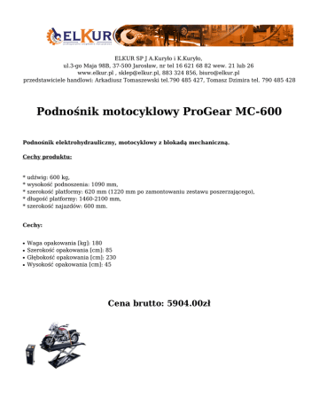 ELKUR SP J A.Kuryło i K.Kuryło, ul.3-go Maja 98B, 37-500 Jarosław, nr tel 16 621 68 82 wew. 21 lub 26 www.elkur.pl , [email protected], 883 324 856, [email protected] przedstawiciele handlowi: Arkadiusz Tomaszewski tel.790 485 427, Tomasz Dzimira tel. 790 485 428 Podnośnik motocyklowy ProGear MC-600 Podnośnik elektrohydrauliczny, motocyklowy z blokadą mechaniczną. Cechy produktu: * udźwig: 600 kg, * wysokość podnoszenia: 1090 mm, * szerokość platformy: 620 mm (1220 mm po zamontowaniu zestawu poszerzającego), * długość platformy: 1460-2100 mm, * szerokość najazdów: 600 mm. Cechy: ● ● ● ● Waga opakowania [kg]: 180 Szerokość opakowania [cm]: 85 Głębokość opakowania [cm]: 230 Wysokość opakowania [cm]: 45 Cena brutto: 5904.00zł