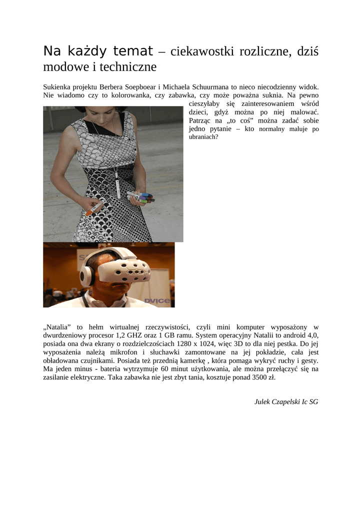 Na każdy temat – ciekawostki rozliczne, dziś modowe i techniczne Sukienka projektu Berbera Soepboear i Michaela Schuurmana to nieco niecodzienny widok. Nie wiadomo czy to kolorowanka, czy zabawka, czy może poważna suknia. Na pewno cieszyłaby się zainteresowaniem wśród dzieci, gdyż można po niej malować. Patrząc na „to coś” można zadać sobie jedno pytanie – kto normalny maluje po ubraniach? „Natalia” to hełm wirtualnej rzeczywistości, czyli mini komputer wyposażony w dwurdzeniowy procesor 1,2 GHZ oraz 1 GB ramu. System operacyjny Natalii to android 4,0, posiada ona dwa ekrany o rozdzielczościach 1280 x 1024, więc 3D to dla niej pestka. Do jej wyposażenia należą mikrofon i słuchawki zamontowane na jej pokładzie, cała jest obładowana czujnikami. Posiada też przednią kamerkę , która pomaga wykryć ruchy i gesty. Ma jeden minus - bateria wytrzymuje 60 minut użytkowania, ale można przełączyć się na zasilanie elektryczne. Taka zabawka nie jest zbyt tania, kosztuje ponad 3500 zł. Julek Czapelski Ic SG