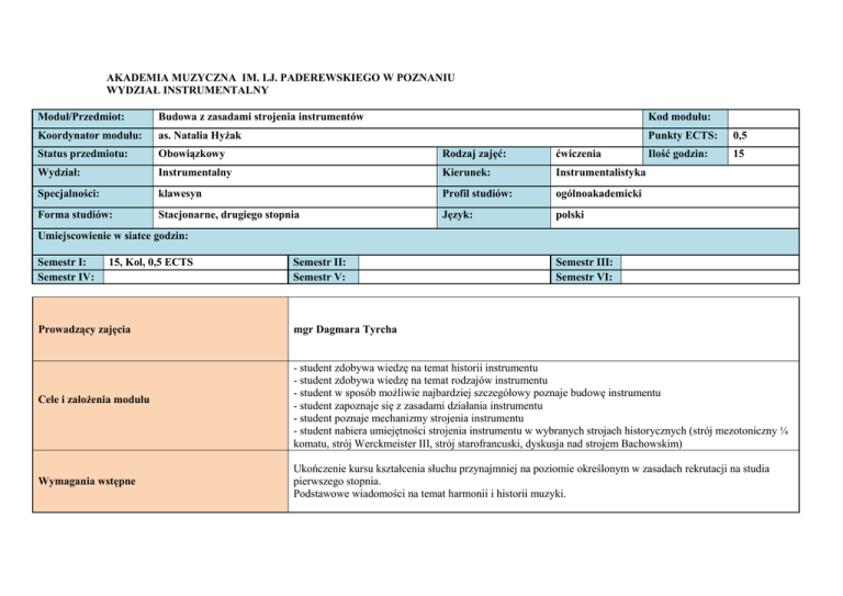AKADEMIA MUZYCZNA IM. I.J. PADEREWSKIEGO W POZNANIU WYDZIAŁ INSTRUMENTALNY Moduł/Przedmiot: Budowa z zasadami strojenia instrumentów Kod modułu: Koordynator modułu: as. Natalia Hyżak Punkty ECTS: 0,5 Status przedmiotu: Obowiązkowy Rodzaj zajęć: ćwiczenia Ilość godzin: 15 Wydział: Instrumentalny Kierunek: Instrumentalistyka Specjalności: klawesyn Profil studiów: ogólnoakademicki Forma studiów: Stacjonarne, drugiego stopnia Język: polski Umiejscowienie w siatce godzin: Semestr I: Semestr IV: 15, Kol, 0,5 ECTS Prowadzący zajęcia Cele i założenia modułu Wymagania wstępne Semestr II: Semestr V: Semestr III: Semestr VI: mgr Dagmara Tyrcha - student zdobywa wiedzę na temat historii instrumentu - student zdobywa wiedzę na temat rodzajów instrumentu - student w sposób możliwie najbardziej szczegółowy poznaje budowę instrumentu - student zapoznaje się z zasadami działania instrumentu - student poznaje mechanizmy strojenia instrumentu - student nabiera umiejętności strojenia instrumentu w wybranych strojach historycznych (strój mezotoniczny ¼ komatu, strój Werckmeister III, strój starofrancuski, dyskusja nad strojem Bachowskim) Ukończenie kursu kształcenia słuchu przynajmniej na poziomie określonym w zasadach rekrutacji na studia pierwszego stopnia. Podstawowe wiadomości na temat harmonii i historii muzyki. TREŚCI PROGRAMOWE MODUŁU (przedmiotu) Semestr I Zapoznanie się w teorii i praktyce z budową instrumentu. Rodzaje klawesynów. Mechanizm klawesynu i zasady jego działania. O temperacji – wprowadzenie teoretyczne. Strój mezotoniczny – teoria i praktyka. Strój Werckmeister III – teoria i praktyka. Strój starofrancuski oraz stroje Bachowskie w teorii i praktyce. Liczba godzin 15 2 2 2 3 3 3 Kod efektu Wiedza (W) Kompetencje społeczne (K) EFEKTY KSZTAŁCENIA MODUŁU (przedmiotu) W01 Student posiada gruntowną wiedzę dotyczącą budowy instrumentu, jego ewentualnej konserwacji i strojenia. K01 Student dostosowuje się do warunków stawianych przez współczesny rynek pracy. Student w sposób odpowiedzialny i świadomy przewodniczy działaniom zespołowym. K02 K03 Student jest zdolny do integrowania zdobytej wiedzy w ramach specjalności oraz innych działań kulturotwórczych. Efekt kształcenia w obszarze kształcenia K_W08 K_K05 K_K03 K_K01 Metody kształcenia Metody weryfikacji efektów kształcenia Forma i warunki zaliczenia przedmiotu wykład problemowy wykład konwersatoryjny rozwiązywanie zadań praca indywidualna sesje rozwiązywania problemu inne metody stosowane przez prowadzącego Wymagania końcowe – zaliczenie roku, forma oceny egzamin praktyczny (obserwacja wykonawstwa) realizacja zleconego zadania wszystkie inne metody stosowane przez prowadzącego Warunki zaliczenia: Nr efektu W01 W01 W01 K01 K01 K01 K02 K02 K02 K03 K03 K03 Zaliczenie przedmiotu uwarunkowane jest uczęszczaniem na zajęcia (kontrola obecności), osiągnięciem założonych efektów kształcenia (w minimalnym akceptowalnym stopniu – w wysokości powyżej 50%) oraz wykonywaniem zadań zleconych przez prowadzącego w czasie trwania zajęć. Warunki egzaminu: Inne: Semestr I: Zaliczenie Semestr II: Semestr III: Semestr IV: Semestr V: Semestr VI: NAKŁAD PRACY STUDENTA – ILOŚĆ PUNKTÓW ECTS Godziny realizowane przy bezpośrednim udziale nauczyciela akademickiego Ilość godzin samodzielnej pracy studenta w czasie trwania przedmiotu Zajęcia dydaktyczne: Konsultacje: Ilość godzin egzaminu: Suma: Przygotowywanie się do zajęć Przygotowywanie się do ostatecznego zaliczenia/zdania egzaminu Przygotowywanie się do prezentacji w czasie trwania semestru Suma: Inne Sumaryczny nakład pracy: Ilość godzin: 15 x 1 16 Punkty ECTS: x x x x 0,5 x x 0,5 (100 %) x x x x 16 0,5 Literatura podstawowa M. Toporowski, M. Pilch – Dawne temperacje. Podstawy akustyczne i praktyczne wykorzystanie. The New Grove Dictionary of Music and Musicians. H. Neupert Harpsichord Manual a historical and technical discussion. Literatura uzupełniająca Biblioteki wirtualne i zasoby on-line MOŻLIWOŚCI KARIERY ZAWODOWEJ Zasady budowy i strojenia instrumentu to przedmiot niezbędny dla klawesynisty, koncertującego zarówno solo, jak i w zespołach kameralnych. Umiejętność strojenia instrumentu jest bazą dla dobrego wykonania utworu muzycznego oraz dla właściwego współdziałania w zespole kameralnym. Przedmiot ten w sposób bardzo praktyczny przygotowuje studenta do przyszłego życia zawodowego.