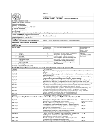 Syllabus Wydział / Kierunek / Specjalność WYDZIAŁ NAUK o ZDROWIU / Komunikacja społeczna INFORMACJE OGÓLNE Studia (odpowiednie podkreślić) I stopnia - stacjonarne I stopnia - niestacjonarne I stopnia - pomostowe: poziom AB/ C/ D II stopnia - stacjonarne II stopnia - niestacjonarne Podyplomowe Profil kształcenia (odpowiednie podkreślić): ogólnoakademicki, praktyczny, praktyczno-ogólnoakademicki Nazwa przedmiotu (zgodnie z obowiązującym standardem kształcenia i/lub programem nauczania Zarządzanie informacją zatwierdzonym przez Radę WNoZ). Kod przedmiotu Katedra i Zakład Organizacji i Zarządzania w Opiece Zdrowotnej Jednostka organizacyjna prowadząca zajęcia Przedmioty wprowadzające. Wymagania wstępne Punkty ECTS Forma zajęć 1. 2. 3. 4. 5. 6. 7. 8. Ogółem Wykłady Seminaria Ćwiczenia Zajęcia praktyczne Praktyki zawodowe Samokształcenie E – learning 1 Liczba godzin dydaktycznych 40 10 20 10 Warunki zaliczenia przedmiotu Obecność i aktywny udział w zajęciach, pozytywne zaliczenie projektów realizowanych podczas seminariów, przygotowanie pisemnego referatu oraz prezentacji ustnej z wykorzystaniem multimediów na wyznaczony temat pozytywna ocena z końcowego testu sprawdzającego . Forma zaliczenia przedmiotu (odpowiednie podkreślić) Egzamin Zaliczenie z oceną Zaliczenie INFORMACJE SZCZEGÓŁOWE Cele kształcenia przedmiotu (C) wynikowe: wiedza (W), umiejętności (U), kompetencje społeczne (KS) Symbol Cele kształcenia C(W)01 Zapoznanie z podstawowymi pojęciami z zakresu zarządzania informacją w ochronie zdrowia C(W)02 Przekazanie wiedzy dotyczącej roli i ewolucji systemów informacyjnych w doskonaleniu usług zdrowotnych C(W)03 Wdrożenie podstawowych pojęć związanych z podstawowymi metodami i technikami, charakterystycznymi dla zarządzania informacją w ochronie zdrowia C(W)04 Przekazanie wiedzy na temat wykorzystywania technik służących do przekazywania informacji oraz wpływem technologii informacyjnej na innowacyjność organizacji C(U)01 Wypracowanie umiejętności analizowania podstawowych metod zarządzania informacja C(U)02 Wyrobienie umiejętności praktycznego zastosowania technik zarządzania informacją oraz projektowania systemów informacyjnych w ochronie zdrowia C(U)03 Umiejętność wykorzystania systemów informacyjnych w zarządzaniu informacją oraz wykorzystanie metodologii projektowania systemów zarządzania informacją C(U)04 Wyrobienie umiejętności planowania innowacji, projektowania relacji z klientem i procesu wdrażania nowoczesnych systemów informacyjnych C(KS)01 Rozbudzenie postawy systematyczności i odpowiedzialności C(KS)02 Przygotowanie do pracy w zespole projektowym Przewidywane efekty kształcenia studenta w zakresie wiedzy (W), umiejętności (U), kompetencji społecznych (KS). Symbol EK (W)01 EK (W)02 EK (W)03 EK (W)04 EK (U)01 EK (U)02 Przewidywane efekty kształcenia studenta (EK): wiedza (W), umiejętności (U), kompetencje społeczne (KS). Posiada podstawową wiedzę z zakresu teorii organizacji i zarządzania, w tym zarządzania informacją w ochronie zdrowia Ma wiedzę na temat roli i ewolucji systemów informacyjnych w doskonaleniu usług zdrowotnych Posiada wiedzę z zakresu metod i technik stosowanych w projektach oraz potrafi je wykorzystywać do tworzenia projektów służących do zarządzania informacją Posiada wiedzę na temat wykorzystywania technik służących do przekazywania informacji oraz wpływem technologii informacyjnej na innowacyjność organizacji Posiada umiejętność rozumienia istoty podstawowych metod zarządzania informacją zarządzaniu informacją Rozumie zasady zarządzania informacją na przykładach Odniesienie do celów kształcenia (symbol) C(W)01 C(W)02 C(W)03 C(W)4 C(W)01 C(W)03 1 C(U)01-04 Posiada umiejętność samodzielnego przygotowania wymagań i C(U)03 ograniczeń w procesie zarządzania informacją C(U)04 EK (U)04 Wykorzystuje literaturę naukową z zakresu organizacji i C(W)01-04 zarządzania oraz zarządzania informacją C(U)01-04 EK (KS)01 Rozumie potrzebę ciągłego zgłębiania wiedzy z zakresu C(KS)01 organizacji i zarządzania, w tym zarządzania informacją EK (KS)02 Potrafi efektywnie współpracować w zespołach zadaniowych, C(KS)02 realizując powierzone zadania i pełniąc określone role Treści programowe (TP): opis przedmiotu wynikający z obowiązującego standardu kształcenia i/lub programu nauczania zatwierdzonego przez Radę WNoZ Symbol Forma realizacji treści kształcenia: np. wykład, seminaria, Odniesienie do ćwiczenia, zajęcia praktyczne, praktyki zawodowe, efektów kształcenia samokształcenie, E- learning (symbol) TP1 Systemy informacyjne w zarządzaniu Wykład, Samokształcenie EK (W)01-02 EK (U)01 TP2 Proces zarządzania wiedzą, procedury Wykład, Samokształcenie EK (W)03 tworzenia systemów zarządzania wiedzą EK (U)01 EK (U)04 TP3 Systemy informacyjne a innowacyjność Wykład, Samokształcenie EK (W)04 EK (U)02 EK (U)04 TP4 Wdrożenie systemu informacyjnego w Seminaria, Samokształcenie EK (W)01-04 podmiocie leczniczym EK (U)03 EK (KS)01-2 TP5 Rola komunikacji wewnętrznej w Seminaria, Samokształcenie EK (W)01 funkcjonowaniu podmiotu leczniczego EK (U)01 EK (KS)01-2 TP6 Organizacje wirtualne Seminaria, Samokształcenie EK (W)04 EK (U)04 EK (KS)01-2 TP7 Zarządzanie relacjami z klientem Seminaria, Samokształcenie EK (W)03 EK (U)01 EK (U)02 EK (KS)01-2 TP8 Potrzeby informacyjne pacjentów, metody Seminaria, Samokształcenie EK (U)02 oceny oczekiwań pacjentów EK (U)03 EK (KS)01-2 TP9 Systemy informacji personalnej Seminaria, Samokształcenie EK (W)02 EK (U)03 EK (KS)01-2 TP10 Systemy informatyczne jako skuteczne Seminaria, Samokształcenie EK (W)03 narzędzie usprawniające komunikację EK (U)02 EK (KS)01-2 Metody dydaktyczne (sposób pracy nauczyciela, Wykład, dyskusja zwykła moderowana, dyskusja wielokrotna, ćwiczenia klasyczne, umożliwiający osiągnięcie celów kształcenia) ćwiczenia symulacyjne, p