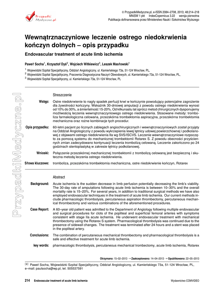 © PrzypadkiMedyczne.pl, e-ISSN 2084–2708, 2013; 48:214–218 MNiSW 1 pkt IndexCopernicus 3.22 wersja pierwotna Publikacja dofinansowana przez Ministerstwo Nauki i Szkolnictwa Wyższego Wewnątrznaczyniowe leczenie ostrego niedokrwienia http://www.PrzypadkiMedyczne.pl kończyn dolnych – opis przypadku Endovascular treatment of acute limb ischemia Paweł Socha1 , Krzysztof Dyś2 , Wojciech Witkiewicz3 , Leszek Masłowski1 1 Wojewódzki Szpital Specjalityczny, Oddział Angiologiczny, ul. Kamieńskiego 73a, 51-124 Wrocław, PL, Wojewódzki Szpital Specjalityczny, Pracownia Diagnostyczna Naczyń Obwodowych, ul. Kamieńskiego 73a, 51-124 Wrocław, PL, 3 Wojewódzki Szpital Specjalityczny, ul. Kamieńskiego 73a, 51-124 Wrocław, PL 2 Streszczenie Wstęp: Ostre niedokrwienie to nagły spadek perfuzji krwi w kończynie powodujący potencjalne zagrożenie dla żywotności kończyny. Wskaźnik 30-dniowej amputacji z powodu ostrego niedokrwienia wynosi od 10% do 30%, a śmiertelność 15-20%. Od kilkunastu lat oprócz metod chirurgicznych dysponujemy możliwością leczenia wewnątrznaczyniowego ostrego niedokrwienia. Stosowane metody: tromboliza farmakologiczna celowana, przezskórna trombektomia aspiracyjna, przezskórna trombektomia mechaniczna oraz rożne kombinacje tych procedur. Opis przypadku: 60-letni pacjent po licznych zabiegach angiochirurgicznych i wewnątrznaczyniowych został przyjęty na Oddział Angiologiczny z powodu wykrzepienia lewej tętnicy udowej powierzchownej i podkolanowej z objawami ostrego niedokrwienia IIa wg SVS/ISCVS. Leczenie wewnątrznaczyniowe rozpoczęto za pomocą systemu do mechanicznej trombektomii Rotarex S. Z powodu obecności przyściennych zmian zadecydowano kontynuacji leczenia trombolizą celowaną. Leczenie zakończono po 24 godzinach stentoplastyką w zakresie tętnicy podkolanowej. Wnioski: Połączenie przezskórnej mechanicznej trombektomii z trombolizą celowaną jest bezpieczną i skuteczna metodą leczenia ostrego niedokrwienia. Słowa kluczowe: tromboliza, przezskórna trombektomia mechaniczna, ostre niedokrwienie kończyn, Rotarex Abstract Background: Acute ischemia is the sudden decrease in limb perfusion potentially decreasing the limb’s viability. The 30-day rate of amputations following acute limb ischemia is between 10–30% and the overall mortality rate is 15–20%. For several years, in addition to traditional surgical methods we have also employed endovascular techniques in the treatment of acute limb ischemia. Our current methods include pharmacologic thrombolysis, percutaneous aspiration thrombectomy, percutaneous mechanical thrombectomy and various combinations of the aforementioned procedures. Case Report: A 60–year old patient was admitted to the Department of Angiology following multiple endovascular and surgical procedures for clots of the popliteal and superficial femoral arteries with symptoms consistent with stage IIa acute ischemia. He underwent endovascular treatment with mechanical thrombectomy using the Rotarex S system. Pharmacological thrombolysis was continued due to the presence of sidewall changes. The treatment was terminated after 24 hours and a stent was placed in the popliteal artery. Conclusions: The combination of percutaneous mechanical thrombectomy and pharmacological thrombolysis is a safe and effective treatment for acute limb ischemia. key words: pharmacologic thrombolysis, percutaneous mechanical trombectomy, acute limb ischemia, Rotarex Otrzymano: 15–02–2013 Ý Zaakceptowano: 14–04–2013 Ý Opublikowano: 22–05–2013 ) Paweł Socha, Wojewódzki Szpital Specjalityczny, Oddział Angiologiczny, ul. Kamieńskiego 73a, 51-124 Wrocław, PL, e–mail: [email protected], tel. 505537591 214 Endovascular treatment of acute limb ischemia Wydawnictwo COMVIDEO Wewnątrznaczyniowe leczenie ostrego niedokrwienia kończyn dolnych – opis przypadku Wstęp Ostre niedokrwienie kończyn (ALI) to nagły spadek perfuhttp://www.PrzypadkiMedyczne.pl zji krwi w kończynie powodujący potencjalne zagrożenie dla żywotności kończyny, trwający poniżej dwóch tygodni. Wśród przyczyn ostrego niedokrwienia najczęściej występuje zakrzepica tętnicza pierwotna, zatorowość, zakrzepica rekonstrukcji przeszczepu naczyniowego, uraz naczynia oraz tętniak obwodowy [1, 2]. Szybkość zgłoszenia się pacjenta do ośrodka referencyjnego zależy od nasilenia objawów i dostępności do opieki specjalistycznej. W różnicowaniu zagrożenia żywotności kończyny w przypadku ostrego niedokrwienia posługujemy się klasyfikacją kliniczną SVS/ISCVS (tab. 1). Tablica 1: Klasyfikacja kliniczna SVS/ISCVS. Różnicowanie pomiędzy kończyną żywotną a zagrożoną [3] kategoria opis / rokowanie utrata czucia objawy osłabienie mięśniowe sygnały Dopplera tętnicze żylne I. Żywotna brak bezpośredniego zagrożenia brak brak słyszalny słyszalny do uratowania, jeżeli intensywnie leczona minimalna brak (palce) (często) niesłyszalny słyszalny do uratowania, jeżeli bezzwłocznie rewaskularyzowana obejmuje nie tylko palce, związana z bólem spoczynkowym lekkie, średnie (zazwyczaj) niesłyszalny słyszalny głęboka, anestetyczna głębokie, paraliż (zesztywnienie) II. Zagrożenia a. marginalnie b. krytycznie Opis przypadku III. Nieodwracalna duże uszkodzenie tkanek lub permanentne uszkodzenie nerwów jest nieuchronne Tromboliza farmakologiczna celowana jest metodą stosowaną od wielu lat w leczeniu ostrego niedokrwienia, polega na wprowadzeniu cewnika trombolitycznego w zmianę zakrzepowo-zatorową i infuzji leku trombolitycznego (streptokinazy,alteplazy). Wprowadzenie cewnika i bezpośrednia infuzja leku pozwala znacząco skrócić czas, zredukować dawki leków oraz zwiększyć skuteczność leczenia w porównaniu do trombolizy dożylnej [1, 4]. System do przezskórnej mechanicznej trombektomii(PMT) Rotarex S działa na zasadzie śruby Archimedesa, której spiralne zakończenie wykonuje około 40 000 obrotów n