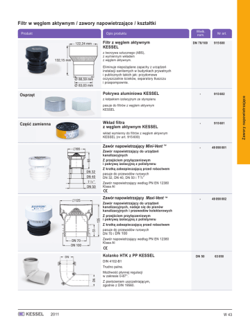 Filtr w węglem aktywnym / zawory napowietrzające / kształtki Produkt Opis produktu Filtr z węglem aktywnym KESSEL 122,24 mm Wielk. nom. Nr art. DN 70/100 915 600 - 915 602 - 915 601 - 49 090 001 - 49 090 002 DN 50 63 050 z tworzywa sztucznego (ABS), z wymiennym wkładem z węglem aktywnym. 132,15 mm Ø 88,59 mm Ø 83,03 mm Pokrywa aluminiowa KESSEL Osprzęt z kołpakiem izolacyjnym ze styropianu pasuje do filtrów z węglem aktywnym KESSEL Wkład filtra z węglem aktywnym KESSEL Część zamienna wkład wymienny do filtrów z węglem aktywnym KESSEL (nr art. 915 600) Zawór napowietrzający Mini-Vent TM x66 68 Zawór napowietrzający do urządzeń kanalizacyjnych Z przejściem przyłączeniowym i pokrywą izolacyjną z polistyrenu Z kratką zabezpieczającą przed robactwem pasuje do przewodów rurowych DN 32, DN 40, DN 50 i 11/2” DN 32 DN 40 11/2 " DN 50 Zawór napowietrzający według PN EN 12380 Klasa AI Zawór napowietrzający Maxi-Vent TM 51 135 x125 DN 70 DN 100 Zawór napowietrzający do urządzeń kanalizacyjnych, nadaje się do pionów kanalizacyjnych i przewodów kolektorowych Z przejściem przyłączeniowym i pokrywą izolacyjną z polistyrenu Z kratką zabezpieczającą przed robactwem pasuje do przewodów rurowych DN 70 i DN 100 Zawór napowietrzający według PN EN 12380 Klasa AI Kolanko HTK z PP KESSEL DIN 4102-B1 Trudno palne. Możliwość płynnej regulacji w zakresie 0-87°. Z pierścieniem uszczelniającym, zgodnie z DIN 19560. 2011 W 43 Zawory napowietrzające Eliminuje niepożądane zapachy z urządzeń instalacji sanitarnych w budynkach prywatnych i publicznych takich jak: przydomowe oczyszczalnie ścieków, separatory tłuszczu i przepompownie.