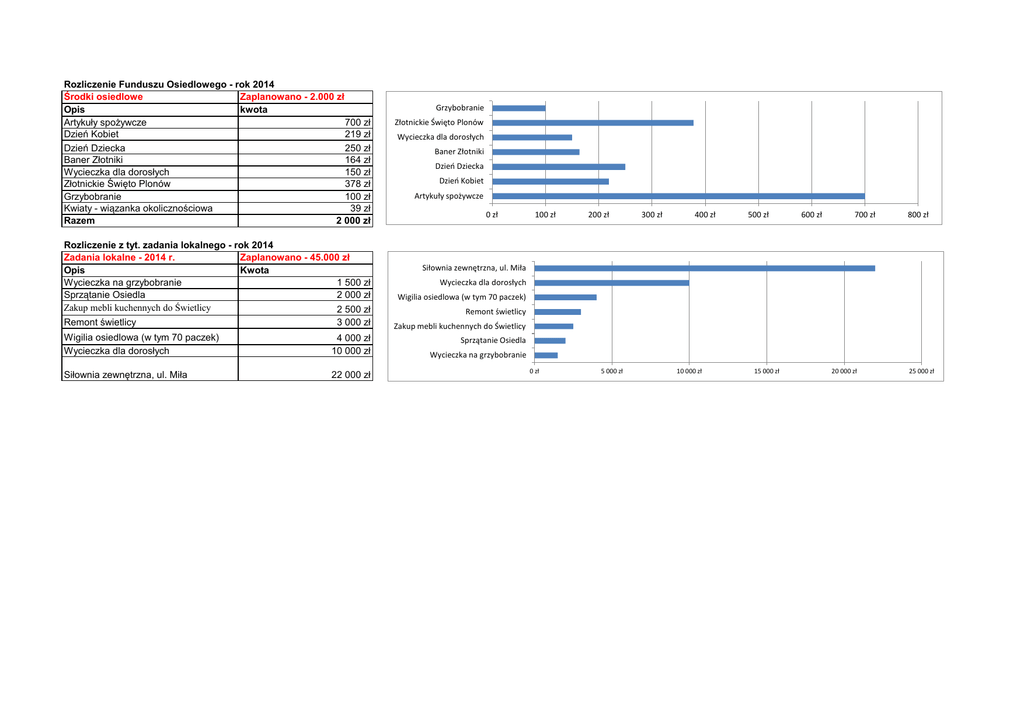 Rozliczenie Funduszu Osiedlowego - rok 2014 Środki osiedlowe Zaplanowano - 2.000 zł Opis kwota Artykuły spożywcze 700 zł Dzień Kobiet 219 zł Dzień Dziecka 250 zł Baner Złotniki 164 zł Wycieczka dla dorosłych 150 zł Złotnickie Święto Plonów 378 zł Grzybobranie 100 zł Kwiaty - wiązanka okolicznościowa 39 zł Razem 2 000 zł Rozliczenie z tyt. zadania lokalnego - rok 2014 Zadania lokalne - 2014 r. Zaplanowano - 45.000 zł Opis Kwota Wycieczka na grzybobranie 1 500 zł Sprzątanie Osiedla 2 000 zł Zakup mebli kuchennych do Świetlicy 2 500 zł Remont świetlicy 3 000 zł Wigilia osiedlowa (w tym 70 paczek) Wycieczka dla dorosłych 4 000 zł 10 000 zł Siłownia zewnętrzna, ul. Miła 22 000 zł Grzybobranie Złotnickie Święto Plonów Wycieczka dla dorosłych Baner Złotniki Dzień Dziecka Dzień Kobiet Artykuły spożywcze 0 zł 100 zł 200 zł 300 zł 400 zł 500 zł 600 zł 700 zł 800 zł Siłownia zewnętrzna, ul. Miła Wycieczka dla dorosłych Wigilia osiedlowa (w tym 70 paczek) Remont świetlicy Zakup mebli kuchennych do Świetlicy Sprzątanie Osiedla Wycieczka na grzybobranie 0 zł 5 000 zł 10 000 zł 15 000 zł 20 000 zł 25 000 zł