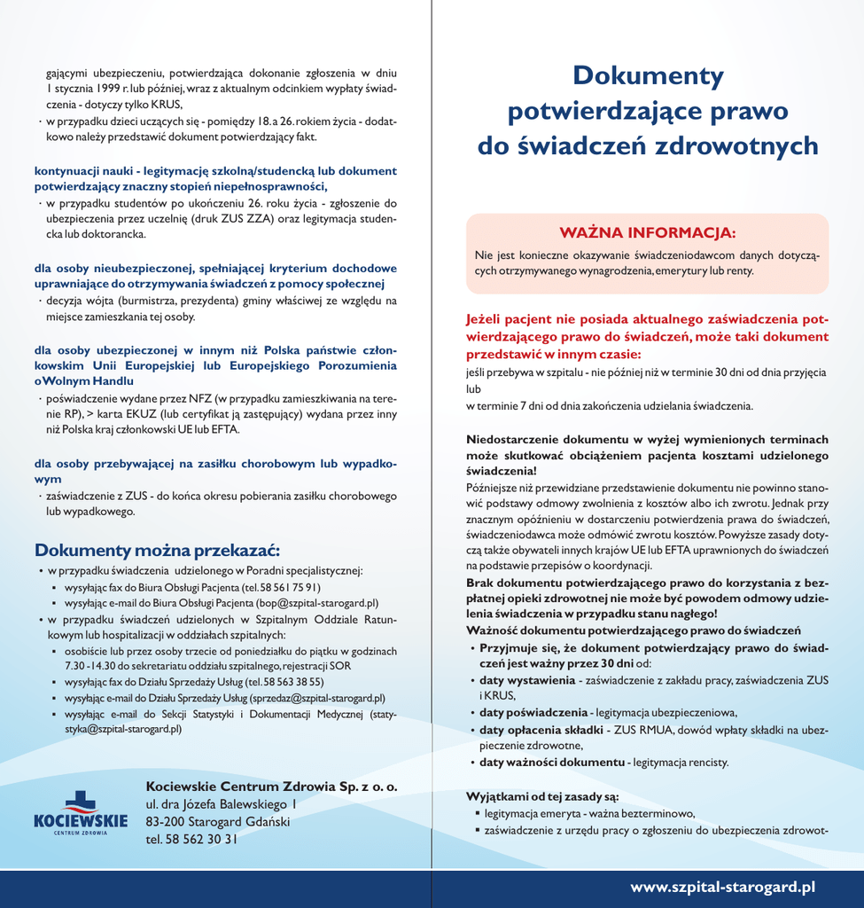 gaj¹cymi ubezpieczeniu, potwierdzaj¹ca dokonanie zg³oszenia w dniu 1 stycznia 1999 r. lub póŸniej, wraz z aktualnym odcinkiem wyp³aty œwiadczenia - dotyczy tylko KRUS, w przypadku dzieci ucz¹cych siê - pomiêdzy 18. a 26. rokiem ¿ycia - dodatkowo nale¿y przedstawiæ dokument potwierdzaj¹cy fakt. kontynuacji nauki - legitymacjê szkoln¹/studenck¹ lub dokument potwierdzaj¹cy znaczny stopieñ niepe³nosprawnoœci, w przypadku studentów po ukoñczeniu 26. roku ¿ycia - zg³oszenie do ubezpieczenia przez uczelniê (druk ZUS ZZA) oraz legitymacja studencka lub doktorancka. dla osoby nieubezpieczonej, spe³niaj¹cej kryterium dochodowe uprawniaj¹ce do otrzymywania œwiadczeñ z pomocy spo³ecznej decyzja wójta (burmistrza, prezydenta) gminy w³aœciwej ze wzglêdu na miejsce zamieszkania tej osoby. dla osoby ubezpieczonej w innym ni¿ Polska pañstwie cz³onkowskim Unii Europejskiej lub Europejskiego Porozumienia o Wolnym Handlu poœwiadczenie wydane przez NFZ (w przypadku zamieszkiwania na terenie RP), > karta EKUZ (lub certyfikat j¹ zastêpuj¹cy) wydana przez inny ni¿ Polska kraj cz³onkowski UE lub EFTA. dla osoby przebywaj¹cej na zasi³ku chorobowym lub wypadkowym zaœwiadczenie z ZUS - do koñca okresu pobierania zasi³ku chorobowego lub wypadkowego. Dokumenty mo¿na przekazaæ: ? w przypadku œwiadczenia udzielonego w Poradni specjalistycznej: § wysy³aj¹c fax do Biura Obs³ugi Pacjenta (tel. 58 561 75 91) § wysy³aj¹c e-mail do Biura Obs³ugi Pacjenta ([email protected]) ? w przypadku œwiadczeñ udzielonych w Szpitalnym Oddziale Ratun- kowym lub hospitalizacji w oddzia³ach szpitalnych: § osobiœcie lub przez osoby trzecie od poniedzia³ku do pi¹tku w godzinach 7.30 -14.30 do sekretariatu oddzia³u szpitalnego, rejestracji SOR § wysy³aj¹c fax do Dzia³u Sprzeda¿y Us³ug (tel. 58 563 38 55) § wysy³aj¹c e-mail do Dzia³u Sprzeda¿y Us³ug ([email protected]) § wysy³aj¹c e-mail do Sekcji Statystyki i Dokumentacji Medycznej (staty- [email protected]) Kociewskie Centrum Zdrowia Sp. z o. o. ul. dra Józefa Balewskiego 1 83-200 Starogard Gdañski tel. 58 562 30 31 Dokumenty potwierdzaj¹ce prawo do œwiadczeñ zdrowotnych WA¯NA INFORMACJA: Nie jest konieczne okazywanie œwiadczeniodawcom danych dotycz¹cych otrzymywanego wynagrodzenia, emerytury lub renty. Je¿eli pacjent nie posiada aktualnego zaœwiadczenia potwierdzaj¹cego prawo do œwiadczeñ, mo¿e taki dokument przedstawiæ w innym czasie: jeœli przebywa w szpitalu - nie póŸniej ni¿ w terminie 30 dni od dnia przyjêcia lub w terminie 7 dni od dnia zakoñczenia udzielania œwiadczenia. Niedostarczenie dokumentu w wy¿ej wymienionych terminach mo¿e skutkowaæ obci¹¿eniem pacjenta kosztami udzielonego œwiadczenia! PóŸniejsze ni¿ przewidziane przedstawienie dokumentu nie powinno stanowiæ podstawy odmowy zwolnienia z kosztów albo ich zwrotu. Jednak przy znacznym opóŸnieniu w dostarczeniu potwierdzenia prawa do œwiadczeñ, œwiadczeniodawca mo¿e odmówiæ zwrotu kosztów. Powy¿sze zasady dotycz¹ tak¿e obywateli innych krajów UE lub EFTA uprawnionych do œwiadczeñ na podstawie przepisów o koordynacji. Brak dokumentu potwierdzaj¹cego prawo do korzystania z bezp³atnej opieki zdrowotnej nie mo¿e byæ powodem odmowy udzielenia œwiadczenia w przypadku stanu nag³ego! Wa¿noœæ dokumentu potwierdzaj¹cego prawo do œwiadczeñ ? Przyjmuje siê, ¿e dokument potwierdzaj¹cy prawo do œwiadczeñ jest wa¿ny przez 30 dni od: ? daty wystawienia - zaœwiadczenie z zak³adu pracy, zaœwiadczenia ZUS i KRUS, ? daty poœwiadczenia - legitymacja ubezpieczeniowa, ? daty op³acenia sk³adki - ZUS RMUA, dowód wp³aty sk³adki na ubezpieczenie zdrowotne, ? daty wa¿noœci dokumentu - legitymacja rencisty. Wyj¹tkami od tej zasady s¹: § legitymacja emeryta - wa¿na bezterminowo, § zaœwiadczenie z urzêdu pracy o zg³oszeniu do ubezpieczenia zdrowot- www.szpital-starogard.pl nego - do koñca terminu wa¿noœci, § decyzja wójta (burmistrza, prezydenta) gminy - wa¿na 90 dni od dnia okreœlonego w decyzji. Ustanie prawa do œwiadczeñ Prawo do œwiadczeñ opieki zdrowotnej ustaje zazwyczaj po up³ywie 30 dni od dnia wygaœniêcia obowi¹zku ubezpieczenia zdrowotnego, na przyk³ad: ? w przypadku ustania stosunku pracy (np. z tytu³u umowy o pracê) - po up³ywie 30 dni od dnia rozwi¹zania umowy o pracê, ? w przypadku zakoñczenia prowadzenia pozarolniczej dzia³alnoœci gospodarczej - po up³ywie 30 dni od dnia zakoñczenia prowadzenia takiej dzia³alnoœci, ? w przypadku osób zatrudnionych, pozostaj¹cych na urlopie bezp³atnym po up³ywie 30 dni od dnia rozpoczêcia urlopu, w przypadku osób bezrobotnych - po up³ywie 30 dni od dnia utraty statusu bezrobotnego, ? w przypadku œmierci osoby, która zg³osi³a cz³onków rodziny do ubezpieczenia - cz³onkowie rodziny trac¹ prawo do œwiadczeñ po up³ywie 30 dni od daty œmierci. Osobom, które: ? ukoñczy³y szko³ê œredni¹ lub wy¿sz¹ lub zosta³y skreœlone z listy uczniów lub studentów - prawo do œwiadczeñ opieki zdrowotnej przys³uguje przez 4 miesi¹ce od zakoñczenia nauki lub skreœlenia z listy uczniów lub studentów, ? ubiegaj¹ siê o przyznanie emerytury lub renty - prawo do œwiadczeñ opieki zdrowotnej przys³uguje w okresie trwania postêpowania o przyznanie tych œwiadczeñ, ? pobieraj¹ zasi³ek przyznany na podstawie przepisów o ubezpieczeniu chorobowym lub wypadkowym - prawo do œwiadczeñ opieki zdrowotnej przys³uguje w okresie pobierania przez te osoby zasi³ku, Po up³ywie tego czasu osoba, która chce nadal korzystaæ ze œwiadczeñ zdrowotnych w ramach ubezpieczenia w NFZ, powinna uzyskaæ inne prawo do ubezpieczenia, np. ubezpieczyæ siê dobrowolnie. Je¿eli tego nie uczyni, mo¿e ponieœæ samodzielnie koszty udzielonych jej œwiadczeñ. dla osoby zatrudnionej na podstawie umowy o pracê druk zg³oszenia do ubezpieczenia zdrowotnego oraz aktualnie potwierdzony raport miesiêczny ZUS RMUA wydawany przez p