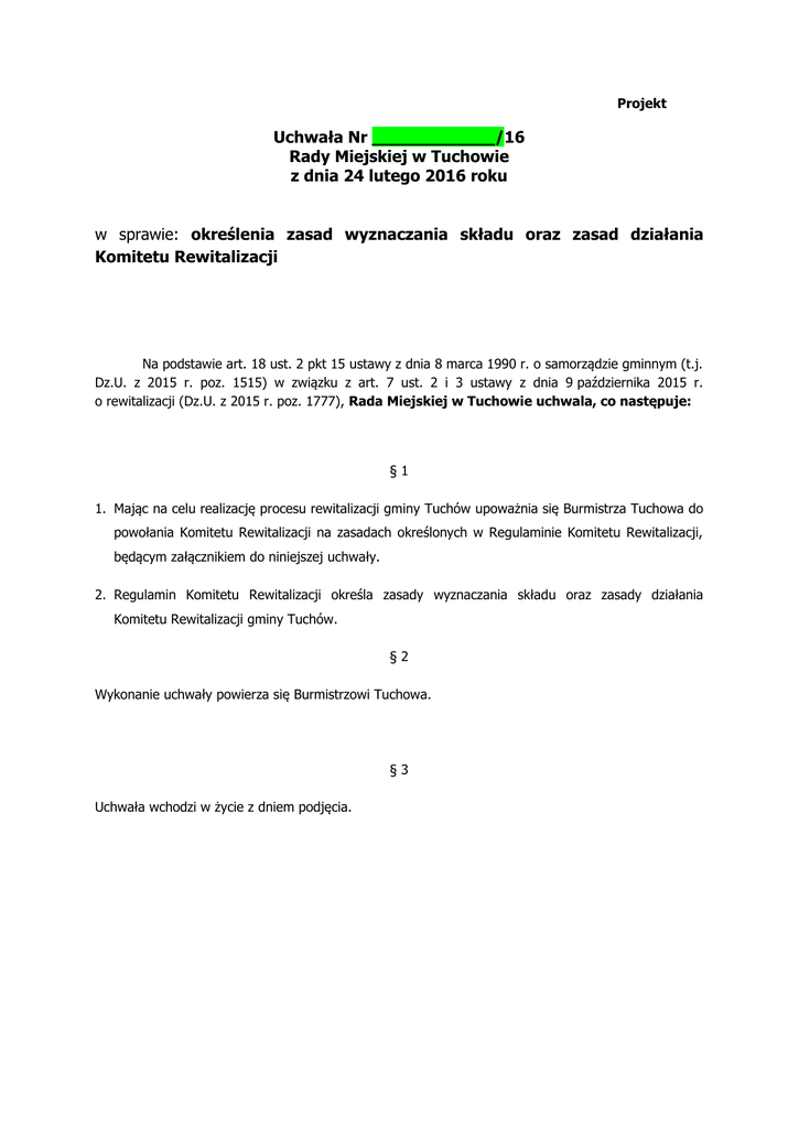 Projekt Uchwała Nr ____________/16 Rady Miejskiej w Tuchowie z dnia 24 lutego 2016 roku w sprawie: określenia zasad wyznaczania składu oraz zasad działania Komitetu Rewitalizacji Na podstawie art. 18 ust. 2 pkt 15 ustawy z dnia 8 marca 1990 r. o samorządzie gminnym (t.j. Dz.U. z 2015 r. poz. 1515) w związku z art. 7 ust. 2 i 3 ustawy z dnia 9 października 2015 r. o rewitalizacji (Dz.U. z 2015 r. poz. 1777), Rada Miejskiej w Tuchowie uchwala, co następuje: §1 1. Mając na celu realizację procesu rewitalizacji gminy Tuchów upoważnia się Burmistrza Tuchowa do powołania Komitetu Rewitalizacji na zasadach określonych w Regulaminie Komitetu Rewitalizacji, będącym załącznikiem do niniejszej uchwały. 2. Regulamin Komitetu Rewitalizacji określa zasady wyznaczania składu oraz zasady działania Komitetu Rewitalizacji gminy Tuchów. §2 Wykonanie uchwały powierza się Burmistrzowi Tuchowa. §3 Uchwała wchodzi w życie z dniem podjęcia. Załącznik do uchwały nr________ Rady Miejskiej w Tuchowie z dnia 24 lutego 2016 r. Regulamin Komitetu Rewitalizacji I. Komitetu Rewitalizacji gminy Tuchów 1. Komitet Rewitalizacji gminy Tuchów, zwany dalej Komitetem, stanowi forum współpracy i dialogu interesariuszy z organami gminy w sprawach dotyczących przygotowania, przeprowadzenia i oceny rewitalizacji oraz pełni funkcję opiniodawczo-doradczą Burmistrza Tuchowa, zwanego dalej Burmistrzem, w sprawach dotyczących opracowania i wdrażania Gminnego Programu Rewitalizacji Gminy Tuchów na lata 2016-2023 (zwanego dalej Gminnym Programem Rewitalizacji) oraz oceny przebiegu procesu rewitalizacji. 2. Komitet reprezentuje lokalne środowiska gospodarcze, naukowe, mieszkańców gminy Tuchów, organizacje pozarządowe oraz inne grupy. 3. Komitet uprawniony jest do wyrażania opinii oraz podejmowania inicjatyw rozwiązań odnoszących się do rewitalizacji gminy Tuchów. 4. Komitet uczestniczy w opiniowaniu oraz przygotowaniu projektów uchwał Rady Miejskiej w Tuchowie oraz zarządzeń Burmistrza Tuchowa związanych z rewitalizacją. II. Zasady wyznaczania składu Komitetu Rewitalizacji 1. Komitet liczy od 8 do 30 osób. Kadencja Komitetu upływa z momentem zakończenia prac związanych z Gminnym Programem Rewitalizacji. 2. W skład Komitetu wchodzą wyłącznie osoby fizyczne zameldowane na pobyt stały lub czasowy na terenie gminy Tuchów, będące przedstawicielami interesariuszy rewitalizacji, w tym: a) 4 przedstawicieli Urzędu Miejskiego w Tuchowie i jednostek organizacyjnych wskazanych przez Burmistrza Tuchowa, b) 2 przedstawicieli Rady Miejskiej w Tuchowie wskazanych przez Radę Miejską w Tuchowie, c) 1-2 przedstawicieli każdego obszaru zdegradowanego delegowanych przez organy stanowiące jednostek pomocniczych wchodzących w skład danego obszaru zdegradowanego, d) od 2 do 4 przedstawicieli sektora społecznego (organizacji pozarządowych i grup nieformalnych, działających na terenie gminy Tuchów), e) od 2 do 4 przedstawicieli podmiotów prywatnych (prowadzących działalność gospodarczą na obszarze zdegradowanym), f) od 2 do 4 przedstawicieli mieszkańców gminy Tuchów, nie będących członkami organizacji, o których mowa w lit. d) i nie pracujących w jednostkach organizacyjnych gminy Tuchów. 3. Członkostwo osób będących przedstawicielami podmiotów wymienionych w pkt. 2 lit. a) - b) ustaje z momentem zakończenia pełnienia przez nich funkcji w organach, lub ustaniem stosunku pracy z podmiotami, o których mowa w pkt. 2 lit. a) – b). 4. Przedstawiciele podmiotów wskazanych w pkt. 2 lit. c) – f) zostaną wybrani w drodze otwartej procedury. Informacja o naborze na członków Komitetu ogłoszona zostanie na stronie internetowej www.tuchow.pl, w Biuletynie Informacji Publicznej gminy Tuchów oraz na tablicy ogłoszeń w Urzędzie Miejskim w Tuchowie. Termin na składanie zgłoszeń wynosić będzie co najmniej 30 dni od dnia publikacji ww. ogłoszenia. Szczegóły dotyczące wymaganych dokumentów, posiadanych kwalifikacji, określone zostaną w ww. ogłoszeniu o naborze. Zaproszenia do składania formularzy zgłoszeniowych będą także wysłane do wszystkich wskazanych w ust. 2 środowisk, organizacji i instytucji. W przypadku niezgłoszenia się żadnego kandydata z ramienia podmiotów określonych w pkt. 2 lit. c) – f) procedurę naboru określoną powyżej przeprowadza się ponownie. W przypadku bezskutecznego upływu terminu drugiego naboru Burmistrz powołuje Komitet w składzie odpowiadającym przedstawicielom podmiotów wskazanych w pkt. 2 lit. a) – c). 5. Przedstawiciele podmiotów wskazanych w pkt. 2 lit. c) – f) mogą zgłaszać się także w trakcie trwania kadencji Komitetu, przesyłając zgłoszenia zgodnie z procedurą określoną w pkt. 6. Po rozpatrzeniu zgłoszenia Burmistrz może powołać przedstawicieli podmiotów wskazanych w pkt. 2 lit. c) – f) w ramach limitów określonych dla poszczególnych podmiotów na czas pozostały do końca kadencji Komitetu. 6. Zgłoszenia kandydatów na członka Komitetu należy dokonać poprzez wypełnienie formularza zgłoszeniowego (załącznik nr 1 do niniejszego Regulaminu) oraz przesłanie skanu ww. formularza wraz z wersją edytowalną dokumentu (najlepiej dokument WORD, plik z rozszerzeniem .doc lub .docx) na adres [email protected]. 7. Przy wyborze członków Komitetu brane będą pod uwagę następujące elementy: a) znajomość tematyki dotyczącej rewitalizacji, b) uczestnictwo w spotkaniach konsultacyjnych dot. Gminnego Programu Rewitalizacji, c) miejsce zamieszkania lub prowadzenia działalności na obszarze zdegradowanym wyznaczonym uchwałą rady gminy. 6. Członkiem Komitetu nie może być osoba skazana prawomocnym wyrokiem sądu za przestępstwo z winy umyślnej, lub wobec której orzeczono prawomocnie środek karny utraty praw publicznych. 7. W przypadku, gdy liczba zgłoszeń jest większa od liczby miejsc w Komitecie, złożone oferty poddane zostaną ocenie punktowej przez komi