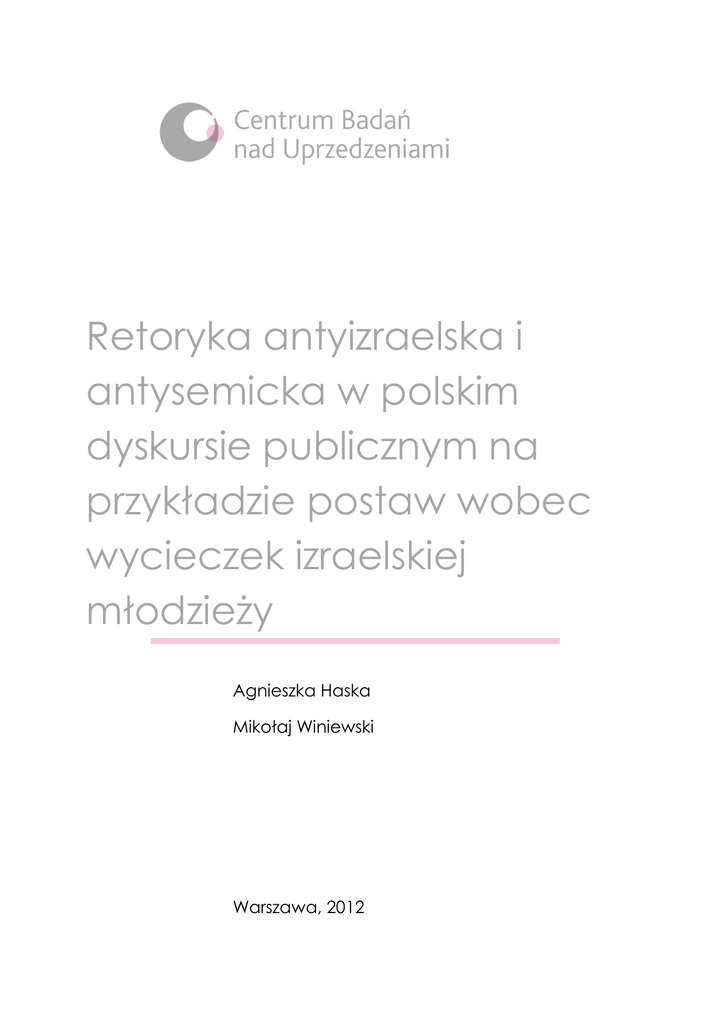 Retoryka antyizraelska i antysemicka w polskim dyskursie publicznym na przykładzie postaw wobec wycieczek izraelskiej młodzieży Agnieszka Haska Mikołaj Winiewski Warszawa, 2012 0 Polskie postawy wobec Izraela niemal od samego początku istnienia tego państwa były kształtowane przez kilka czynników. Pierwszym, chyba najważniejszym i najczęściej dyskutowanym, była i jest sytuacja polityczna. W czasach komunistycznych przywódcy polityczni oraz oficjalne media wielokrotnie identyfikowały i zwalczały różnych „wrogów” zarówno wewnętrznych (m.in. działaczy podziemia niepodległościowego z czasów II wojny światowej), jak i zewnętrznych (np. zachodni kapitalizm). Wytwarzanie w społeczeństwie poczucia zagrożenia jest popularnym narzędziem sprawowania władzy totalitarnej. Jednym z bardziej jaskrawych przykładów tego typu działalności była „antysyjonistyczna” kampania Marca '68. Jeszcze w 1967r. władze PRL zerwały stosunki dyplomatyczne z Izraelem (jako skutek presji wywieranej przez popierający Arabów w wojnie sześciodniowej ZSRR). Uderzające jest, że antyizraelska i antysemicka kampania propagandowa roku 68’, w której obciążono Żydów odpowiedzialnością za wybuch studenckich protestów (wiosną tego roku), a z czasem także za zbrodnie stalinowskie przeciw narodowi polskiemu, konsekwentnie unikała stosowania słów „Żyd” czy „żydowski” i odcinała się od antysemityzmu. Głoszono nawet hasło „Antysemityzm – nie! Antysyjonizm – tak!”. Mimo to Żydzi zostali usunięci ze stanowisk w partii, służbie bezpieczeństwa, wojsku i na uniwersytetach, a wielu z nich zdecydowało się na emigrację (przy wyjeździe wymuszano na nich zrzeczenie się obywatelstwa polskiego). Skutki Marca 68’ – w tym postrzeganie Polski jako kraju wysoce antysemickiego – w dużej mierze trwają do dziś. Po transformacji ustrojowej wiele partii i ruchów politycznych sięgało, zależnie od własnych interesów, zarówno po retorykę pro- jak i antyizraelską. Wyniki ogólnopolskich badań (przeprowadzonych przez OBOP) wskazują, że punktem zwrotnym w postrzeganiu 1 Izraela przez Polaków było odbudowanie relacji dyplomatycznych (w kwietniu 1990r.) i wizyta prezydenta Lecha Wałęsy w Izraelu w 1991 roku. Poza wydarzeniami politycznymi, istotną rolę w kształtowaniu postaw wobec Izraela odgrywają stereotypy antysemickie i stopień identyfikacji Żydów z państwem Izrael z jednej strony oraz społeczne normy politycznej poprawności, ograniczające negatywne postawy wobec Żydów, z drugiej. Arnold Forster i Benjamin Epstein w swojej kontrowersyjnej książce z 1974r (The new anti-semitism) utożsamili postawy antysemickie z postawami antyizraelskimi oraz twierdzili, że jedną z form antysemityzmu jest niedocenianie ogromnej roli jaką istnienie państwa Izrael odgrywa dla przetrwania narodu żydowskiego. O ile można się nie zgadzać z całą koncepcją, warto się zastanowić nad związkami pomiędzy postawami wobec Żydów i postawami wobec Izraela. Wydaje się, że sytuacja w Polsce jest w pewien sposób specyficzna w porównaniu z Europą Zachodnią. Niektórzy badacze społeczni twierdzą, że za względu na relatywną słabość norm politycznej poprawności w Polsce, przypadki bezpośredniego i otwartego wyrażania negatywnych postaw wobec mniejszości etnicznych lub innych stygmatyzowanych grup społecznych są nadal dość powszechne. Badania przeprowadzone przez Anti-Defamation League (ADL) w kilku krajach europejskich (ADL 2005, 2007, 2009, 2011) wydają się potwierdzać tę hipotezę. Polska konsekwentnie osiągała w nich jeden z najwyższych wskaźników występowania postaw antysemickich. Jednocześnie badania obrazu Izraela wśród mieszkańców 27 krajów (w tym Polski) przeprowadzone w 2006 roku dla BBC World Service wykazały, że chociaż polska opinia publiczna ma do Izraela raczej negatywny stosunek, to w porównaniu do krajów Europy Zachodniej (np. Niemiec, Grecji czy Francji) jest on ciągle nienajgorszy. Warto zwrócić uwagę na ten, swego rodzaju dualizm postaw wobec Żydów i wobec Izraela, zwłaszcza w kontekście analizowania sposobów w jakich w Polsce mówi się 2 zarówno o trudnej przeszłości polsko-żydowskiej, jak i o współczesnych stosunkach polskoizraelskich. Ponieważ kompleksowa analiza stosunków polsko-izraelskich wykracza poza zakres naszego raportu, postanowiliśmy skupić się szczególnie na kwestii odbioru wycieczek izraelskiej młodzieży do Polski. Jest to przykład o tyle ciekawy, że łączy w sobie zarówno konieczność odniesienia się do wspólnej przeszłości (wycieczki odwiedzają głównie liczne miejsca pamięci związane z martyrologią Żydów) oraz współczesny kontekst polityczny. Pierwsze wycieczki izraelskiej młodzieży miały miejsce jeszcze w okresie PRL-u. Na szerszą skalę zaczęto organizować je od 1988 roku, kiedy to program wizyt studyjnych w Polsce stał się oficjalnym projektem izraelskiego Ministerstwa Edukacji i objęto nim wszystkie szkoły w Izraelu. Od początku lat 90-tych podróże młodzieży w ramach programów edukacyjnych są bardzo ważnym elementem nauczania w Izraelu. Zagłada stanowi centralny element kształtujący współczesną tożsamość izraelską. Celem wyjazdu jest przede wszystkim poznanie historii Zagłady oraz bogactwa i różnorodności żydowskiego życia kulturalnego przed II wojną światową. Podróż nie jest obowiązkowa; zgłaszać się na nią mogą uczniowie w wieku 17-18 lat, którzy przechodzą wielomiesięczne przygotowania (ich rodziny współfinansują wyprawę). Wycieczki zwykle trwają około 8-10 dni. Uczestnicy wyjazdu zwiedzają polskie miasta i miasteczka, obozy, w których dokonała się Zagłada oraz miejsca istotne z kulturalnego i religijnego punktu widzenia (np. Leżajsk czy Górę Kalwarię). Młodzieży towarzyszą wykwalifikowani przez Yad Vashem przewodnicy lub nauczyciele, którzy ukończyli spe