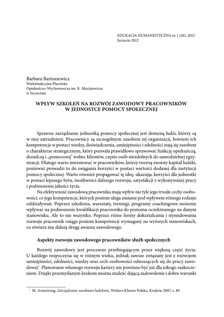 EDUKACJA HUMANISTYCZNA nr 1 (26), 2012 Szczecin 2012 Barbara Bartoszewicz Wielofunkcyjna Placówka Opiekuńczo-Wychowawcza im. K. Maciejewicza w Szczecinie WPŁYW SZKOLEŃ NA ROZWÓJ ZAWODOWY PRACOWNIKÓW W JEDNOSTCE POMOCY SPOŁECZNEJ Sprawne zarządzanie jednostką pomocy społecznej jest domeną ludzi, którzy są w niej zatrudnieni. Pracownicy są szczególnym zasobem tej organizacji, bowiem ich kompetencje w postaci wiedzy, doświadczenia, umiejętności i zdolności stają się zasobem o charakterze strategicznym, który pozwala prawidłowo sprawować funkcję opiekuńczą, doradczą i „pomocową” wobec klientów, często osób niezdolnych do samodzielnej egzystencji. Dlatego warto inwestować w pracowników, którzy tworzą swoisty kapitał ludzki, ponieważ prowadzi to do osiągania korzyści w postaci wartości dodanej dla instytucji pomocy społecznej. Warto również propagować tę ideę, ukazując korzyści dla jednostki w postaci lepszego bytu, możliwości dalszego rozwoju, satysfakcji z wykonywanej pracy i podniesienia jakości życia. Na efektywność zawodową pracownika mają wpływ nie tyle jego trwałe cechy osobowości, co jego kompetencje, których poziom ulega zmianie pod wpływem różnego rodzaju oddziaływań. Poprzez szkolenia, warsztaty, treningi, programy coachingowe możemy wpływać na podnoszenie kwalifikacji pracownika do poziomu oczekiwanego na danym stanowisku. Ale to nie wszystko. Poprzez różne formy dokształcania i stymulowania rozwoju pracownik osiąga poziom kompetencji wymagany na wyższych stanowiskach, co otwiera mu dalszą drogę awansu zawodowego. Aspekty rozwoju zawodowego pracowników służb społecznych Rozwój zawodowy jest procesem przebiegającym przez większą część życia. U każdego rozpoczyna się w różnym wieku, jednak zawsze związany jest z rozwojem umiejętności, zdolności, wiedzy oraz cech osobowości odnoszących się do pracy zawodowej1. Planowanie własnego rozwoju kariery nie powinno być już dla nikogo zaskoczeniem. Dzięki przemyślanym krokom można znaleźć dającą zadowolenie i dobre warunki 1 M. Armstrong, Zarządzanie zasobami ludzkimi, Wolters Kluwer Polska, Kraków 2007, s. 89. 246 Barbara Bartoszewicz finansowe pracę. Im lepiej jest człowiek do tego przygotowany, tym większe ma szanse, że proces ten zakończy się sukcesem. Zmiany zachodzące w dzisiejszym świecie, związane z konkurencją, nowymi technologiami, globalizacją, sprawiają, że osoby które chcą utrzymać się i rozwijać na rynku pracy, muszą planować i kształtować swój rozwój zawodowy od początku wstąpienia na ścieżkę zawodową. W czasach, gdy najpopularniejszymi słowami na rynku pracy są: mobilność, elastyczność, przekwalifikowanie się, nie można mówić o tradycyjnym przypisywaniu na stałe osoby do konkretnej branży. Dlatego niezmiernie ważne jest, aby posiadać w swoim portfolio szeroki wachlarz kompetencji. Kluczem do sukcesu są umiejętności, rozległe kwalifikacje i świadome oraz dojrzałe budowanie swojej drogi zawodowej. Ludzie pytani o to, czym kierują się przy wyborze miejsca pracy, najczęściej wybierają satysfakcję z wykonywanego zawodu oraz dobrą atmosferę. Od współczesnego pracownika pomocy społecznej wymaga się dobrej znajomości ciągle zmieniających się przepisów, odporności na stres i wypalenie zawodowe, dobrego radzenia sobie w różnych sytuacjach z trudnym klientem i dodatkowo kreatywności, innowacyjności, umiejętności kooperowania z różnymi podmiotami, umiejętności korzystania z zasobów instytucjonalnych i ludzkich oraz wielu innych cech osobowościowych i moralnych. Specyfika zawodu pracownika pomocy społecznej polega na tym, że w praktyce zawodowej realizowana jest nie jedna rola zawodowa, ale seria ról. Role zawodowe tej grupy pracowników wynikają z kategorii aktywności celów, jakim służy ta aktywność. Zakres ról zawodowych zależny jest od specyficznych zadań, jakie pracownik realizuje wobec klienta, instytucji oraz społeczności. W literaturze przedmiotu wymienia się najczęściej takie role zawodowe, jak: planista, badacz, administrator, konsultant, superwizor, nauczyciel, kierownik, adwokat, arbiter, pośrednik, zarządzający przypadkiem, mediator, negocjator, terapeuta, osoba kierująca, doradca. W świetle ustawy o pomocy społecznej pojawia się zapotrzebowanie na inny model roli zawodowej pracownika pomocy społecznej. Wyraźnemu poszerzeniu uległy zadania oraz oczekiwania posiadania przez tę grupę zawodową znacznie szerszych umiejętności. Rozwój zawodowy pracowników pomocy społecznej – misja czy konieczność Rozwój zawodowy przebiega w ramach ogólnego rozwoju człowieka i dotyczy niemal całego życia. Teorie rozwoju zawodowego podkreślają, że rozpoczyna się on w okresie dzieciństwa i trwa do wieku dojrzałego. Rozwój zawodowy to proces wdrażania obrazu samego siebie. Poglądy ludzi na to, kim są, zostają odzwierciedlone w tym, co robią. Jest to zatem postępujący, ciągły i nieodwracalny proces, którego celem jest wybór zawodu. Kierunek i tempo przechodzenia jednostki od jednego poziomu zawodowego do drugiego jest uzależnione od inteligencji, pozycji społecznej, ekonomicznej, zainteresowań i wartości. Satysfakcja zawodowa i życiowa zależy od zakresu, w jakim jednostka może w swojej pracy dać wyraz własnym zdolnościom, zainteresowaniom i wartościom. Gdy człowiek może w swojej pracy zawodowej wyrazić swój charakter, gdy jednoczy się z misją instytucji, w której pracuje, ma poczucie samorealizacji, przynależności i stałości. Może wykonywać taką rolę zawodową, która go inspiruje i motywuje do efektywnej pracy2. Dodat2 A. Miś, Koncepcja rozwoju kariery zawodowej w organizacji, [w:] Zarządzanie zasobami ludzkimi, red. H. Król, A. Ludwiczyński, PWN, Warszawa 2007, s. 356. Wpływ szkoleń na rozwój zawodowy pracowników... 247 kowo na efektywność mają wpływ trwałe cech