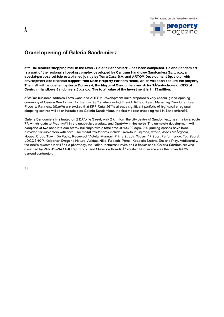 Grand opening of Galeria Sandomierz – The modern shopping mall in the town - Galeria Sandomierz - has been completed. Galeria Sandomierz is a part of the regional shopping complex developed by Centrum Handlowe Sandomierz Sp. z o.o., a special-purpose vehicle established jointly by Terra Casa S.A. and ARTOM Development Sp. z o.o. with development and financial support from Keen Property Partners Retail, which will soon acquire the property. The mall will be opened by Jerzy Borowski, the Mayor of Sandomierz and Artur T³ustochowski, CEO of Centrum Handlowe Sandomierz Sp. z o.o. The total value of the investment is €13 million. “Our business partners Terra Casa and ARTOM Development have prepared a very special grand opening ceremony at Galeria Sandomierz for the town’s inhabitants,― said Richard Keen, Managing Director at Keen Property Partners. “We are excited that KPP Retail’s already significant portfolio of high-profile regional shopping centres will soon include also Galeria Sandomierz, the first modern shopping mall in Sandomierz―. Galeria Sandomierz is situated on 2 B³onie Street, only 2 km from the city centre of Sandomierz, near national route 77, which leads to Przemyœl in the south via Jaroslaw, and Opatów in the north. The complete development will comprise of two separate one-storey buildings with a total area of 10,000 sqm. 200 parking spaces have been provided for customers with cars. The mall’s tenants include Carrefour Express, Avans, Jaœ i Ma³gosia, House, Cropp Town, De Facto, Reserved, Vistula, Monnari, Prima Strada, Wojas, 4F Sport Performance, Top Secret, LOGOSHOP, Kolporter, Drogeria Natura, Adidas, Nike, Reebok, Puma, Kopalnia Srebra, Era and Play. Additionally, the mall's customers will find a pharmacy, the Italian restaurant Invito and a flower shop. Galeria Sandomierz was designed by PERBO-PROJEKT Sp. z o.o., and Mieleckie Przedsiêbiorstwo Budowlane was the project’s general contractor. 11