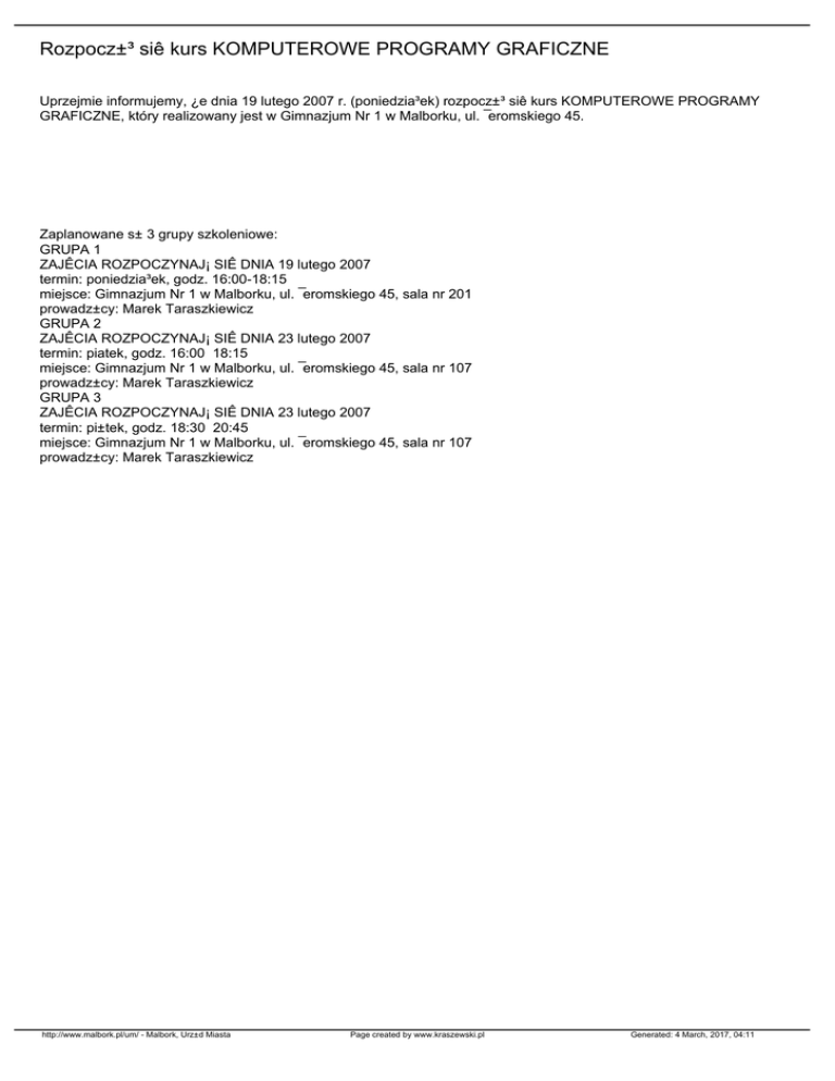 Rozpocz±³ siê kurs KOMPUTEROWE PROGRAMY GRAFICZNE Uprzejmie informujemy, ¿e dnia 19 lutego 2007 r. (poniedzia³ek) rozpocz±³ siê kurs KOMPUTEROWE PROGRAMY GRAFICZNE, który realizowany jest w Gimnazjum Nr 1 w Malborku, ul. ¯eromskiego 45. Zaplanowane s± 3 grupy szkoleniowe: GRUPA 1 ZAJÊCIA ROZPOCZYNAJ¡ SIÊ DNIA 19 lutego 2007 termin: poniedzia³ek, godz. 16:00-18:15 miejsce: Gimnazjum Nr 1 w Malborku, ul. ¯eromskiego 45, sala nr 201 prowadz±cy: Marek Taraszkiewicz GRUPA 2 ZAJÊCIA ROZPOCZYNAJ¡ SIÊ DNIA 23 lutego 2007 termin: piatek, godz. 16:00 18:15 miejsce: Gimnazjum Nr 1 w Malborku, ul. ¯eromskiego 45, sala nr 107 prowadz±cy: Marek Taraszkiewicz GRUPA 3 ZAJÊCIA ROZPOCZYNAJ¡ SIÊ DNIA 23 lutego 2007 termin: pi±tek, godz. 18:30 20:45 miejsce: Gimnazjum Nr 1 w Malborku, ul. ¯eromskiego 45, sala nr 107 prowadz±cy: Marek Taraszkiewicz http://www.malbork.pl/um/ - Malbork, Urz±d Miasta Page created by www.kraszewski.pl Generated: 4 March, 2017, 04:11