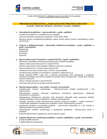 Projekt „EURO EDUKACJA” współfinansowany jest ze środków Unii Europejskiej w ramach Europejskiego Funduszu Społecznego PROGRAM SZKOLENIA „ZARZĄDZANIE PROJEKTAMI EFS” 60 godz. szkolenia (48 godz. warsztatu i 12 godz. wykładu) 1. Zarządzanie projektem - wprowadzenie: 1 godz. wykładu zarządzanie projektem a zarządzanie przez projekty wybrane metodyki zarządzania projektami: PCM, PMI, IPMA kluczowe obszary zarządzania projektami: zakres, koszty, jakość, zasoby, komunikacja, ryzyko, zamówienia 2. Umowa o dofinansowanie - obowiązki realizatora projektu: 1 godz. wykładu, 2 godz. warsztatów Monitoring - Rozliczanie - Ewaluacja - Kontrola 4. Monitoring projektu - case study: 14 godz. warsztatów projektowanie systemu monitoringu - dokumentowanie działań projektowych i ich raportowanie dokumentacja procesu rekrutacji (regulamin, formularze zgłoszeniowe, deklaracja uczestnictwa w projekcie) dokumentacja szkoleniowa, doradcza, listy obecności, dzienniki zajęć, programy szkoleń, rozkład materiału, umowy szkoleniowe, ankiety ewaluacyjne itd. strategia promocji, zasady konstruowania planów promocji projektu - zasady promocji i oznakowania projektów (oznakowanie projektów, biura, dokumentacji, sprzętu) monitoring przepływu uczestników projektu – opracowanie Załącznika nr 2 do wniosku o dofinansowanie oraz formularza PEFS wykorzystanie wyników monitoringu w zarządzaniu projektem - dokonywanie zmian w projekcie kontrola dokumentów (regulaminy, harmonogramy zajęć) 5. Aspekty finansowe realizacji projektów: 2 godz. wykładów, 2 godz. warsztatów zasady kwalifikowalności wydatki faktycznie poniesione Centrum Szkoleń i Innowacji ul. Sokolska 65, 40-087 Katowice e-mail: [email protected] tel. +48 505 422 575; www.csi.lublin.pl 1 Sprawozdawczość i kontrola w ramach PO KL: 3 godz. wykładów dokumenty określające zasady sprawozdawczości i kontroli projektów ogólne zasady sprawozdawczości w ramach PO KL poziomy sprawozdawczości (projekt, działanie, priorytet, program) zakres przedmiotowy i terminy sprawozdawczości schemat procesu sprawozdawczości w PO KL, system SIMIK monitorowanie przepływu uczestników w projekcie, (Załącznik nr 2) zasady działania PEFS i jego rola w zakresie monitoringu EFS (rezygnacje w projekcie, wymiana uczestnika, powrót do projektu uczestnika, który zrezygnował) - zasady dot. ochrony danych osobowych zakres i rodzaje kontroli w ramach PO KL instytucje uprawnione do przeprowadzania kontroli Strona 3. Projekt „EURO EDUKACJA” współfinansowany jest ze środków Unii Europejskiej w ramach Europejskiego Funduszu Społecznego okres kwalifikowania dowody poniesienia wydatku limity wydatków przepływy finansowe w projekcie obieg dokumentów stosowanie zasady konkurencyjności 6. Wniosek o płatność w ramach PO KL: 1 godz. wykładu, 14 godz. warsztatów omówienie struktury wniosku załączniki harmonogram płatności zasady opracowania wniosku o płatność – case study Generator wniosków płatniczych (GWP) 7. Ewaluacja projektu: 2 godz. wykładów, 6 godzin warsztatów cechy, zakres i rodzaje ewaluacji metody ewaluacji projektu (kwestionariusze, ankiety, raporty) zasady i kryteria ewaluacji projektów monitoring a ewaluacja wykorzystanie ewaluacji w planowaniu przyszłych projektów przygotowanie planu ewaluacji projektu opracowanego w ramach szkolenia Strona 2 8. Zarządzanie zasobami ludzkimi w projekcie: 2 godz. wykładów, 10 godzin warsztatów zespół projektowy - personel niezbędny do realizacji projektu identyfikacja zadań i planowanie pracy zespołu projektowego – opracowanie struktury zarządzania zespołem projektowym zatrudnianie kadry: zakresy obowiązków, rodzaje umów, karta czasu pracy – case study zasady efektywnego zarządzania zespołem projektowym komunikacja wewnętrzna w zespole Centrum Szkoleń i Innowacji ul. Sokolska 65, 40-087 Katowice e-mail: [email protected] tel. +48 505 422 575; www.csi.lublin.pl