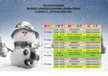 Plan Ferii Zimowych dla dzieci i młodzieży w Gminnym Ośrodku Kultury w dniach 15 – 26 lutego 2016 roku. 15 lutego 16 lutego 17 lutego 18 lutego 19 lutego Godz. 13.00 Godz. 14.00 Godz. 15.00 Godz. 13 -15.00 Godz. 15.00 Godz. 13.00 Godz. 14.00 Godz. 15.00 Godz. 13 -15.00 MINI DANCE ERATO GRUPA WOKALNA Godz. 15.00 Godz. 13.00 Godz. 14.00 Godz. 15.00 KABARET MINI DANCE ERATO GRUPA WOKALNA Dzieci i młodzieży z Gminy Domaradz KABARET MINI DANCE ERATO GRUPA WOKALNA Dzieci i młodzieży z Gminy Domaradz Zajęcia taneczne Zajęcia taneczne Zajęcia wokalne Gry i zabawy dla dzieci Zajęcia kabaretowe Zajęcia taneczne Zajęcia taneczne Zajęcia wokalne Gry i zabawy dla dzieci Zajęcia kabaretowe Zajęcia taneczne Zajęcia taneczne Zajęcia wokalne