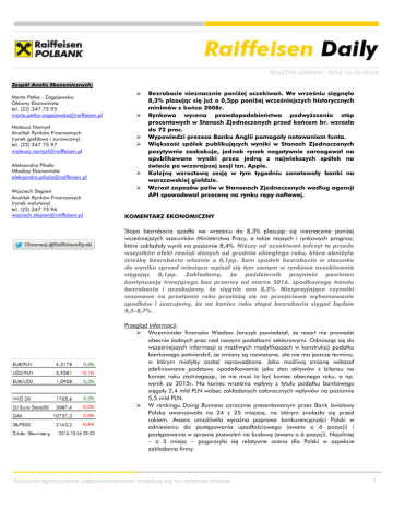 BIULETYN DZIENNY, 2016-10-26 09:04 Zespół Analiz Ekonomicznych: Marta Petka - Zagajewska. Główny Ekonomista tel. (22) 347 75 95 [email protected] Mateusz Namysł Analityk Rynków Finansowych (rynek giełdowy i surowcowy) tel. (22) 347 75 97 [email protected] Aleksandra Pikała Młodszy Ekonomista [email protected] Wojciech Stępień Analityk Rynków Finansowych (rynek walutowy) tel. (22) 347 75 96 [email protected] Bezrobocie nieznacznie poniżej oczekiwań. We wrześniu sięgnęło 8,3% plasując się już o 0,5pp poniżej wcześniejszych historycznych minimów z końca 2008r. Rynkowa wycena prawdopodobieństwa podwyższenia stóp procentowych w Stanach Zjednoczonych przed końcem br. wzrosła do 72 proc. Wypowiedzi prezesa Banku Anglii pomagały notowaniom funta. Większość spółek publikujących wyniki w Stanach Zjednoczonych pozytywnie zaskakuje, jednak rynek negatywnie zareagował na opublikowane wyniki przez jedną z najwiekszych spółek na świecie po wczorajszej sesji tzn. Apple. Kolejną wzrostową sesję w tym tygodniu zanotowały banki na warszawskiej giełdzie. Wzrost zapasów paliw w Stananach Zjednoczonych według agencji API spowodował przecenę na rynku ropy naftowej. KOMENTARZ EKONOMICZNY Stopa bezrobocia spadła we wrześniu do 8,3% plasując się nieznacznie poniżej wcześniejszych szacunków Ministerstwa Pracy, a także naszych i rynkowych prognoz, które zakładały wynik na poziomie 8,4%. Niższy od oczekiwań odczyt to przede wszystkim efekt rewizji danych od grudnia ubiegłego roku, która obniżyła ścieżkę bezrobocia właśnie o 0,1pp. Sam spadek bezrobocia w stosunku do wyniku sprzed miesiąca wpisał się tym samym w rynkowe oczekiwania sięgając 0,1pp. Zakładamy, że październik przynieść powinien kontynuację trwającego bez przerwy od marca 2016. spadkowego trendu bezrobocia i oczekujemy, że sięgnie ono 8,2%. Niesprzyjające czynniki sezonowe na przełomie roku przełożą się na przejściowe wyhamowanie spadków i szacujemy, że na koniec roku stopa bezrobocia sięgać będzie 8,5-8,7%. Przegląd informacji: Wiceminister finansów Wiesław Janczyk powiedział, że resort nie prowadzi obecnie żadnych prac nad nowymi podatkami sektorowymi. Odnosząc się do wcześniejszych informacji o możliwych modyfikacjach w konstrukcji podatku bankowego potwierdził, że zmiany są rozważane, ale nie ma jeszcze terminu, w którym miałyby zostać wprowadzone. Jako możliwą zmianę wskazał zdefiniowanie podstawy opodatkowania jako stan aktywów z bilansu na koniec roku zastrzegając, że nie musi to być koniec obecnego roku, a np. wynik za 2015r. Na koniec września wpływy z tytułu podatku bankowego sięgały 2,4 mld PLN wobec zakładanych całorocznych wpływów na poziomie 5,5 mld PLN. W rankingu Doing Business corocznie prezentowanym przez Bank światowy Polska awansowała na 24 z 25 miejsca, na którym znalazła się przed rokiem. Awans umożliwiła wyraźna poprawa konkurencyjności Polski w odniesieniu do postępowania upadłościowego (awans o 6 pozycji) i postępowania w sprawie pozwoleń na budowę (awans o 6 pozycji). Najsilniej – o 5 miejsc – pogorszyła się relatywne ocena dla Polski w aspekcie zakładania firmy. Klauzula ograniczenia odpowiedzialności znajduje się na ostatniej stronie. 1 BIULETYN DZIENNY, 26 października 2016, GODZ 9.10 KOMENTARZ RYNKOWY We wtorek po południu kurs EUR/USD zanotował nowe ośmiomiesięczne intradeyowe minima schodząc w poniżej poziomu 1,085, później dolar oddał jednak część umocnienia i kurs głównej pary walutowej powrócił w rejon poziomów 1,087-1,089, gdzie porusza się od początku tygodnia. Dolar pozostaje silny wobec innych głównych walut. We wtorek w trakcie sesji USDJPY wzrósł powyżej 104,8 i jen tym zalazł się blisko swoich najsilniejszych poziomów do dolara od trzech miesięcy. Indeks dolarowy DXY zbliżył się i jest najmocniejszych od ośmiu miesięcy. Silny dolar to efekt wciąż rosnącego w ocenie rynku prawdopodobieństwa podwyżki stóp procentowych przez Fed w grudniu. Notowania kontraktów terminowych wskazują, że prawdopodobieństwo to wycenienie przez rynek przekroczyło 72 proc. Oczekiwania podwyżek stóp procentowych w USA wspierają ostatnie wypowiedzi członków Fed. W poniedziałek jastrzębi wydźwięk miała wypowiedz szefa oddziału Fed z Chicago Charlesa Evansa, który opowiedział się za trzema podwyżkami do końca 2017 r. W ubiegłym tygodniu na podwyżkę przed końcem roku wskazał natomiast wiceprezes Fed Stanley Fisher. Dodatkowo oczekiwania podwyżki stóp procentowych tym roku wspierają oczekiwania zwycięstwa w listopadowych wyborach prezydenckich w USA Hillary Clinton. Zwycięstwo kandydatki Partii Demokratycznej w ocenie rynku powinno zapewnić bardziej stabilne otoczenie polityczne w porównaniu do ewentualnego zwycięstwa kandydata Republikanów Donalda Trumpa. Dodatkowo zwycięstwo Clinton może wiązać się ze zwiększeniem wydatków fiskalnych, co ułatwić może Fed kontynuacje cyklu zacieśniania polityki monetarnej. W centrum uwagi we wtorek znalazły się wypowiedzi prezesa banku centralnego Wielkiej Brytanii Marka Carneya. Szef BoE w trakcie przemówienia w brytyjskim parlamencie oświadczył, „że istnieje limit” w kwestii gotowości do tolerowania inflacji powyżej celu oraz dodał, że kierowanemu przez niego bankowi centralnemu „nie jest obojętny” poziom kursu walutowego. Słowa Carneya, które zostały odebrane jako jastrzębi sygnał, ucięły nieco spekulacje, że BoE zdecyduje się na dalsze luzowanie polityki monetarnej nawet kosztem wzrostu inflacji, pomogły notowaniom funta. W oczekiwaniu na wystąpienie Carneya kurs USDGBP wyraźnie spadał i był najsłabszy w stosunku do dolara od „flash crashu”, z 10 października, w reakcji na deklaracje szefa kurs funta BoE odbił. Umiarkowanym spadkiem zakończyły wtorkową sesje giełdy akcji w USA. S&P 500 stracił 0,4 proc. A tym co przykuwało