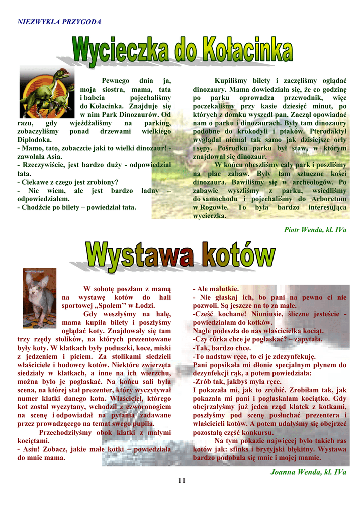 NIEZWYKŁA PRZYGODA Pewnego dnia ja, moja siostra, mama, tata i babcia pojechaliśmy do Kołacinka. Znajduje się w nim Park Dinozaurów. Od wjeŜdŜaliśmy na parking, ponad drzewami wielkiego Kupiliśmy bilety i zaczęliśmy oglądać dinozaury. Mama dowiedziała się, Ŝe co godzinę po parku oprowadza przewodnik, więc poczekaliśmy przy kasie dziesięć minut, po których z domku wyszedł pan. Zaczął opowiadać nam o parku i dinozaurach. Były tam dinozaury podobne do krokodyli i ptaków. Pterodaktyl wyglądał niemal tak samo jak dzisiejsze orły i sępy. Pośrodku parku był staw, w którym znajdował się dinozaur. W końcu obeszliśmy cały park i poszliśmy na plac zabaw. Były tam sztuczne kości dinozaura. Bawiliśmy się w archeologów. Po zabawie wyszliśmy z parku, wsiedliśmy do samochodu i pojechaliśmy do Arboretum w Rogowie. To była bardzo interesująca wycieczka. razu, gdy zobaczyliśmy Diplodoka. - Mamo, tato, zobaczcie jaki to wielki dinozaur! zawołała Asia. - Rzeczywiście, jest bardzo duŜy - odpowiedział tata. - Ciekawe z czego jest zrobiony? - Nie wiem, ale jest bardzo ładny – odpowiedziałem. - Chodźcie po bilety – powiedział tata. Piotr Wenda, kl. IVa - Ale malutkie. - Nie głaskaj ich, bo pani na pewno ci nie pozwoli. Są jeszcze na to za małe. -Cześć kochane! Niuniusie, śliczne jesteście powiedziałam do kotków. Nagle podeszła do nas właścicielka kociąt. -Czy córka chce je pogłaskać? – zapytała. -Tak, bardzo chce. -To nadstaw ręce, to ci je zdezynfekuję. Pani popsikała mi dłonie specjalnym płynem do dezynfekcji rąk, a potem powiedziała: -Zrób tak, jakbyś myła ręce. I pokazała mi, jak to zrobić. Zrobiłam tak, jak pokazała mi pani i pogłaskałam kociątko. Gdy obejrzałyśmy juŜ jeden rząd klatek z kotkami, poszłyśmy pod scenę posłuchać prezentera i właścicieli kotów. A potem udałyśmy się obejrzeć pozostałą część konkursu. Na tym pokazie najwięcej było takich ras kotów jak: sfinks i brytyjski błękitny. Wystawa bardzo podobała się mnie i mojej mamie. W sobotę poszłam z mamą na wystawę kotów do hali sportowej ,,Społem’’ w Łodzi. Gdy weszłyśmy na halę, mama kupiła bilety i poszłyśmy oglądać koty. Znajdowały się tam trzy rzędy stolików, na których prezentowane były koty. W klatkach były poduszki, koce, miski z jedzeniem i piciem. Za stolikami siedzieli właściciele i hodowcy kotów. Niektóre zwierzęta siedziały w klatkach, a inne na ich wierzchu, moŜna było je pogłaskać. Na końcu sali była scena, na której stał prezenter, który wyczytywał numer klatki danego kota. Właściciel, którego kot został wyczytany, wchodził z czworonogiem na scenę i odpowiadał na pytania zadawane przez prowadzącego na temat swego pupila. Przechodziłyśmy obok klatki z małymi kociętami. - Asiu! Zobacz, jakie małe kotki – powiedziała do mnie mama. Joanna Wenda, kl. IVa 11