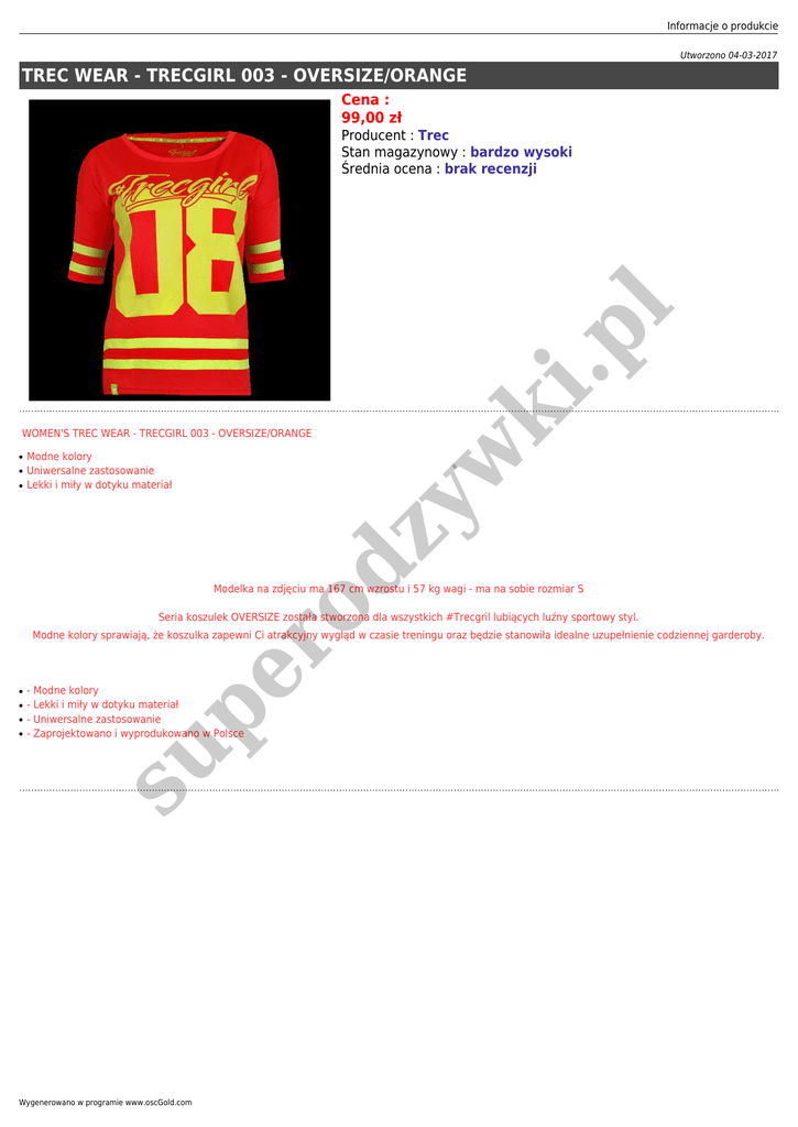 Informacje o produkcie Utworzono 04-03-2017 TREC WEAR - TRECGIRL 003 - OVERSIZE/ORANGE Cena : 99,00 zł ● ● Modne kolory Uniwersalne zastosowanie Lekki i miły w dotyku materiał ro dz y ● w WOMEN'S TREC WEAR - TRECGIRL 003 - OVERSIZE/ORANGE ki .p l Producent : Trec Stan magazynowy : bardzo wysoki Średnia ocena : brak recenzji Modelka na zdjęciu ma 167 cm wzrostu i 57 kg wagi - ma na sobie rozmiar S Seria koszulek OVERSIZE została stworzona dla wszystkich #Trecgril lubiących luźny sportowy styl. ● ● ● - Modne kolory - Lekki i miły w dotyku materiał - Uniwersalne zastosowanie - Zaprojektowano i wyprodukowano w Polsce su ● pe Modne kolory sprawiają, że koszulka zapewni Ci atrakcyjny wygląd w czasie treningu oraz będzie stanowiła idealne uzupełnienie codziennej garderoby. Wygenerowano w programie www.oscGold.com