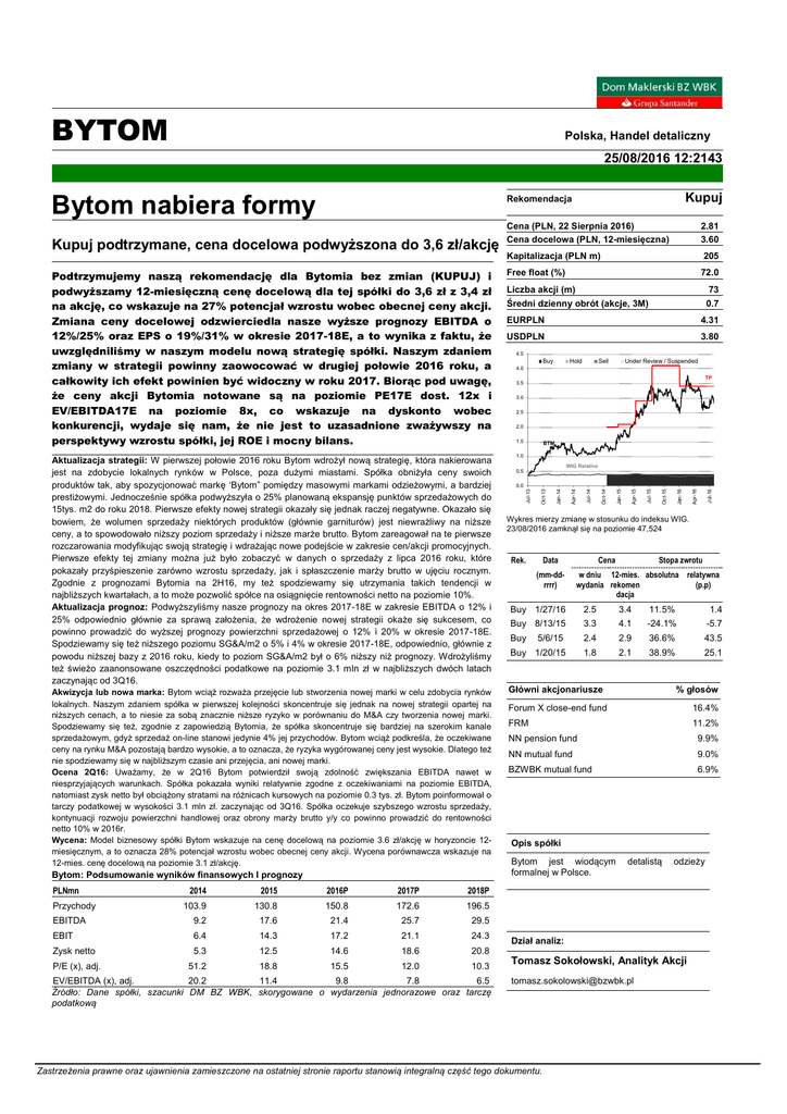 BYTOM Polska, Handel detaliczny 25/08/2016 12:2143 Akwizycja lub nowa marka: Bytom wciąż rozważa przejęcie lub stworzenia nowej marki w celu zdobycia rynków lokalnych. Naszym zdaniem spółka w pierwszej kolejności skoncentruje się jednak na nowej strategii opartej na niższych cenach, a to niesie za sobą znacznie niższe ryzyko w porównaniu do M&A czy tworzenia nowej marki. Spodziewamy się też, zgodnie z zapowiedzią Bytomia, że spółka skoncentruje się bardziej na szerokim kanale sprzedażowym, gdyż sprzedaż on-line stanowi jedynie 4% jej przychodów. Bytom wciąż podkreśla, że oczekiwane ceny na rynku M&A pozostają bardzo wysokie, a to oznacza, że ryzyka wygórowanej ceny jest wysokie. Dlatego też nie spodziewamy się w najbliższym czasie ani przejęcia, ani nowej marki. Ocena 2Q16: Uważamy, że w 2Q16 Bytom potwierdził swoją zdolność zwiększania EBITDA nawet w niesprzyjających warunkach. Spółka pokazała wyniki relatywnie zgodne z oczekiwaniami na poziomie EBITDA, natomiast zysk netto był obciążony stratami na różnicach kursowych na poziomie 0.3 tys. zł. Bytom poinformował o tarczy podatkowej w wysokości 3.1 mln zł. zaczynając od 3Q16. Spółka oczekuje szybszego wzrostu sprzedaży, kontynuacji rozwoju powierzchni handlowej oraz obrony marży brutto y/y co powinno prowadzić do rentowności netto 10% w 2016r. Wycena: Model biznesowy spółki Bytom wskazuje na cenę docelową na poziomie 3.6 zł/akcję w horyzoncie 12miesięcznym, a to oznacza 28% potencjał wzrostu wobec obecnej ceny akcji. Wycena porównawcza wskazuje na 12-mies. cenę docelową na poziomie 3.1 zł/akcję. Bytom: Podsumowanie wyników finansowych I prognozy 2014 2015 2016P 2017P 2018P 103.9 130.8 150.8 172.6 196.5 EBITDA 9.2 17.6 21.4 25.7 29.5 EBIT 6.4 14.3 17.2 21.1 24.3 Zysk netto 5.3 12.5 14.6 18.6 20.8 51.2 18.8 15.5 12.0 10.3 Przychody P/E (x), adj. EV/EBITDA (x), adj. 20.2 11.4 9.8 7.8 6.5 Źródło: Dane spółki, szacunki DM BZ WBK, skorygowane o wydarzenia jednorazowe oraz tarczę podatkową 205 Free float (%) 72.0 Liczba akcji (m) 73 Średni dzienny obrót (akcje, 3M) 0.7 EURPLN 4.31 USDPLN 3.80 4.5 Buy Hold Sell Under Review / Suspended 4.0 TP 3.5 3.0 2.5 2.0 1.5 BTM 1.0 WIG Relative 0.5 Jul-16 Jan-16 Jul-15 Oct-15 Apr-15 Jan-15 Jul-14 Oct-14 Apr-14 0.0 Jan-14 Aktualizacja strategii: W pierwszej połowie 2016 roku Bytom wdrożył nową strategię, która nakierowana jest na zdobycie lokalnych rynków w Polsce, poza dużymi miastami. Spółka obniżyła ceny swoich produktów tak, aby spozycjonować markę ‘Bytom” pomiędzy masowymi markami odzieżowymi, a bardziej prestiżowymi. Jednocześnie spółka podwyższyła o 25% planowaną ekspansję punktów sprzedażowych do 15tys. m2 do roku 2018. Pierwsze efekty nowej strategii okazały się jednak raczej negatywne. Okazało się bowiem, że wolumen sprzedaży niektórych produktów (głównie garniturów) jest niewrażliwy na niższe ceny, a to spowodowało niższy poziom sprzedaży i niższe marże brutto. Bytom zareagował na te pierwsze rozczarowania modyfikując swoją strategię i wdrażając nowe podejście w zakresie cen/akcji promocyjnych. Pierwsze efekty tej zmiany można już było zobaczyć w danych o sprzedaży z lipca 2016 roku, które pokazały przyśpieszenie zarówno wzrostu sprzedaży, jak i spłaszczenie marży brutto w ujęciu rocznym. Zgodnie z prognozami Bytomia na 2H16, my też spodziewamy się utrzymania takich tendencji w najbliższych kwartałach, a to może pozwolić spółce na osiągnięcie rentowności netto na poziomie 10%. Aktualizacja prognoz: Podwyższyliśmy nasze prognozy na okres 2017-18E w zakresie EBITDA o 12% i 25% odpowiednio głównie za sprawą założenia, że wdrożenie nowej strategii okaże się sukcesem, co powinno prowadzić do wyższej prognozy powierzchni sprzedażowej o 12% i 20% w okresie 2017-18E. Spodziewamy się też niższego poziomu SG&A/m2 o 5% i 4% w okresie 2017-18E, odpowiednio, głównie z powodu niższej bazy z 2016 roku, kiedy to poziom SG&A/m2 był o 6% niższy niż prognozy. Wdrożyliśmy też świeżo zaanonsowane oszczędności podatkowe na poziomie 3.1 mln zł w najbliższych dwóch latach zaczynając od 3Q16. 2.81 3.60 Kapitalizacja (PLN m) Jul-13 Podtrzymujemy naszą rekomendację dla Bytomia bez zmian (KUPUJ) i podwyższamy 12-miesięczną cenę docelową dla tej spółki do 3,6 zł z 3,4 zł na akcję, co wskazuje na 27% potencjał wzrostu wobec obecnej ceny akcji. Zmiana ceny docelowej odzwierciedla nasze wyższe prognozy EBITDA o 12%/25% oraz EPS o 19%/31% w okresie 2017-18E, a to wynika z faktu, że uwzględniliśmy w naszym modelu nową strategię spółki. Naszym zdaniem zmiany w strategii powinny zaowocować w drugiej połowie 2016 roku, a całkowity ich efekt powinien być widoczny w roku 2017. Biorąc pod uwagę, że ceny akcji Bytomia notowane są na poziomie PE17E dost. 12x i EV/EBITDA17E na poziomie 8x, co wskazuje na dyskonto wobec konkurencji, wydaje się nam, że nie jest to uzasadnione zważywszy na perspektywy wzrostu spółki, jej ROE i mocny bilans. Cena (PLN, 22 Sierpnia 2016) Cena docelowa (PLN, 12-miesięczna) Oct-13 Kupuj podtrzymane, cena docelowa podwyższona do 3,6 zł/akcję PLNmn Kupuj Rekomendacja Apr-16 Bytom nabiera formy Wykres mierzy zmianę w stosunku do indeksu WIG. 23/08/2016 zamknął się na poziomie 47,524 Rek. Data (mm-ddrrrr) Cena Stopa zwrotu w dniu 12-mies. absolutna relatywna wydania rekomen (p.p) dacja Buy 1/27/16 2.5 3.4 11.5% 1.4 Buy 8/13/15 3.3 4.1 -24.1% -5.7 Buy 5/6/15 2.4 2.9 36.6% 43.5 Buy 1/20/15 1.8 2.1 38.9% 25.1 Główni akcjonariusze % głosów Forum X close-end fund 16.4% FRM 11.2% NN pension fund 9.9% NN mutual fund 9.0% BZWBK mutual fund 6.9% Opis spółki Bytom jest wiodącym formalnej w Polsce. detalistą odzieży Dział analiz: Tomasz Sokołowski, Analityk Akcji [email protected] Zastrzeżenia prawne oraz ujawnienia zamieszczone na ostatniej stronie raportu stanowią integralną 