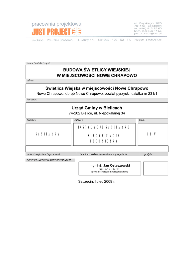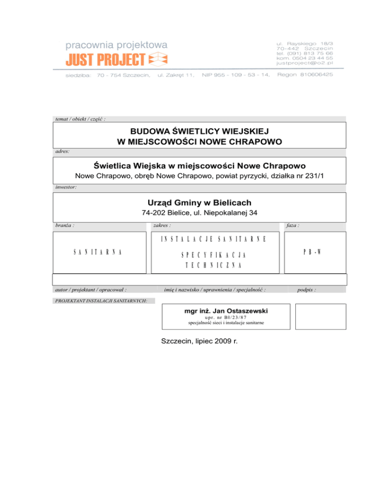 temat / obiekt / cz : BUDOWA WIETLICY WIEJSKIEJ W MIEJSCOWO CI NOWE CHRAPOWO adres: wietlica Wiejska w miejscowo ci Nowe Chrapowo Nowe Chrapowo, obr b Nowe Chrapowo, powiat pyrzycki, dzia ka nr 231/1 inwestor: Urz d Gminy w Bielicach 74-202 Bielice, ul. Niepokalanej 34 bran a : zakres : faza : INSTALACJE SANITARNE SANITARNA autor / projektant / opracowa : PB-W SPECYFIKACJA TECHNICZNA imi i nazwisko / uprawnienia / specjalno : PROJEKTANT INSTALACJI SANITARNYCH: mgr in . Jan Ostaszewski u p r. nr B / 2 3 / 8 7 specjalno sieci i instalacje sanitarne Szczecin, lipiec 2009 r. podpis : WYKAZ SPECYFIKACJI TECHNICZNYCH ST 2-1. Wentylacja mechaniczna CPV - 45331210-1 ST 2-2. Instalacja WOD-KAN CPV 4545330000-9 ST 2-2 Przy cze i zewn trzna instalacja wodoci gowa CPV 45 111 200-0, 45231300-8 ST 2-4 Zewn trzna instalacja kanalizacji sanitarnej CPV 45 111 200-0, CPV 45 232 440-8, 1 ST 2-1. Wentylacja. 1. Wst p 1.1.Przedmiot specyfikacji technicznej ST 2-1. Przedmiotem niniejszej specyfikacji s wymagania dotycz ce monta u urz dze i kana ów wentylacji mechanicznej. 1.2.Zakres robot obj tych niniejsz specyfikacj techniczn . Niniejsza specyfikacja obejmuje monta , monta wentylatorów typu azienkowego w kuchni zmywalni i pomieszczeniach wc. 2. Materia y. 2.1 Uzbrojenie przewodów wentylacyjnych zgodne z poni szym wykazem Lp 1w 2w 3w,4w Nazwa Zespó wywiewny 1 ( Aneks kuchenny) wentylator typ silent 200 q=100m3/h Dp= 25 Pa, 230V 8W + regulator REB prod VentureIndustries Zespól wywiewny 2 (zmywalnia) wentylator typ silent 100 q=200m3/h Dp= 40 Pa, 230V 29W + regultor obrotów REB Ventureindusties Zespól wywiewny 3, 4 (WC) wentylator typ silent 100 q=60m3/h Dp= 25 Pa, 230V 8W + regulator REB prod VentureIndustries Ilo 1 1 1+1 3.Wykonanie robót 3.1 Wentylatory czy do ciany za pomoc rub.. 5.Obmiar robót Jednostk obmiaru urz dze i elementów uzbrojenia instalacji jest komplet. Na jednostk obmiaru sk adaj si nast puj ce roboty: 5 . 1. 1. M on ta w e nt yl at o r ów 5. 1. 2. Kontrola poprawno ci dzia ania i regulacji wydajno ci. 6.P atno Jednostk p atno ci instalacji jest 1 kpl ( jednostka obmiaru), Cena za jednostk p atno ci ( cena jednostkowa ) winna zawiera sum kosztów bezpo rednich robocizny, materia ów i pracy sprz tu oraz kosztów po rednich i zysku wyliczon na jednostk przedmiarow 7. Przepisy , normy 7.1. Rozporz dzenie Ministra Infrastruktury z dnia 8 lutego 2003 r. w sprawie bezpiecze stwa i higieny pracy podczas wykonywania robót budowlanych. ( Dz.U. 03.47.4001) PN-87/B-03433 Instalacje wentylacji mechanicznej wywiewnej w budownictwie mieszkaniowym wielorodzinnym. Wymagania przy odbiorze ST2-2 Instalacja WOD-KAN 1. Wst p 1.1.Przedmiot specyfikacji technicznej ST2-2 Przedmiotem niniejszej specyfikacji s wymagania wykonania instalacji wod kan, u enie przewodów odywowych wykonanie pionów kanalizacyjnych wraz z podej ciami do przyborów, monta u przyborów sanitarnych, bia ego monta u, monta u , przewodów kanalizacyjnych kielichowych z PP czonych na wcisk, oraz monta u armatury wodoci gowej odcinaj cej i czerpalnej. 1.2.Zakres robot obj tych niniejsz specyfikacj techniczn . Niniejsza specyfikacja obejmuje monta w zakresie instalacji wodoci gowej: przewodów wodoci gowych z rur z ruroci gów warstwowych Pex z przek adka aluminiow , monta armatury czerpalnej i odcinaj cej, próby szczelno ci instalacji wodoci gowej p ukaniu i dezynfekcji instalacji wodoci gowej. 2 W zakresie kanalizacji sanitarnej obejmuje monta i pod czenie przyborów sanitarnych, ust pów, umywalek i zlewozmywaka. urz dze kuchennych. 2. Materia y Woda: przewody - rury warstwowe pex-al.-pex izolacja termiczna: - izolacja Thermaflex na przewodach rozdzielczych i pionach - izolacja Thermaflex w p aszczu z PCV wzgl dnie w tzw. „peszlu" armatura czerpalna: - baterie umywalkowe - baterie zlewozmywakowe - zawory ze z czk do w a armatura pozosta a: - zawory odcinaj ce kanalizacja: przewody: - rury kszta tki Pp i PVC o po czeniach kielichowych czone na uszczelki stosowane na podej ciach pod przybory - rury i kszta tki Pp , PCV o po czeniach kielichowych czone na uszczelki stosowane na poziomach przybory sanitarne: - umywalki ceramiczne - miski ust powe - zlewy ze stali nierdzewnej zgodnie z technologia kuchni armatura: - kratki ciekowe ze stali nierdzewnej - wywiewki, kanalizacyjne i zawory napowietrzaj ce - rewizje na pionach 3.Wykonanie robót Instalacja wodoci gowa przewody przed monta em i uk adaniem oczy ci od wewn trz i na stykach - nie uk ada rur uszkodzonych; rury uszkodzone mog by u yte po odci ciu odcinków uszkodzonych - odleg cianki rury lub izolacji od ciany, stropu, pod ogi lub innych przewodów winna wynosi 3-5 cm takie same odleg ci mi dzy równolegle biegn cymi przewodami poziomy uk ada ze spadkiem 3%0 w kierunku najni ej zainstalowanych przyborów sanitarnych podej cia do przyborów uk ada ze spadkiem w kierunku punktów czerpalnych rozprowadzenie w w ach w przegrodach budowlanych - rury po czy za pomoc zaciskanych z czek systemowych zmiany kierunków prowadzenia przewodów, wykona przy u yciu kolanek lub poprzez wyginanie przewodu przej cia przewodów przez ciany budynku wykona w tulejach ochronnych 3 po wykonaniu instalacji wykona prób szczelno ci na ci nienie 6 bar. Instalacja kanalizacyjna 3.2.1. Wyznaczenie miejsca u enia ruroci gu. 3.2.2. Wykonanie wykopów wraz z pod em dla przewodów odp ywowych i przykanalika 3.2.3. Obsadzanie uchwytów. 3.2.4. Przecinanie rur. 3.2.5. Obsadzenie rur przepustowych przy przej ciach przez ciany i stropy. 3.2.6. U enie rur i kszta tek. 3.2.7. Wykonanie po cze . 3.2.8. Przymocowanie ruroci gów. Przybory sanitarne - ust py 3.3.1. Wyznaczenie miejsca ustawienia ust pu. 3.3.2. Wykonanie otworów i obsadzenie ko ków. 3.3.3. Ustawienie miski; monta kompletnego urz dzenia sp ukuj cego,. 3.3.4. Za enie sedesu i zamocowanie ust pu wkr tami. 3.3.5. Po czenie z instalacj dop ywow i odp ywow . Przybory sanitarne - umywalki 3.4.1. Wyznaczenie miejsca ustawienia umywalki. 3.4.2. Obsadzenie w