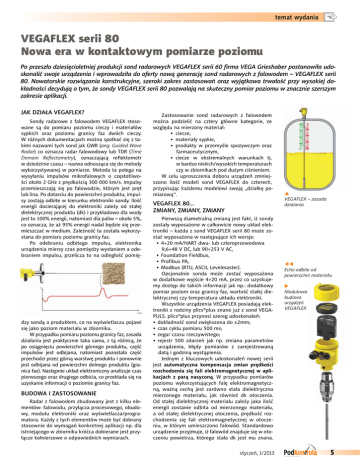 temat wydania VEGAFLEX serii 80 Nowa era w kontaktowym pomiarze poziomu Po przeszło dziesięcioletniej produkcji sond radarowych VEGAFLEX serii 60 firma VEGA Grieshaber postanowiła udoskonalić swoje urządzenia i wprowadziła do oferty nową generację sond radarowych z falowodem – VEGAFLEX serii 80. Nowatorskie rozwiązania konstrukcyjne, szeroki zakres zastosowań oraz wyjątkowa trwałość przy wysokiej dokładności decydują o tym, że sondy VEGAFLEX serii 80 pozwalają na skuteczny pomiar poziomu w znacznie szerszym zakresie aplikacji. JAK DZIAŁA VEGAFLEX? Sondy radarowe z falowodem VEGAFLEX stosowane są do pomiaru poziomu cieczy i materiałów sypkich oraz poziomu granicy faz dwóch cieczy. W różnych dokumentacjach można spotkać się z takimi nazwami tych sond jak GWR (ang. Guided Wave Radar) co oznacza radar falowodowy lub TDR (Time Domain Reflectometry), oznaczającą reflektometr w dziedzinie czasu – nazwa odnosząca się do metody wykorzystywanej w pomiarze. Metoda ta polega na wysyłaniu impulsów mikrofalowych o częstotliwości około 2 GHz z prędkością 300 000 km/s. Impulsy przemieszczają się po falowodzie, którym jest pręt lub lina. Po dotarciu do powierzchni produktu, impulsy zostają odbite w kierunku elektroniki sondy. Ilość energii docierającej do elektroniki zależy od stałej dielektrycznej produktu (dk) i przykładowo dla wody jest to 100% energii, natomiast dla paliw – około 5%, co oznacza, że aż 95% energii nadal będzie się przemieszczać w medium. Zależność ta została wykorzystana do pomiaru poziomu granicy faz. Po odebraniu odbitego impulsu, elektronika urządzenia mierzy czas pomiędzy wysłaniem a odebraniem impulsu, przelicza to na odległość pomię- dzy sondą a produktem, co na wyświetlaczu pojawi się jako poziom materiału w zbiorniku. W przypadku pomiaru poziomu granicy faz, zasada działania jest praktycznie taka sama, z tą różnicą, że po osiągnięciu powierzchni górnego produktu, część impulsów jest odbijana, natomiast pozostała część przechodzi przez górną warstwę produktu i ponownie jest odbijana od powierzchni dolnego produktu (granica faz). Następnie układ elektroniczny analizuje czas pierwszego oraz drugiego odbicia, co przekłada się na uzyskanie informacji o poziomie granicy faz. BUDOWA I ZASTOSOWANIE Radar z falowodem zbudowany jest z kilku elementów: falowodu, przyłącza procesowego, obudowy, modułu elektroniki oraz wyświetlacza/programatora. Każdy z tych elementów może być dobrany stosownie do wymagań konkretnej aplikacji np. dla istniejącego w zbiorniku króćca dobierane jest przyłącze kołnierzowe o odpowiednich wymiarach. Zastosowanie sond radarowych z falowodem można podzielić na cztery główne kategorie, ze względu na mierzony materiał: • ciecze, • materiały sypkie, • produkty w przemyśle spożywczym oraz farmaceutycznym, • ciecze w ekstremalnych warunkach tj. w bardzo niskich/wysokich temperaturach czy w zbiornikach pod dużym ciśnieniem. W celu uproszczenia doboru urządzeń zmniejszono ilość modeli sond VEGAFLEX do czterech, przypisując każdemu modelowi swoją „działkę pomiarową”. VEGAFLEX 80... ZMIANY, ZMIANY, ZMIANY Pierwszą diametralną zmianą jest fakt, iż sondy zostały wyposażone w całkowicie nowy układ elektroniki – każda z sond VEGAFLEX serii 80 może zostać wyposażona w następujące ich wersje: • 4÷20 mA/HART dwu- lub czteroprzewodowa 9,6÷48 V DC, lub 90÷253 V AC, • Foundation Fieldbus, • Profibus PA, • Modbus (RTU, ASCII, Levelmaster). Opcjonalnie sonda może zostać wyposażona w dodatkowe wyjście 4÷20 mA, przez co uzyskujemy dostęp do takich informacji jak np.: dodatkowy pomiar poziom oraz granicy faz, wartość stałej dielektrycznej czy temperatura układu elektroniki. Wszystkie urządzenia VEGAFLEX posiadają elektroniki z rodziny plics®plus znane już z sond VEGAPULS. plics®plus przynosi szereg udoskonaleń: • dokładność sond zwiększona do ±2mm; • czas cyklu pomiaru 500 ms; • zegar czasu rzeczywistego; • rejestr 500 zdarzeń jak np. zmiana parametrów urządzenia, błędy pomiarów z zarejestrowaną datą i godziną wystąpienia. Jednym z kluczowych udoskonaleń nowej serii jest automatyczna kompensacja zmian prędkości rozchodzenia się fali elektromagnetycznej w aplikacjach z parą nasyconą. W przypadku pomiarów poziomu wykorzystujących falę elektromagnetyczną, ważną cechą jest zarówno stała dielektryczna mierzonego materiału, jak również dk otoczenia. Od stałej dielektrycznej materiału zależy jaka ilość energii zostanie odbita od mierzonego materiału, a od stałej dielektrycznej otoczenia, prędkość rozchodzenia się fali elektromagnetycznej w otoczeniu, w którym umieszczono falowód. Standardowo urządzenie przyjmuje, iż falowód znajduje się w otoczeniu powietrza, którego stała dk jest mu znana. styczeń, 1/2013 S VEGAFLEX – zasada dzialania WW Echo odbite od powierzchni materiału X Modułowa budowa urządzeń VEGAFLEX 5 temat wydania XX Pomiar poziomu granicy faz W przypadku zainstalowania sondy falowodowej np.: w walczaku w otoczeniu mieszanki wodno-parowej następuje zmiana stałej dielektrycznej przestrzeni wokół falowodu spowodowana specyficznymi właściwościami pary wodnej. O ile przy ciśnieniach rzędu kilku bar stała dielektryczna (a zatem i prędkość fali elektromagnetycznej) jest prawie identyczna z prędkością fali w powietrzu, to już przy kilkudziesięciu barach łatwo jest stwierdzić, że wskazywany poziom jest mniejszy od rzeczywistego. Np.: przy 40 barach błąd spowodowany zmianą prędkości fali wynosi około 7%, przy ciśnieniu 160 bar błąd pomiaru prędkości rozchodzenia się fali elektromagnetycznej wzrasta do 42%. W standardowym wykonaniu sondy falowodowej błąd ten trzeba było korygować poprzez wpisanie współczynnika określanego dla zadanej temperatury i ciśnienia. • wartość stałej dielektrycznej 