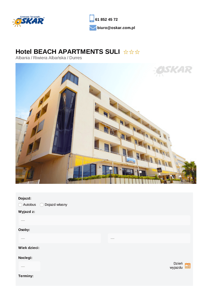 61 852 45 72 [email protected] Hotel BEACH APARTMENTS SULI Albania / Riwiera Albańska / Durres Dojazd: Autobus Dojazd własny Wyjazd z: Osoby: Wiek dzieci: Noclegi: Dzień wyjazdu Terminy: Pokój: Wyżywienie: Najtańsza oferta First Minute cena katalogowa do 7 marca 2017: 1012,20 zł do 7 marca 2017: 1012,20 zł do 6 kwietnia 2017: 2361,80 zł do 6 kwietnia 2017: 2361,80 zł Suma:3374,00 Suma: zł 3374,00 zł Opis oferty Miejscowość Atuty Wycieczki bezpośrednio przy szerokiej piaszczystej plaży fakultatywne ścisłe centrum miejscowości Durres - możliwość zwiedzania miasta bez konieczności dojazdów z Golem/Kavai Opinie aneksy kuchenne z wyposażeniem winda restauracja Rozkład jazdyz tarasem z widokiem na morze Położenie Apartamentowiec w ścisłym centrum turystycznej części miasta Durres, bezpośrednio przy piaszczystej plaży. Na każdy apartament przypada bezpłatny parasol i 2 leżaki. Na parterze budynku restauracja z tarasem widokowym na morze. Zakwaterowanie Apartamentowiec z 2005 roku. Apartament składa się z aneksu kuchennego z pełnym wyposażeniem i lodówka, oraz z sypialni. Klimatyzacja, TV, bezpłatny internet. W każdym łazienka po remoncie w 2016 roku. Sprzątanie i wymiana pościeli i ręczników co 3 dni. Ochrona 24h. Apartamenty na 4 i 5 piętrze. Wszystkie posiadają balkony. Dostępne opcje zakwaterowania pokój 2 osobowy pokój 3 osobowy pokój 4 osobowy Dostępne opcje wyżywienia bez wyżywienia śniadania w formie bufetu w restauracji znajdującej się na parterze budynku z tarasem widokowym na morze (opcja) Pakiet KOMFORT gwarancja wyboru miejsca w autokarze napoje w autokarze w cenie (6 x do wyboru: kawa, herbata, zimny napój 0,2l) cena: 50 zł/os Pakiet PRESTIGE gwarancja wyboru miejsca w autokarze napoje w autokarze w cenie (6 x do wyboru: kawa, herbata, zimny napój 0,2l) pierwszeństwo wejścia na pokład autokaru nadbagaż 5 kg w cenie suchy prowiant na drogę powrotną cena: 100 zł/os Karta Dużej Rodziny www.oskar.com.pl/zalaczniki/karta_duzej_rodziny Warunki promocji FIRST MINUTE www.oskar.com.pl/zalaczniki/warunki_promocji Ubezpieczenie Warunki ubezpieczenia Bezpieczne Podróże Signal Iduna dokument do pobrania www.oskar.com.pl/zalaczniki/owu Warunki ubezpieczenia Kosztów Imprezy Turystycznej Signal Iduna dokument do pobrania www.oskar.com.pl/zalaczniki/owurg Turystyczny Fundusz Gwarancyjny W związku z powołaniem do życia w dniu 26.11.2016 Turystycznego Funduszu Gwarancyjnego każdy klient Biura Podróży Oskar zobowiązany jest do zapłaty kwoty w wysokości 10zł/os. przy każdorazowej rezerwacji imprezy turystycznej (obowiązuje od dnia 26.11.2016). Kwota przeznaczona na Turystyczny Fundusz Gwarancyjny zostanie automatycznie doliczona do wartości rezerwacji (w momencie jej dokonania). Wyjątkiem są imprezy turystyczne odbywające się w krajach posiadających granicę z Rzeczpospolitą Polską. Składka nie jest przychodem biura. Udogodnienia Widok na morze Klimatyzacja Regulowane fotele Tacki Nowoczesna flota Zawodowy kierowca Pasy bezpieczeństwa Toaleta w autokarze Podnóżki Dla rodzin z dziećmi Wi-Fi Lodówka AGD RTV Blisko centrum Życie nocne Bez paszportu Blisko plaży Restauracja hotelowa Region nadmorski Program ramowy Dzień 1 Wyjazd z Polski zgodnie z rozkładem jazdy autokarów. Przejazd przez Czechy, Słowację, Węgry, Serbię, Macedonię. Dzień 2 Przyjazd do Vlory w godzinach południowych. Zakwaterowanie. Spotkanie informacyjne z rezydentem. Dzień 3-10 Pobyt na miejscu, możliwość korzystania z dodatkowych wycieczek fakultatywnych. Dzień 11 Wykwaterowanie do godz. 09.00. Czas wolny. Wyjazd do Polski w godzinach popołudniowych. Dzień 12 Przejazd przez Macedonię, Serbię, Węgry, Słowację, Czechy. Przyjazd do Polski. Orientacyjne godziny powrotu do poszczególnych miast zgodnie z rozkładem jazdy autokarów. Cena obejmuje przejazd autokarem klasy LUX (klimatyzacja, cafe - bar, DVD, WC) zakwaterowanie - 9 noclegów w Hotelu BEACH APARTM ENTS SULI wyżywienie wg wybranej opcji opiekę pilota w czasie podróży opiekę rezydenta na miejscu ubezpieczenie KL 10000 euro, NNW 10000 zł, BP (utrata 500 zł) Cena nie obejmuje Dopłaty wymagane na miejscu opłata klimatyczna - 10 euro/os; dzieci do 12 lat płacą 50% - płatne u pilota w autokarze Dopłaty opcjonalne ubezpieczenie od chorób przewlekłych KL 20000 euro, NNW 10000 zł, bagaż (utarta 500zł ) - dopłata 160 zł/os ubezpieczenie od kosztów rezygnacji- 3,5% wartości rezerwacji Informacje dodatkowe dokumenty: paszport lub dowód osobisty (zgodnie z obowiązującymi przepisami) zaleca się wyrobienie karty EKUZ Chcesz wiedzieć szybciej? Polub nas na facebooku Wycieczki fakultatywne 45 € /os. Riwiera Albanska 30 € /os. Berat - Ardenica Apollonia 28 € /os. Wieczor albanski 35 € /os. 45 € /os. Girjokastra i Blekitne Przelecz Llogara i Oko Zamek Lekursi OSKAR Sp. z o.o. pl.Wolności 2/4c, 61-738 Poznań Potrzebujesz pomocy? Zadzwoń lub napisz: 61 852 45 72 [email protected] Zadzwoń Projekt i wdrożenie: Simply User