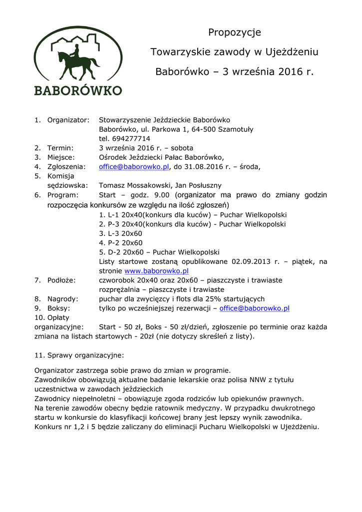 Propozycje Towarzyskie zawody w Ujeżdżeniu Baborówko – 3 września 2016 r. 1. Organizator: 2. 3. 4. 5. Termin: Miejsce: Zgłoszenia: Komisja sędziowska: 6. Program: Stowarzyszenie Jeździeckie Baborówko Baborówko, ul. Parkowa 1, 64-500 Szamotuły tel. 694277714 3 września 2016 r. – sobota Ośrodek Jeździecki Pałac Baborówko, [email protected], do 31.08.2016 r. – środa, Tomasz Mossakowski, Jan Posłuszny Start – godz. 9.00 (organizator ma prawo do zmiany godzin rozpoczęcia konkursów ze względu na ilość zgłoszeń) 7. Podłoże: 1. L-1 20x40(konkurs dla kuców) – Puchar Wielkopolski 2. P-3 20x40(konkurs dla kuców) - Puchar Wielkopolski 3. L-3 20x60 4. P-2 20x60 5. D-2 20x60 – Puchar Wielkopolski Listy startowe zostaną opublikowane 02.09.2013 r. – piątek, na stronie www.baborowko.pl czworobok 20x40 oraz 20x60 – piaszczyste i trawiaste rozprężalnia – piaszczyste i trawiaste puchar dla zwycięzcy i flots dla 25% startujących tylko po wcześniejszej rezerwacji – [email protected] 8. Nagrody: 9. Boksy: 10. Opłaty organizacyjne: Start - 50 zł, Boks - 50 zł/dzień, zgłoszenie po terminie oraz każda zmiana na listach startowych - 20zł (nie dotyczy skreśleń z listy). 11. Sprawy organizacyjne: Organizator zastrzega sobie prawo do zmian w programie. Zawodników obowiązują aktualne badanie lekarskie oraz polisa NNW z tytułu uczestnictwa w zawodach jeździeckich Zawodnicy niepełnoletni – obowiązuje zgoda rodziców lub opiekunów prawnych. Na terenie zawodów obecny będzie ratownik medyczny. W przypadku dwukrotnego startu w konkursie do klasyfikacji końcowej brany jest lepszy wynik zawodnika. Konkurs nr 1,2 i 5 będzie zaliczany do eliminacji Pucharu Wielkopolski w Ujeżdżeniu. Organizator nie odpowiada za wypadki, szkody i kradzieże powstałe w trakcie zawodów i transportu. Organizator nie ponosi żadnej odpowiedzialności w razie wypadków i zachorowań trenera, zawodników, luzaków i koni, jak również w przypadku kradzieży, zniszczeń, pożarów i innych wydarzeń. Zawodnicy i właściciele odpowiadają osobiście za szkody w stosunku do osób trzecich, spowodowane przez nich samych, ich pracowników lub ich konie. Dlatego zalecane jest zawarcie stosownego pełnego ubezpieczenia na czas udziału w zawodach. Kodeks Postępowania z Koniem 1. Polski Związek Jeździecki w ślad za Międzynarodową Federacją Jeździecką FEI oczekuje, że wszystkie osoby zaangażowane w jakikolwiek sposób w sporty konne, będą przestrzegać zasad niniejszego Kodeksu Postępowania z Koniem oraz przyjmą do wiadomości, że w każdym przypadku dobro konia musi być sprawą nadrzędną i nigdy nie może być podporządkowane współzawodnictwu sportowemu ani celom komercyjnym. 2. Na wszystkich etapach treningu i przygotowań konia do startu w zawodach, dobro konia musi stać ponad wszelkimi innymi wymaganiami. Dotyczy to stałej opieki, metod treningu, starannego obrządku, kucia i transportu. 3. Konie i jeźdźcy muszą być wytrenowani, kompetentni i zdrowi zanim wezmą udział w zawodach. Odnosi się to także do podawania leków i środków medycznych, zabiegów chirurgicznych zagrażających dobru konia lub ciąży klaczy, oraz do przypadków nadużywania pomocy medycznej. 4. Zawody nie mogą zagrażać dobru konia. Wymaga to zwrócenia szczególnej uwagi na teren zawodów, powierzchnię podłoża, pogodę, warunki stajenne, kondycję koni i ich bezpieczeństwo także podczas podróży powrotnej z zawodów. 5. Należy dołożyć wszelkich starań, aby zapewnić koniom staranną opiekę po zakończeniu zawodów, a także humanitarne traktowanie po zakończeniu kariery sportowej. Dotyczy to właściwej opieki weterynaryjnej obrażeń odniesionych na zawodach, spokojnej starości, ewentualnie eutanazji. PZJ zachęca wszystkie osoby działające w sporcie jeździeckim do stałego podnoszenia swojej wiedzy oraz umiejętności dotyczących wszelkich aspektów współpracy z koniem. Propozycje zatwierdzone przez WZJ w dniu 19.08.2016 Stanisław Helak