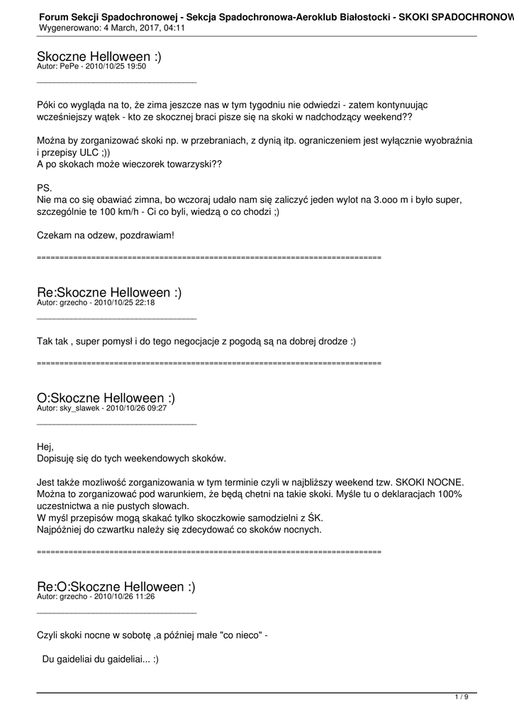 Forum Sekcji Spadochronowej - Sekcja Spadochronowa-Aeroklub Białostocki - SKOKI SPADOCHRONOW Wygenerowano: 4 March, 2017, 04:11 Skoczne Helloween :) Autor: PePe - 2010/10/25 19:50 _____________________________________ Póki co wygląda na to, że zima jeszcze nas w tym tygodniu nie odwiedzi - zatem kontynuując wcześniejszy wątek - kto ze skocznej braci pisze się na skoki w nadchodzący weekend?? Można by zorganizować skoki np. w przebraniach, z dynią itp. ograniczeniem jest wyłącznie wyobraźnia i przepisy ULC ;)) A po skokach może wieczorek towarzyski?? PS. Nie ma co się obawiać zimna, bo wczoraj udało nam się zaliczyć jeden wylot na 3.ooo m i było super, szczególnie te 100 km/h - Ci co byli, wiedzą o co chodzi ;) Czekam na odzew, pozdrawiam! ============================================================================ Re:Skoczne Helloween :) Autor: grzecho - 2010/10/25 22:18 _____________________________________ Tak tak , super pomysł i do tego negocjacje z pogodą są na dobrej drodze :) ============================================================================ O:Skoczne Helloween :) Autor: sky_slawek - 2010/10/26 09:27 _____________________________________ Hej, Dopisuję się do tych weekendowych skoków. Jest także mozliwość zorganizowania w tym terminie czyli w najbliższy weekend tzw. SKOKI NOCNE. Można to zorganizować pod warunkiem, że będą chetni na takie skoki. Myśle tu o deklaracjach 100% uczestnictwa a nie pustych słowach. W myśl przepisów mogą skakać tylko skoczkowie samodzielni z ŚK. Najpóżniej do czwartku należy się zdecydować co skoków nocnych. ============================================================================ Re:O:Skoczne Helloween :) Autor: grzecho - 2010/10/26 11:26 _____________________________________ Czyli skoki nocne w sobotę ,a później małe "co nieco" Du gaideliai du gaideliai... :) 1/9 Forum Sekcji Spadochronowej - Sekcja Spadochronowa-Aeroklub Białostocki - SKOKI SPADOCHRONOW Wygenerowano: 4 March, 2017, 04:11 ============================================================================ Re:O:Skoczne Helloween :) Autor: Marynarz - 2010/10/26 15:13 _____________________________________ Przybywam do Białego w sobotę po południu, więc od tego czasu piszę się na wyloty, w tym nocne :woohoo: ============================================================================ Re:Skoczne Helloween :) Autor: PePe - 2010/10/26 18:13 _____________________________________ Spoko, to jest nas już w sumie czterech ;) A co z resztą towarzystwa???? ============================================================================ Re:Skoczne Helloween :) Autor: kamyk - 2010/10/26 19:24 _____________________________________ Pozwole sobie jako poprosic zdjęcia z tego inventu: o takiego typu o: http://viewat.org/?i=pl&id_pn=7508&or=vt&pag=2&sec=pn&subsec=rc Będa wykorzystane w celach instruktarzowych,dla laików. W podpise FlyLaik ; ============================================================================ Re:Skoczne Helloween :) Autor: Rafcio - 2010/10/26 20:43 _____________________________________ piszę się na wszelkiego rodzaju skoki w weekend, a w szczególności nocne :) ============================================================================ Re:Skoczne Helloween :) Autor: Kejt - 2010/10/26 21:12 _____________________________________ Ja też się piszę na skoki - dzienne i nocne (o ile będę miała dobry sprzęt:P). 2/9 Forum Sekcji Spadochronowej - Sekcja Spadochronowa-Aeroklub Białostocki - SKOKI SPADOCHRONOW Wygenerowano: 4 March, 2017, 04:11 ============================================================================ Re:Skoczne Helloween :) Autor: Skybabe - 2010/10/27 10:12 _____________________________________ Ja to nie rozumiem czemu wcześniej nie było takiej mobilizacji i nikt nie wpadł na to żeby zorganizować skoki nocne tylko wtedy kiedy temperatura za tyłek ściska, zapasy się kończą albo się dawno skończyły i grypa człowieka dopada? ============================================================================ Re:Skoczne Helloween :) Autor: grzecho - 2010/10/27 11:13 _____________________________________ Nie marudź , dawaj na skoki :) weekend będzie ciepły z delikatnym wiaterkiem ... bajka :) ============================================================================ Re:Skoczne Helloween :) Autor: PePe - 2010/10/27 11:15 _____________________________________ Wiadomość z ostatniej chwili: Skoki nocne (planowane w ten weekend) zostały niestety odwołane z uwagi na problemy z samolotem, który na chwilę obecną nie może jeszcze odbywać takich lotów. Może w innym terminie się uda, jeśli tylko pogoda pozwoli ;) Co do skoków dziennych sprawa jest nadal otwarta, ale dokładne informacje będą zamieszczone do piątku… Z innej beczki: Udało się zarezerwować na sobotni wieczór salę kominkową, więc impreza Halloweenowa jest jak najbardziej aktualna. Może zostało trochę mało czasu, ale jak to mówią „dla chcącego nic trudnego” :) Wszelkie sugestie i inicjatywa w sprawie ewentualnego przygotowania sali pod kątem odpowiedniego wystroju, czy też przebrań uczestników imprezy – mile widziane. Co do sali, to myślę, że wszystko zdążymy przygotować w sobotę z rana, bo wcześniej to nie wiem, czy ktoś da radę i miałby chęci, co?? Macie jakieś propozycje co do sprzętu grającego i muzyki? Proponuję ustalić jakąś zrzutkę na żarełko, a ze swojej strony zobowiązuję się przynieść jakieś (przed)urodzinowe ciacho i alkohol ;))) Proszę o odzew i do usłyszenia… PePe ============================================================================ Re:Skoczne Helloween :) 3/9 Forum Sekcji Spadochronowej - Sekcja Spadochronowa-Aeroklub Białostocki - SKOKI SPADOCHRONOW Wygenerowano: 4 March, 2017, 04:11 Autor: Kejt - 2010/10/27 19:22 _____________________________________ A więc skaczemy w sobotę? czy w niedzielę też? Co do Halloween: muzyka - najlepiej lapto